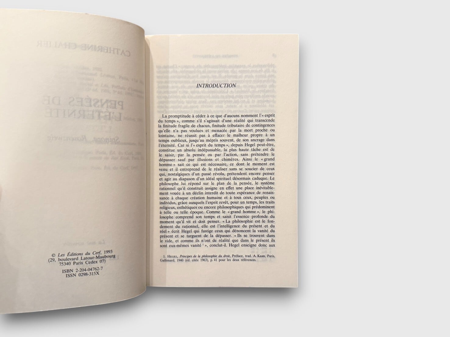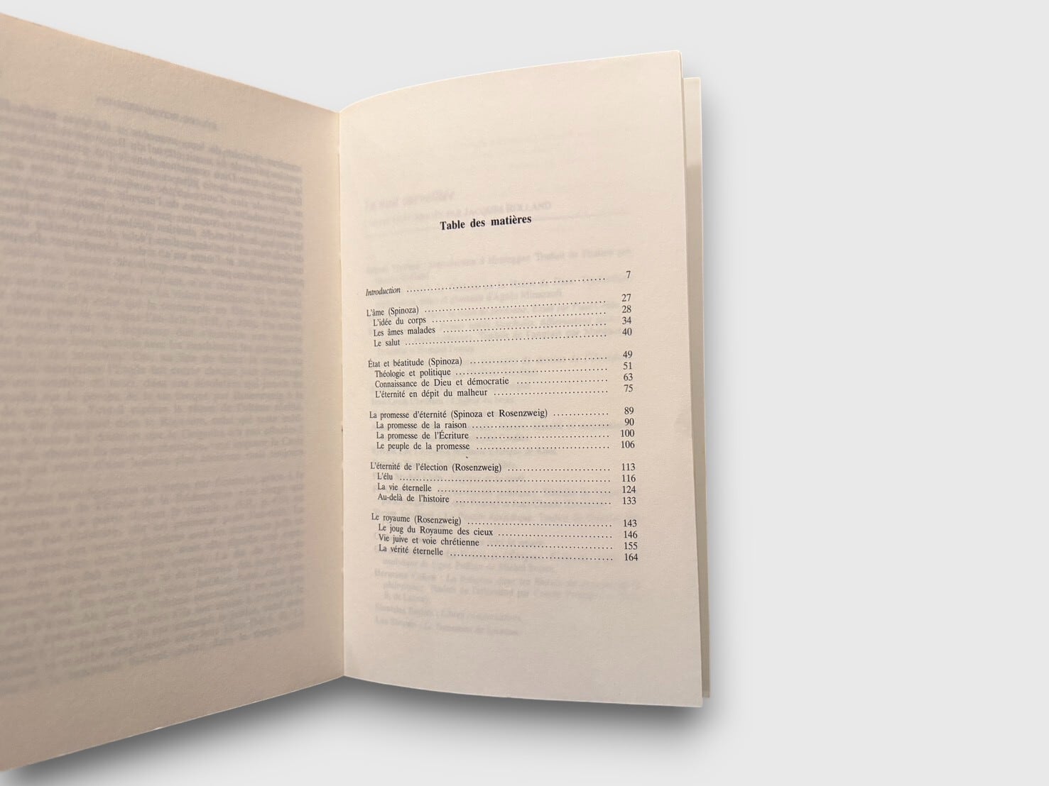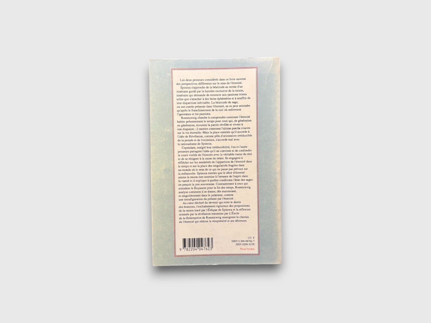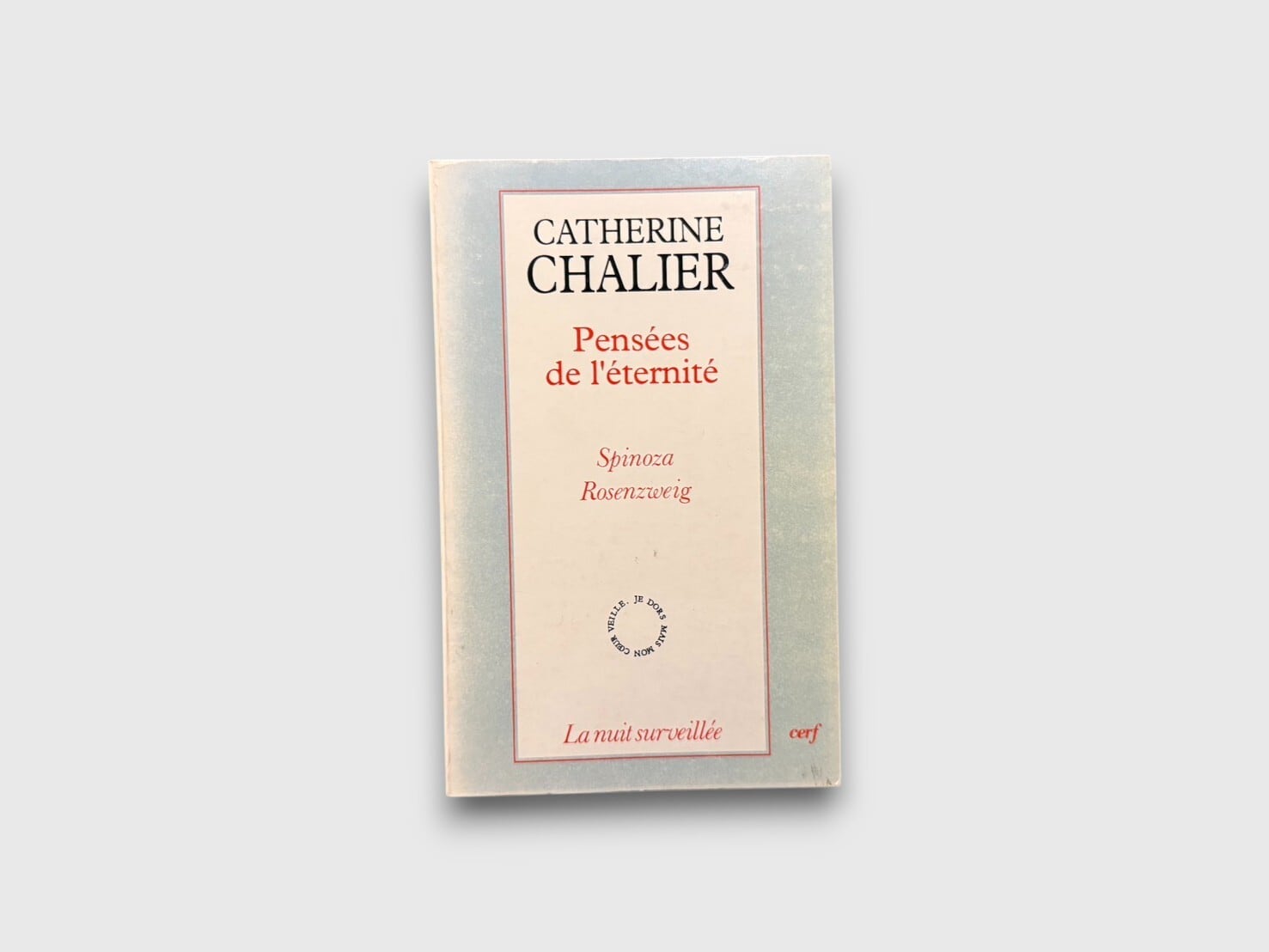 フランスの哲学者、カトリーヌ・シャリエによるスピノザとフランツ・ローゼンツヴァイクの思想をめぐる考察書。「永遠」という主題を軸に、理性・時間・選び・救済といった概念を両思想家のテクストに即して検討、スピノザの至福や神の認識の問題、ローゼンツヴァイクにおける歴史と永遠の王国の問題が対照的に扱われている。シリーズ「La nuit surveillée」に属する一冊。