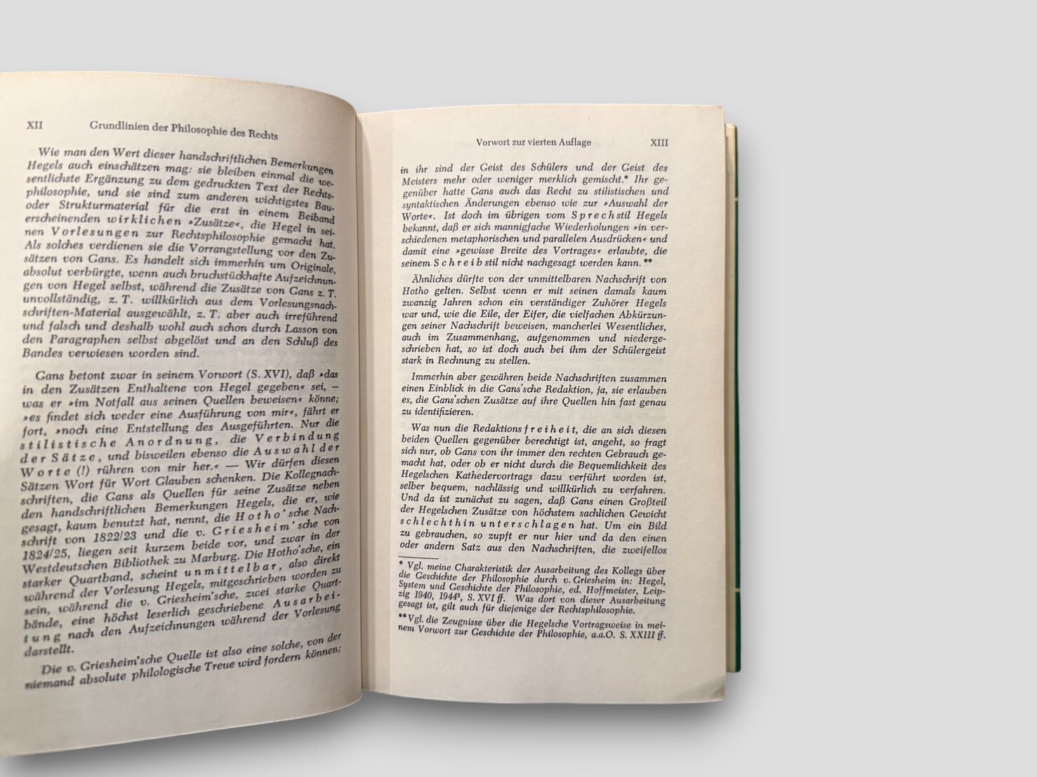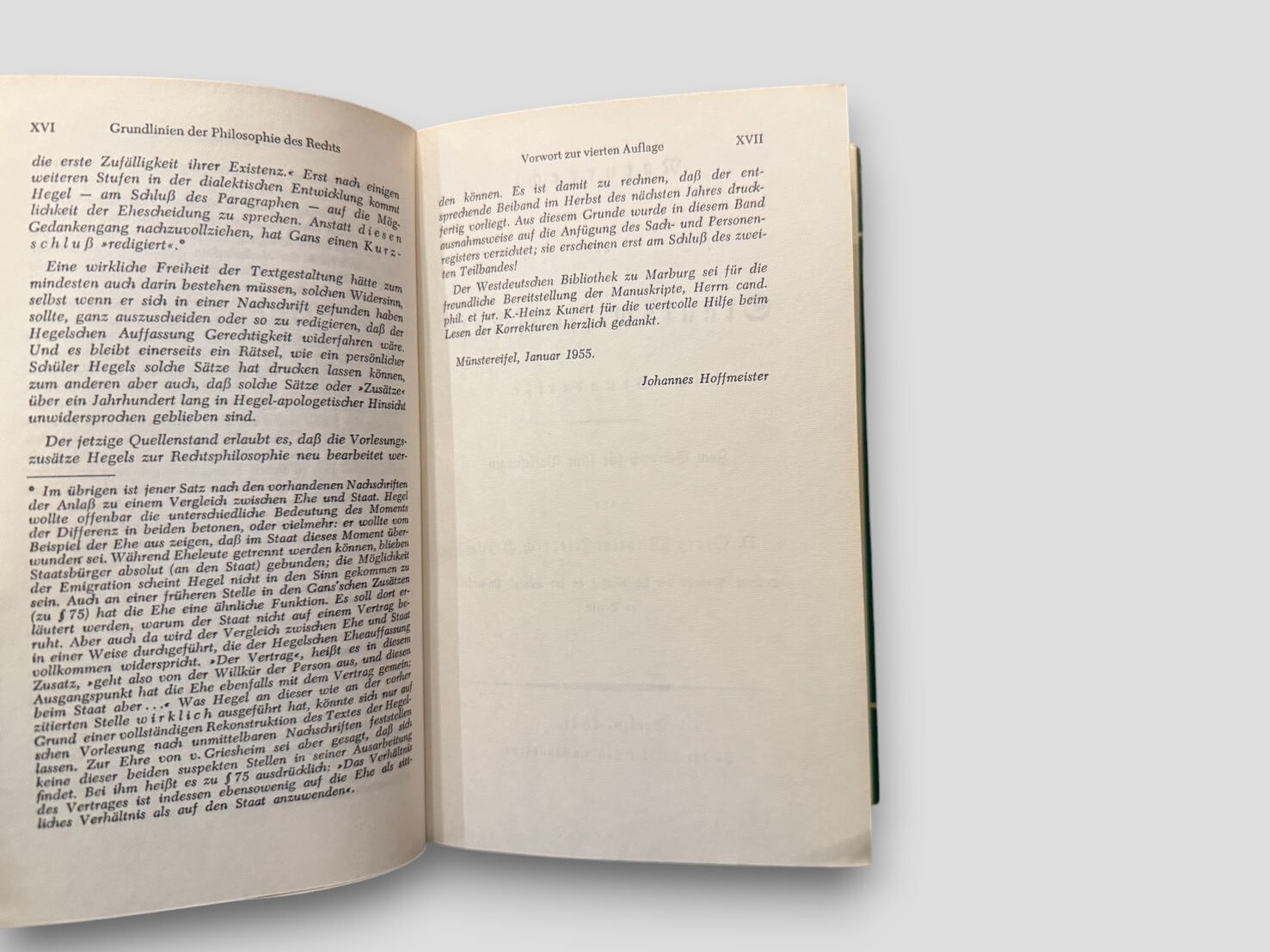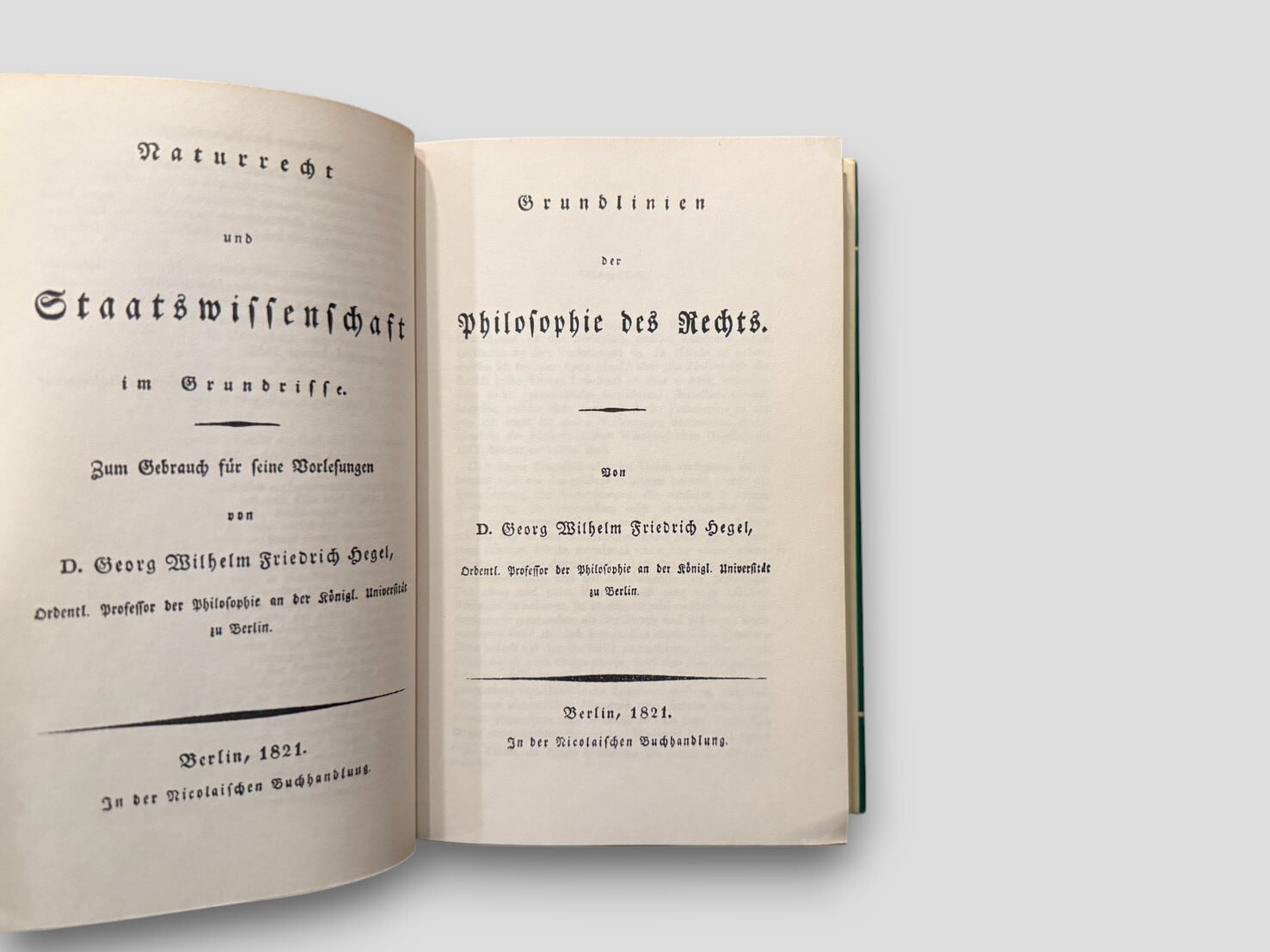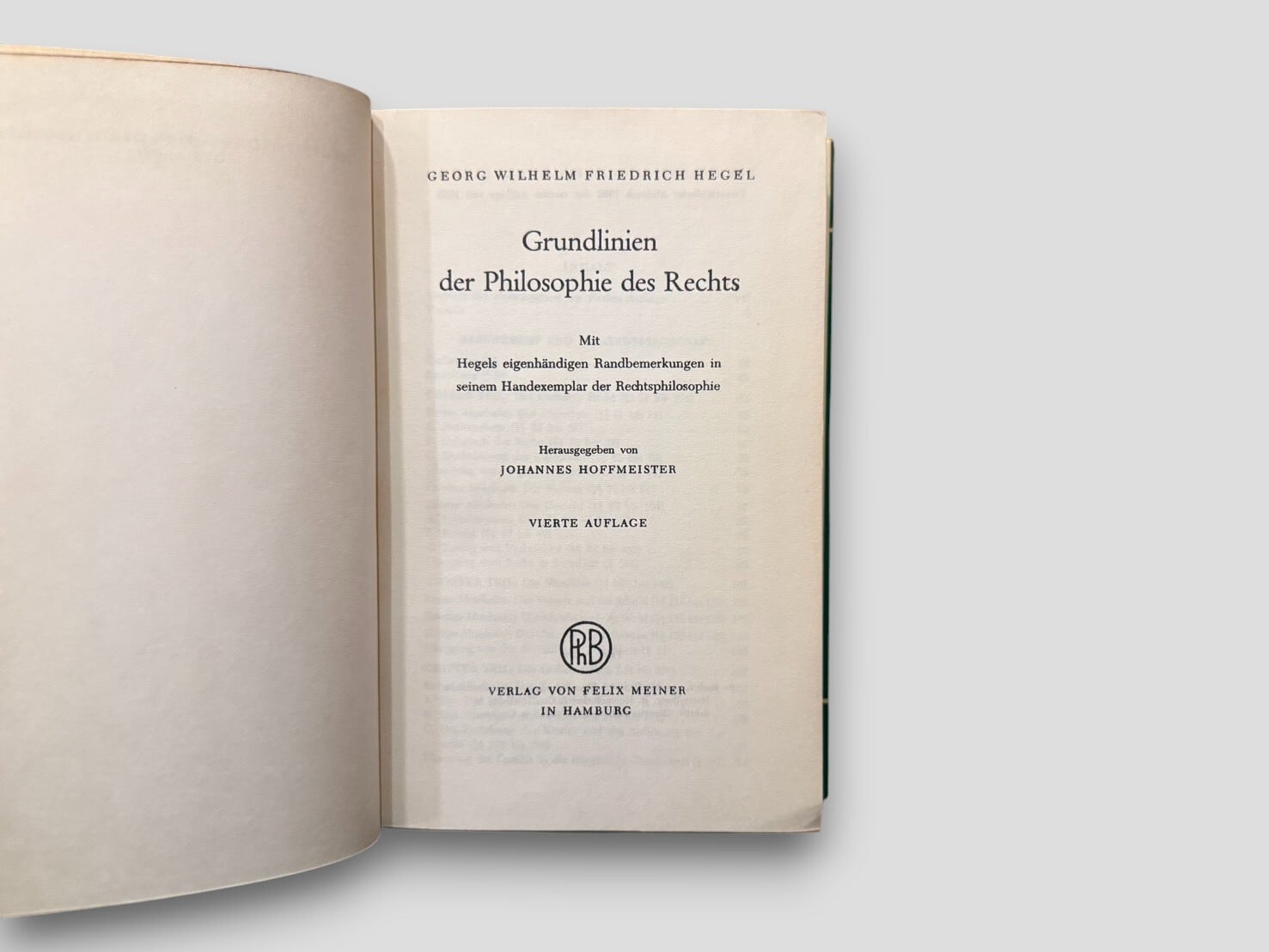ヘーゲル『法の哲学』のテキストに、ヘーゲル自身の手沢本に残された自筆欄外注を併録した学術版。編者はJohannes Hoffmeister。抽象法、道徳性、倫理的共同体(Sittlichkeit)を体系的に展開し、家族、市民社会、国家へと至る精神の客観的展開を論じる。近代国家論の古典であり、政治哲学および法哲学の基本文献である。自筆注記を含む構成は、講義との関連や思想形成の過程を読み解くうえで重要な資料的価値を持つといえるだろう。