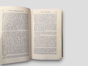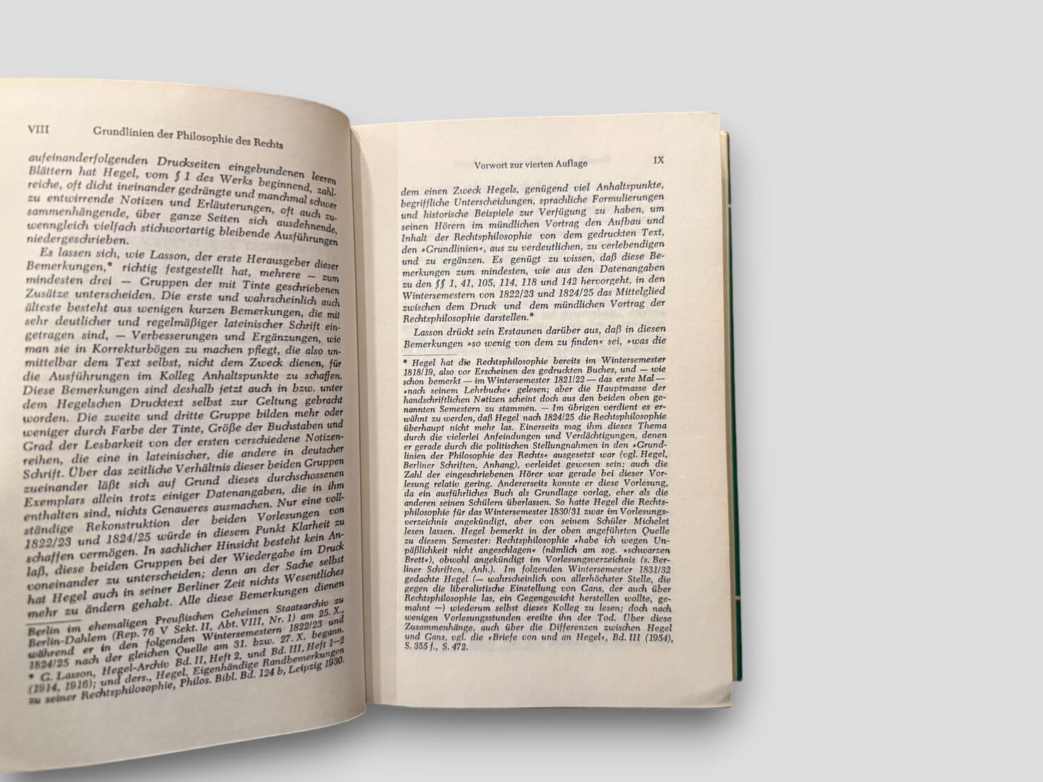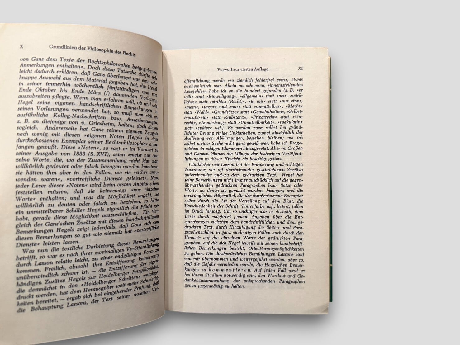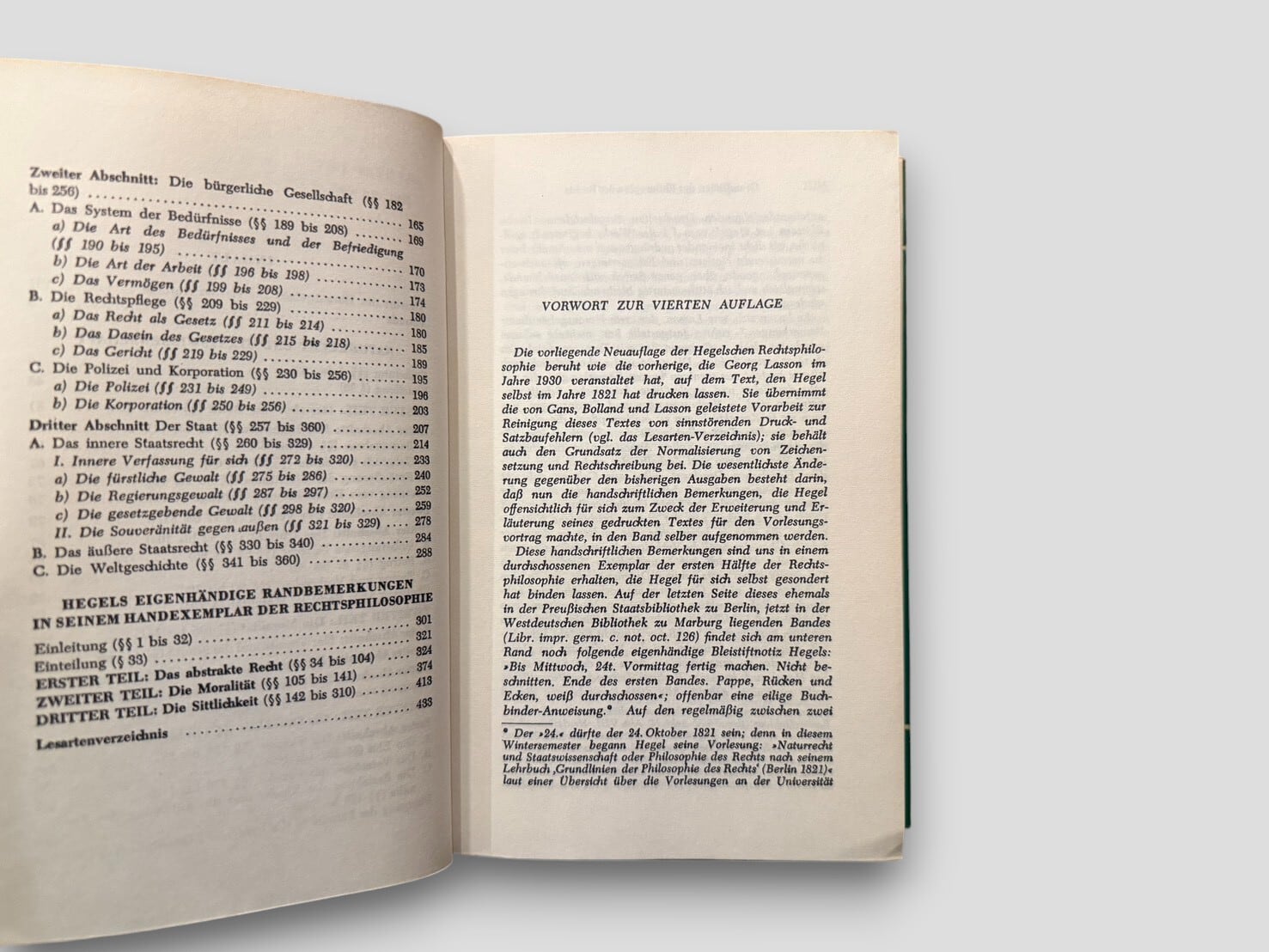 ヘーゲル『法の哲学』のテキストに、ヘーゲル自身の手沢本に残された自筆欄外注を併録した学術版。編者はJohannes Hoffmeister。抽象法、道徳性、倫理的共同体(Sittlichkeit)を体系的に展開し、家族、市民社会、国家へと至る精神の客観的展開を論じる。近代国家論の古典であり、政治哲学および法哲学の基本文献である。自筆注記を含む構成は、講義との関連や思想形成の過程を読み解くうえで重要な資料的価値を持つといえるだろう。