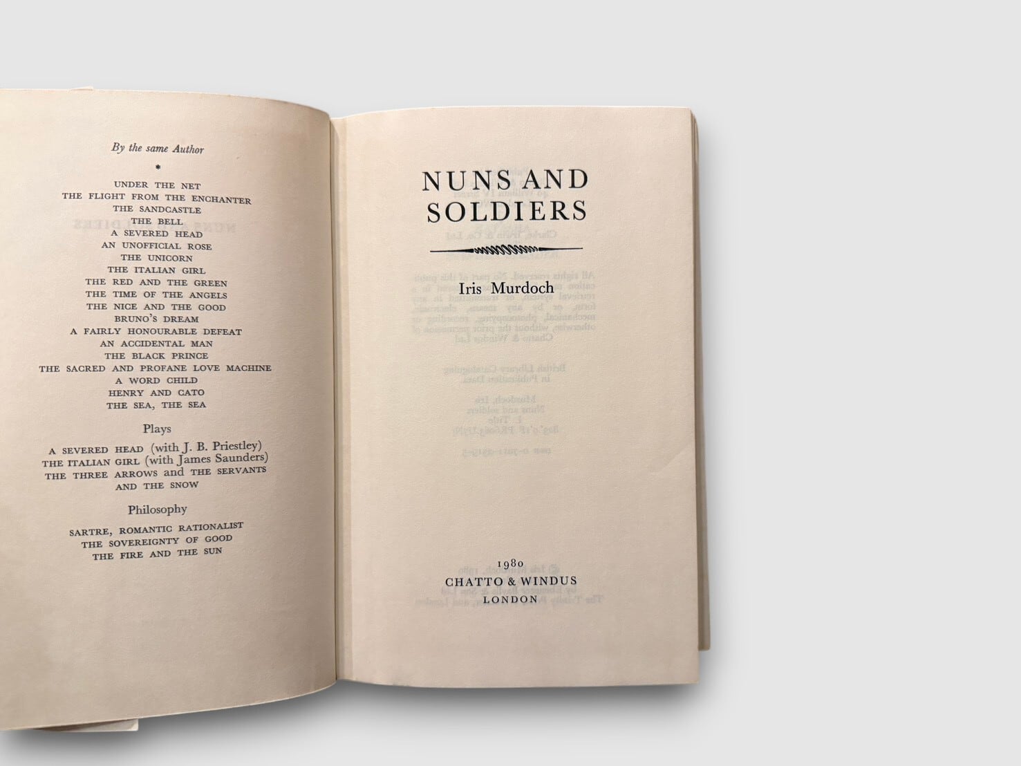 未亡人アンと元兵士ティムを中心に、信仰、欲望、知性、階級意識が絡み合う人間関係を描く。タイトルが示すとおり「尼僧」と「兵士」は象徴的存在であり、精神性と世俗、理想と現実の緊張が物語の基盤となる。作中にはウィトゲンシュタインへの言及もあり、マードック特有の哲学的背景が自然に織り込まれている。本書は物語でありながら、善とは何か、自由とは何かという問いを静かに提示する作品である。1980年刊行英国初版。