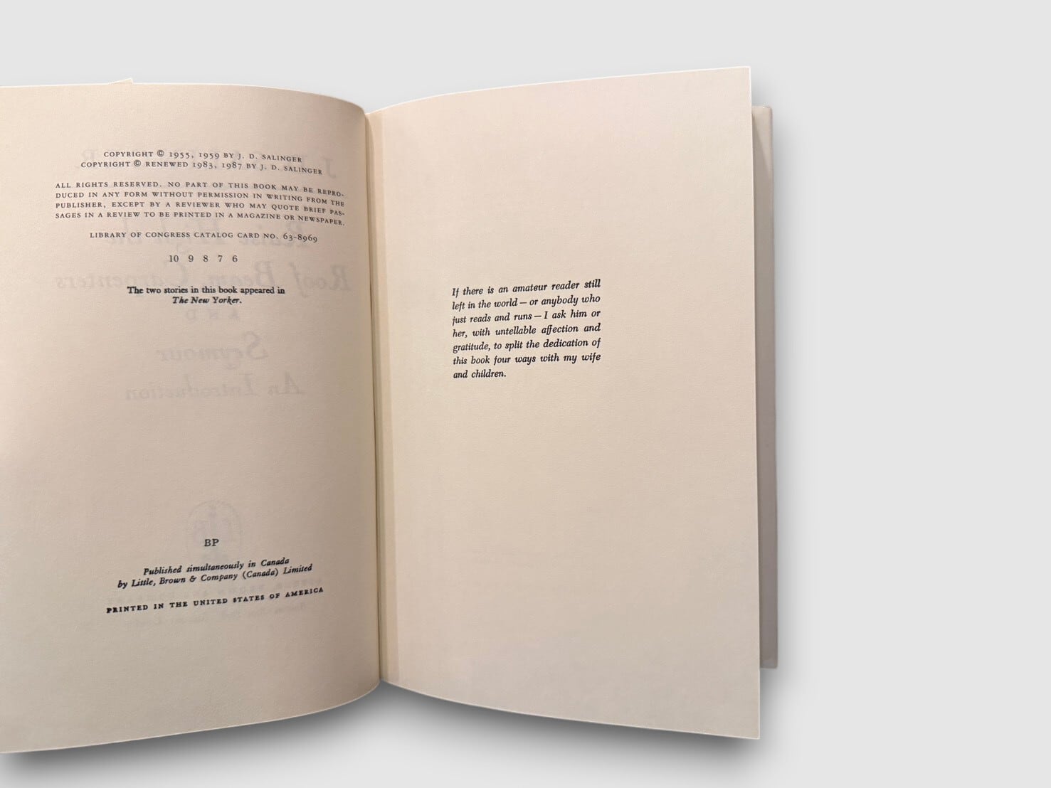 1963年にJ. D. サリンジャーrによって刊行された中編2作を収める一冊。「Raise High the Roof Beam, Carpenters」(1955年)および「Seymour: An Introduction」(1959年)は、ともに『The New Yorker』誌に発表された、Glass家シリーズに属する重要作として位置づけられる作品集である。本書はLittle, Brown and CompanyによるISBN付き後年再版ハードカバー。