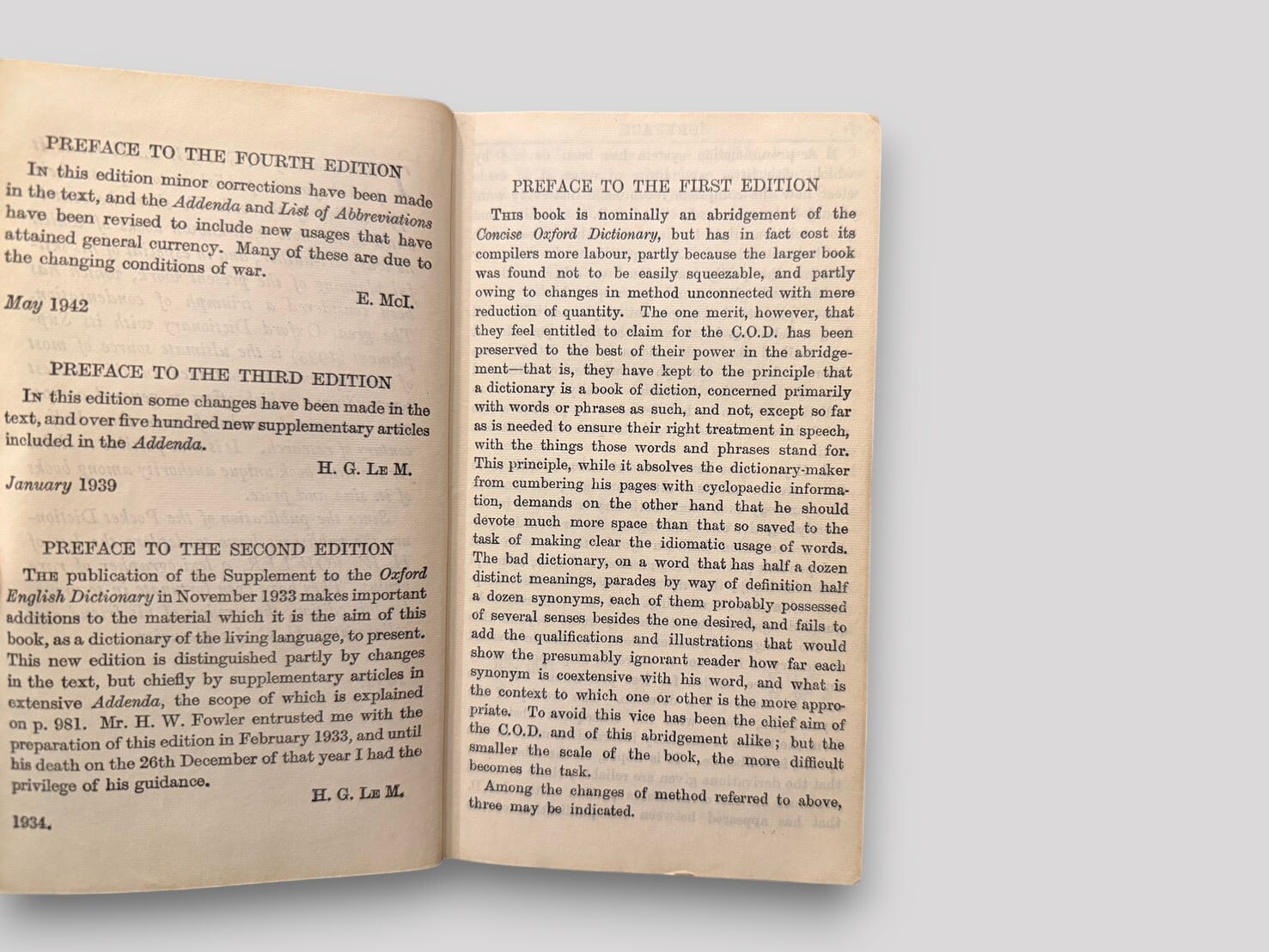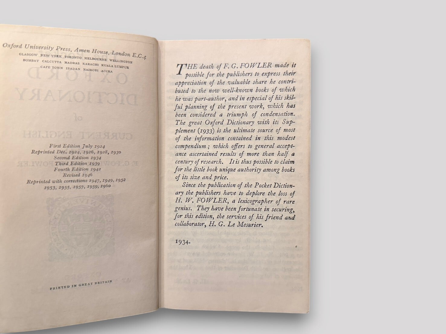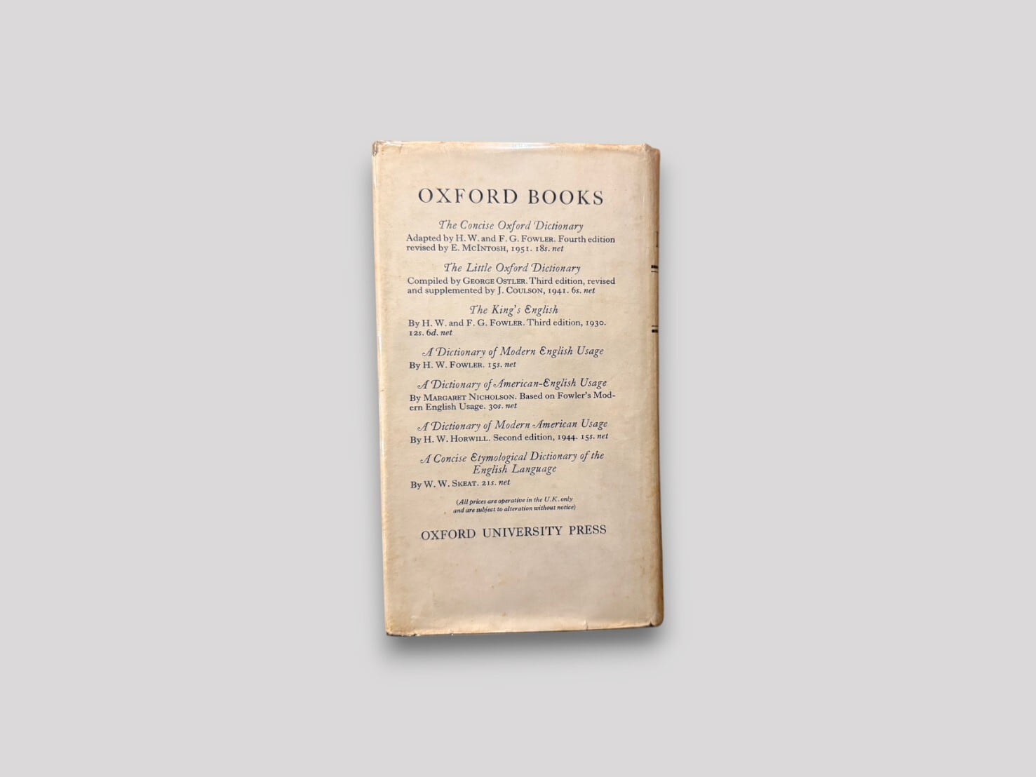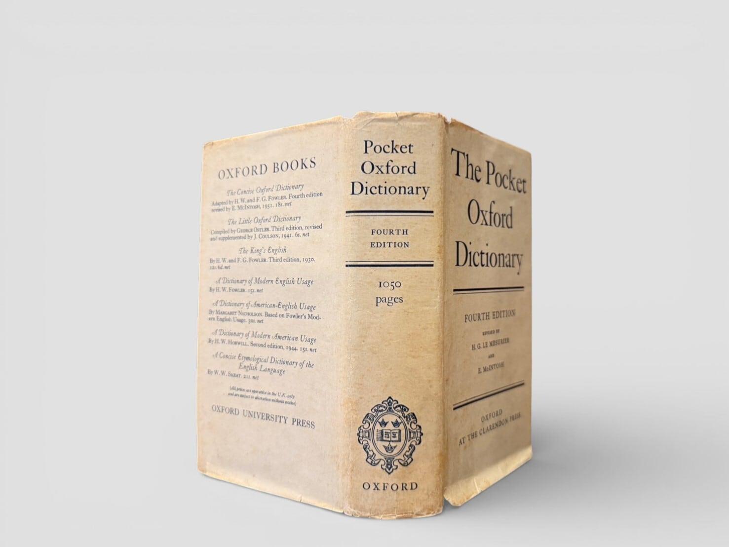 英語使用の整理者として知られ、『Modern English Usage』と並び、20世紀英語の規範形成に大きな影響を与えたFowler兄弟による簡潔な英語辞典。1924年初版刊行後、改訂を重ね、20世紀前半の標準的英語使用を示す実用辞書として広く用いられた。本書は第四版(1942年刊行)系統で、1946年改訂を経た後、1960年に再版された個体。