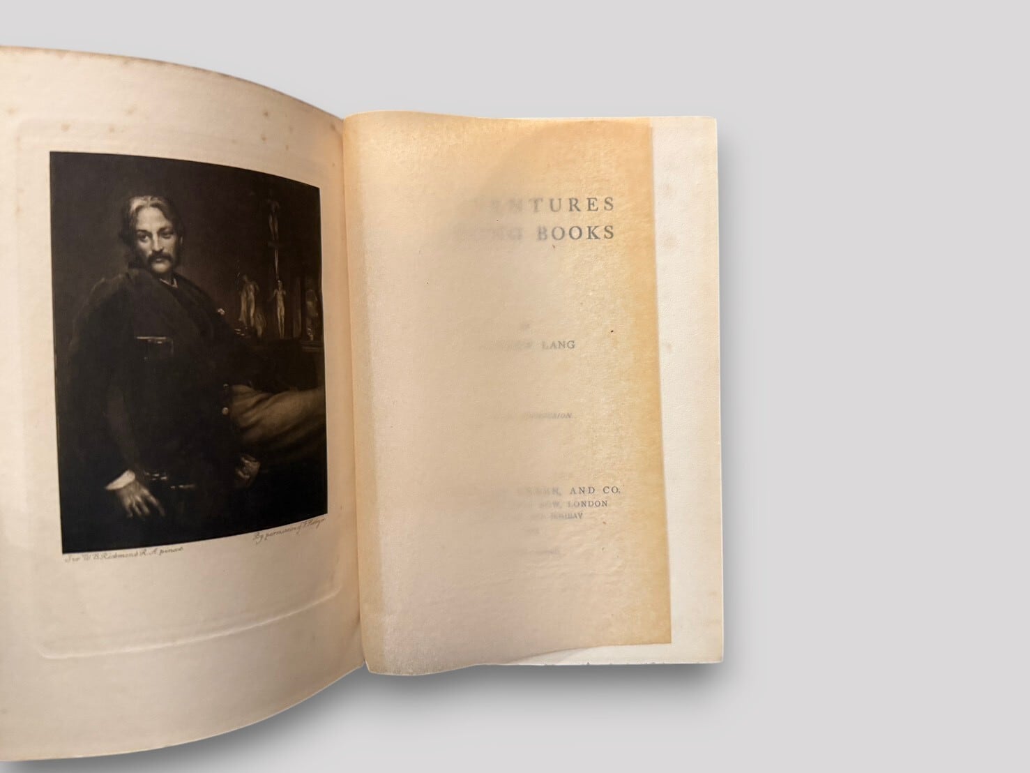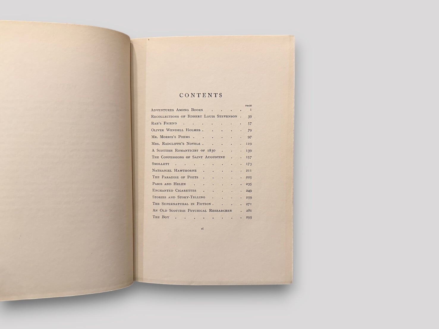 19世紀末から20世紀初頭にかけて活躍したスコットランドの文学者 Andrew Lang による書物随筆集。Stevenson、Hawthorne、Radcliffe などを取り上げ、文学と読書の愉しみを語る評論集となっている。初版は1902年。本書は1905年刊の Second Impression。巻頭には Sir W. B. Richmond の肖像フロントピースを収録。ヴィクトリア朝からエドワード朝へ移る時代の知的空気がそのまま封じ込められている一冊。