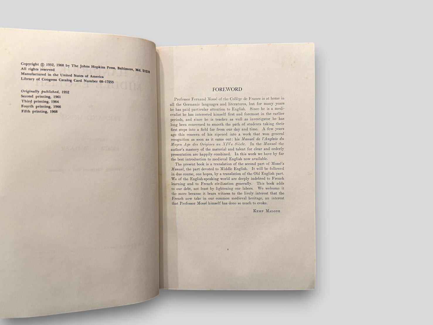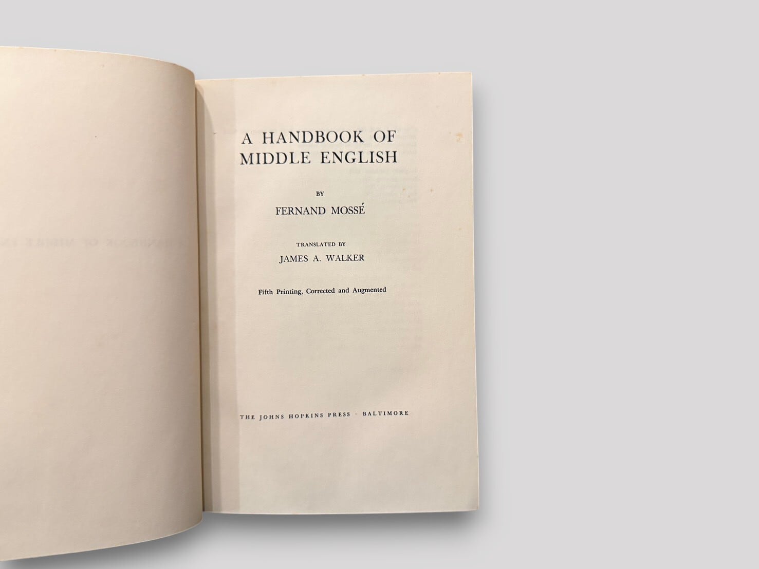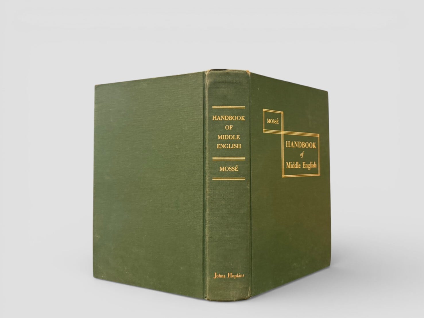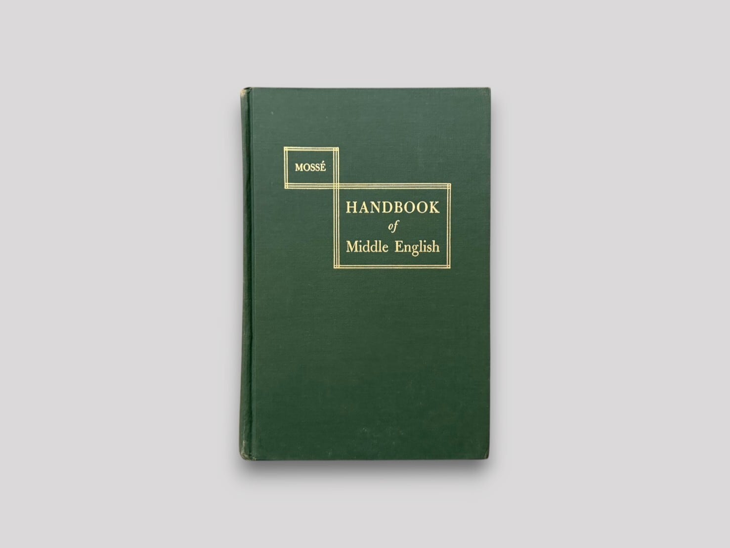 フランスの中英語研究者フェルナン・モッセによる、中英語文法の体系的手引書。本書は1952年に刊行された英語版の1968年第五刷(修正増補版)。文法項目の抽象的整理にとどまらず、実際のテキスト読解を通じて中英語の構造を理解させる設計である点に特色がある。文献学的訓練を前提とするが、単なる参考書ではなく、歴史的英語の変化を実証的に辿るための基礎文献である。