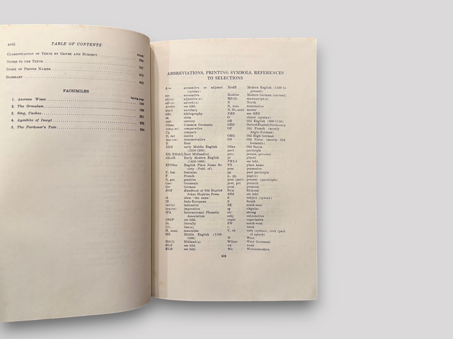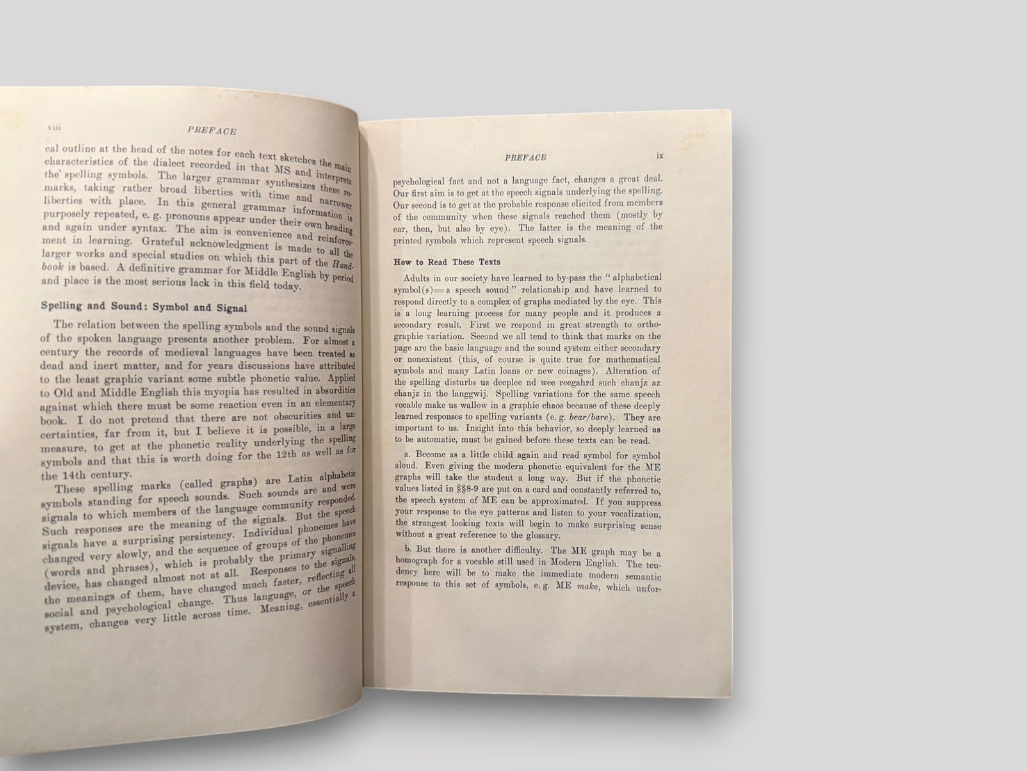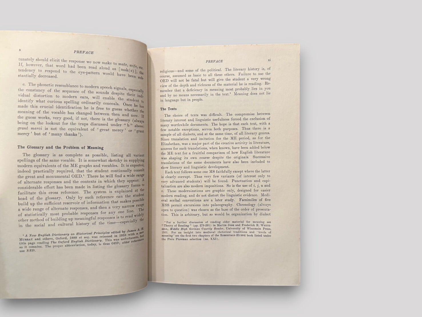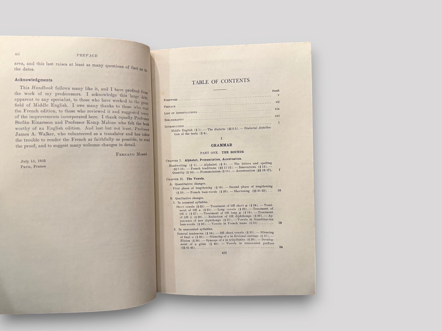 フランスの中英語研究者フェルナン・モッセによる、中英語文法の体系的手引書。本書は1952年に刊行された英語版の1968年第五刷(修正増補版)。文法項目の抽象的整理にとどまらず、実際のテキスト読解を通じて中英語の構造を理解させる設計である点に特色がある。文献学的訓練を前提とするが、単なる参考書ではなく、歴史的英語の変化を実証的に辿るための基礎文献である。