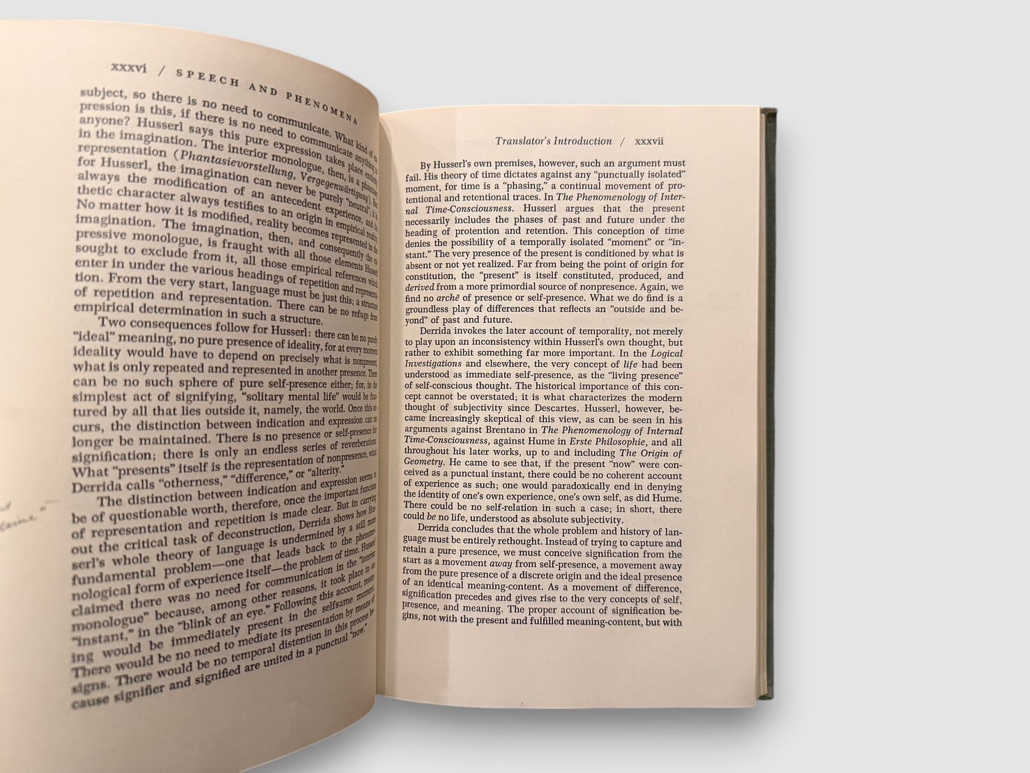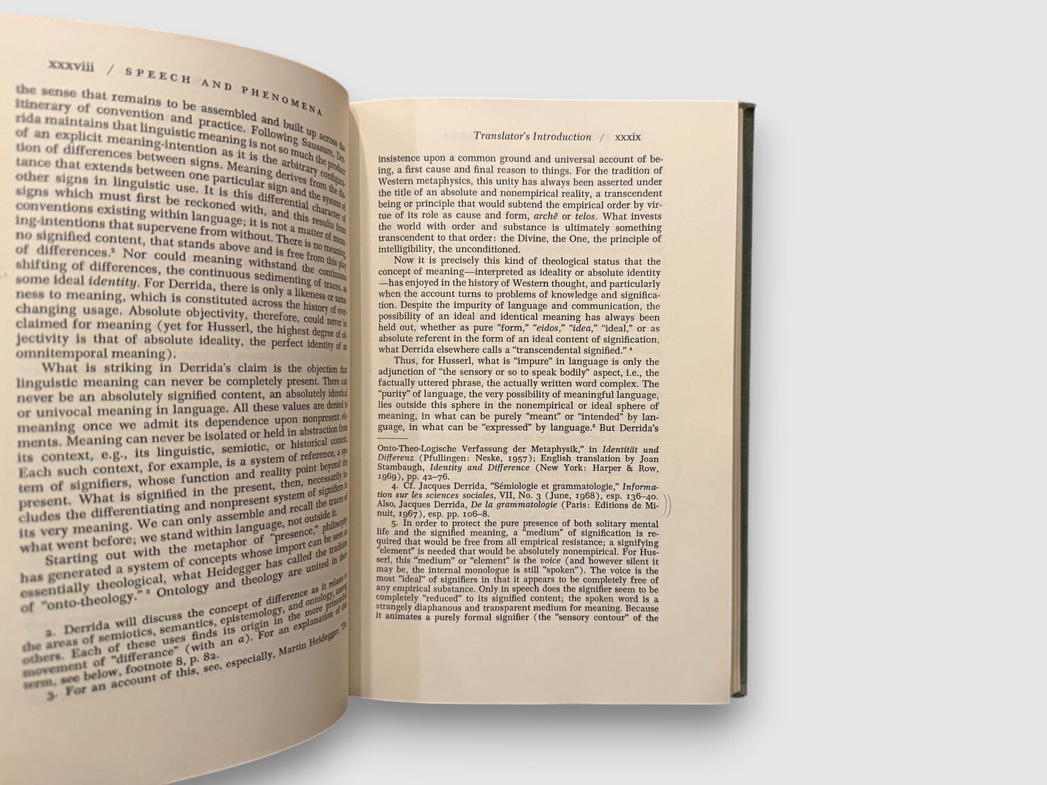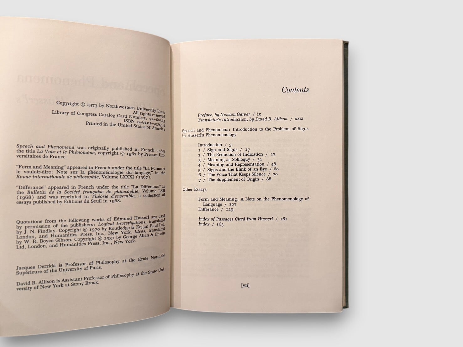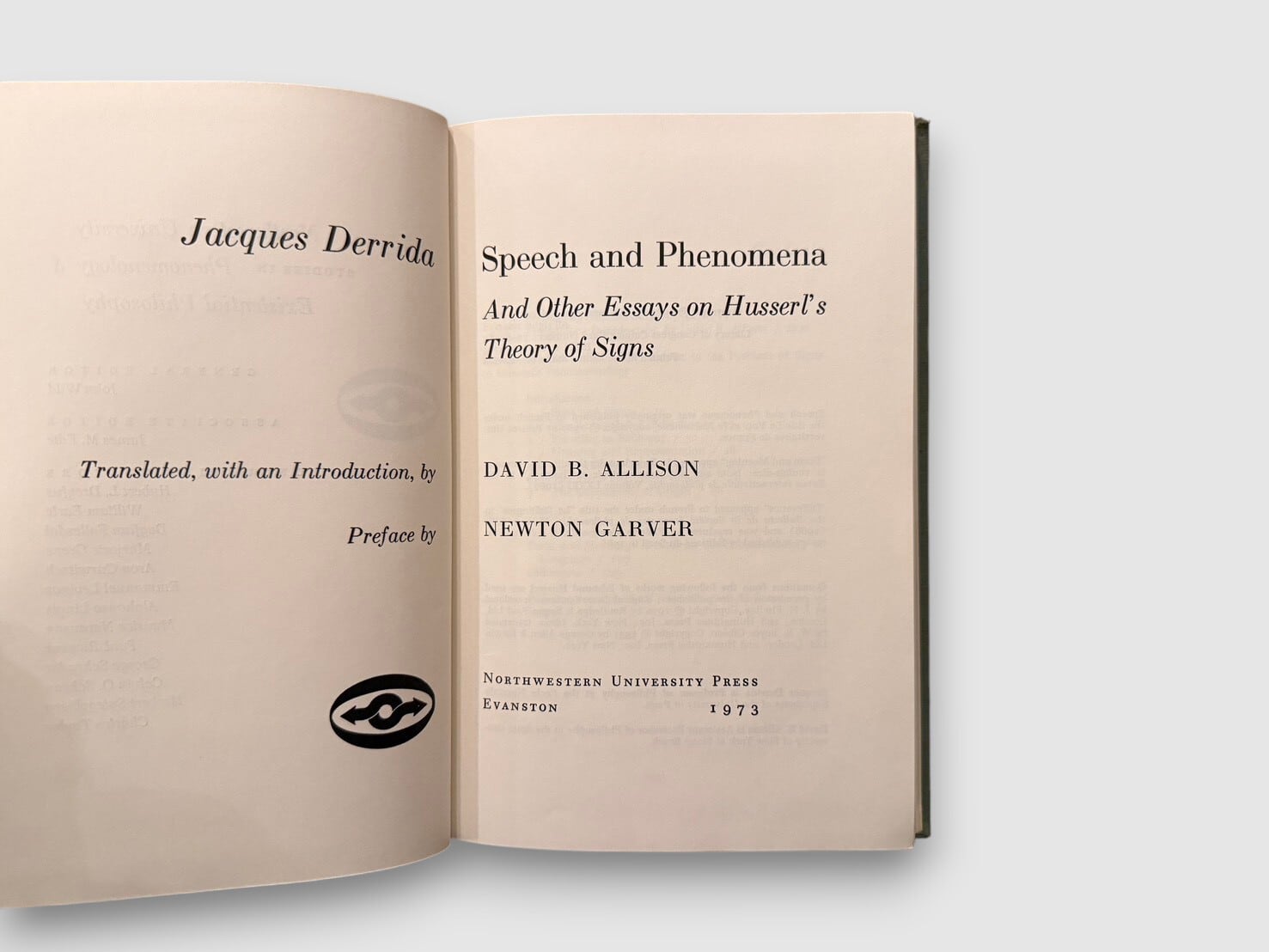 フランスの哲学者ジャック・デリダによる、フッサール現象学を扱った初期著作の英語版初版(原著 La Voix et le Phénomène)。フッサールの記号論および意味理論を精読し、「声」「現前」「意味」「差延」の問題を検討する。