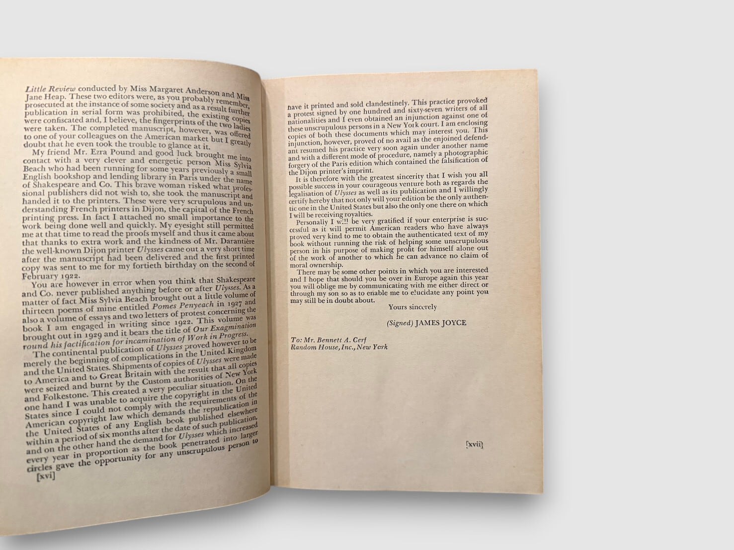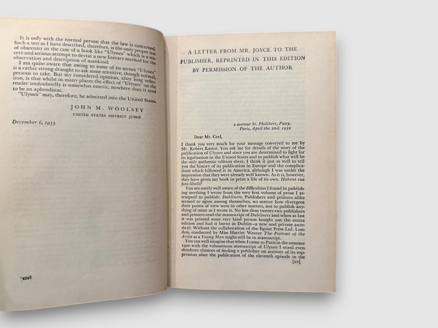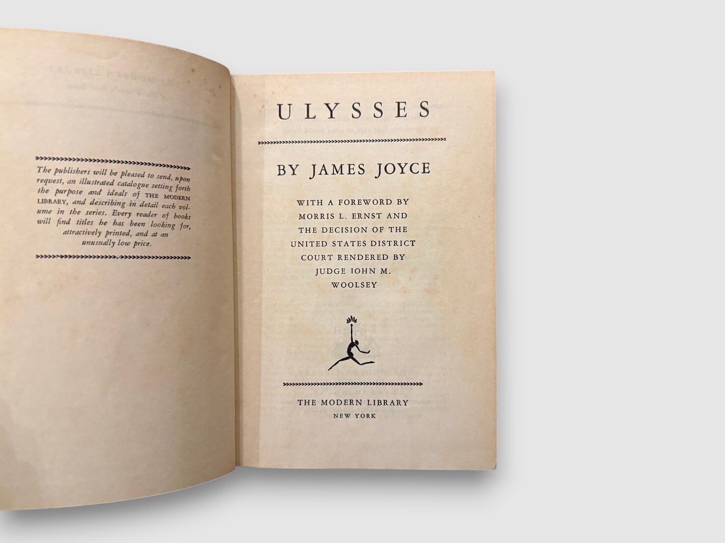 20世紀文学の転換点とされるアイルランドの作家ジェームス・ジョイスによる長編小説。1922年パリで刊行された初版は、英米で長く発禁扱いとなった。舞台は1904年6月16日のダブリン。レオポルド・ブルームの一日を軸に、意識の流れ技法を用いて都市と精神内部を描く構成をとる。20世紀小説の方法論を決定的に更新した作品として、文学史上繰り返し参照されてきた。本書は、1933年12月6日付の米国連邦地方裁判所判事 John M. Woolsey による判決を経て刊行された、The Modern Library版。奥付にはCopyright 1942, 1946(Nora Joseph Joyce)の記載があり、戦後期の再刷と判断される。