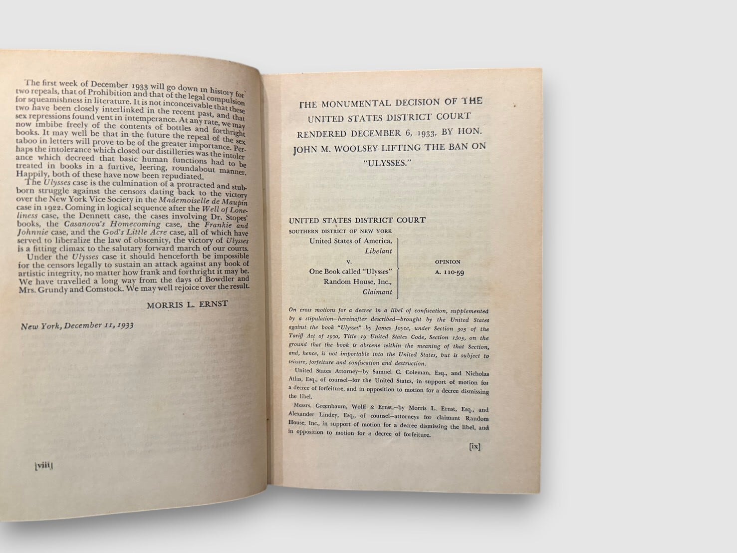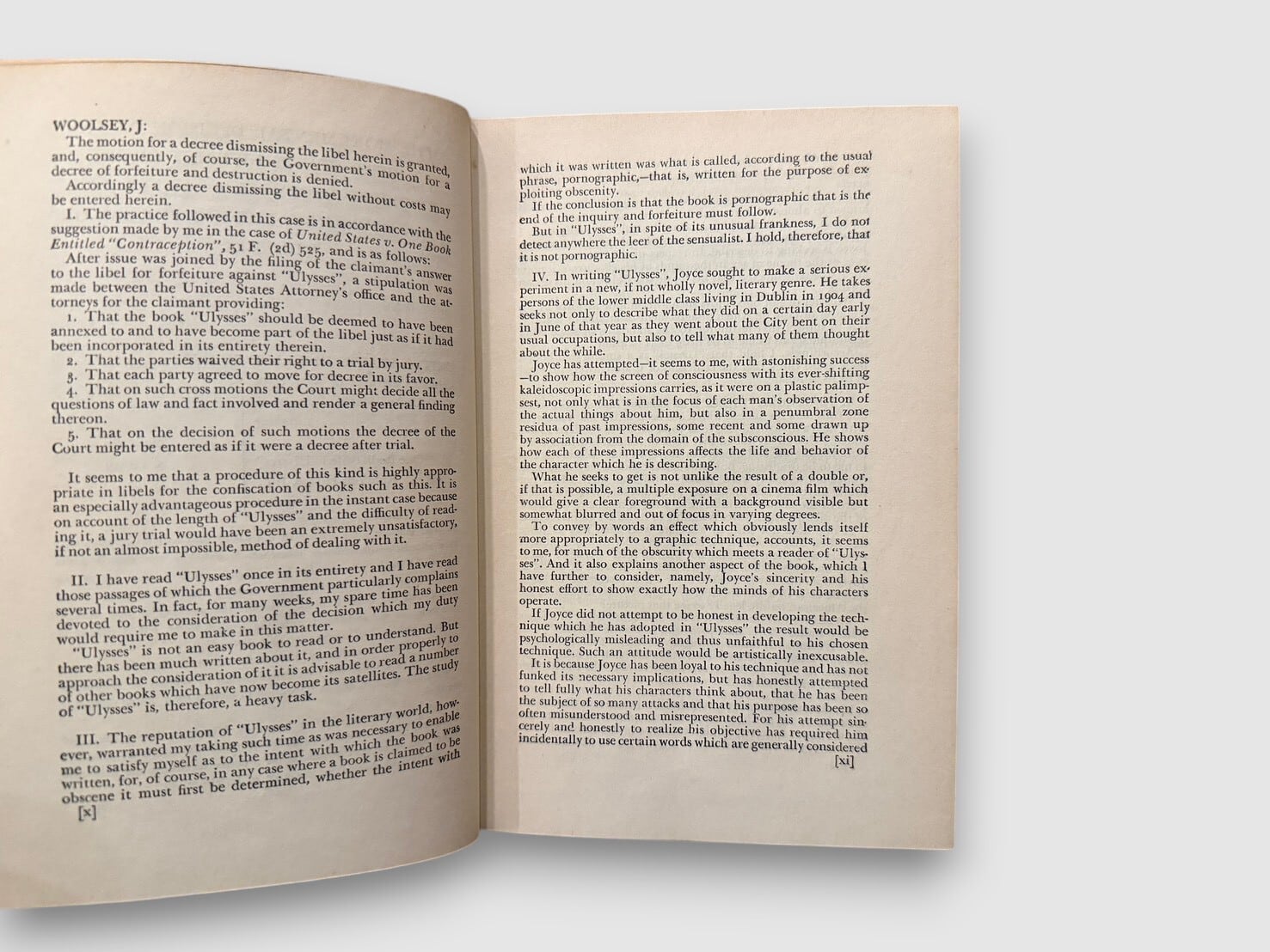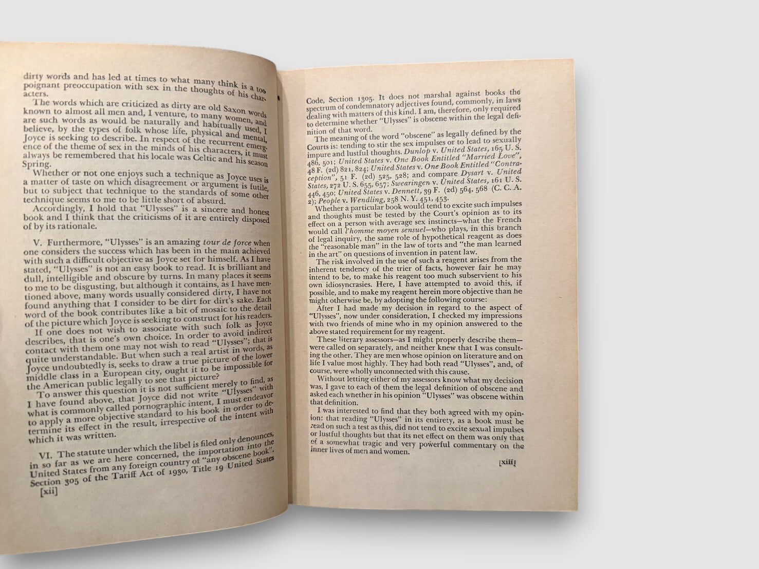 20世紀文学の転換点とされるアイルランドの作家ジェームス・ジョイスによる長編小説。1922年パリで刊行された初版は、英米で長く発禁扱いとなった。舞台は1904年6月16日のダブリン。レオポルド・ブルームの一日を軸に、意識の流れ技法を用いて都市と精神内部を描く構成をとる。20世紀小説の方法論を決定的に更新した作品として、文学史上繰り返し参照されてきた。本書は、1933年12月6日付の米国連邦地方裁判所判事 John M. Woolsey による判決を経て刊行された、The Modern Library版。奥付にはCopyright 1942, 1946(Nora Joseph Joyce)の記載があり、戦後期の再刷と判断される。
