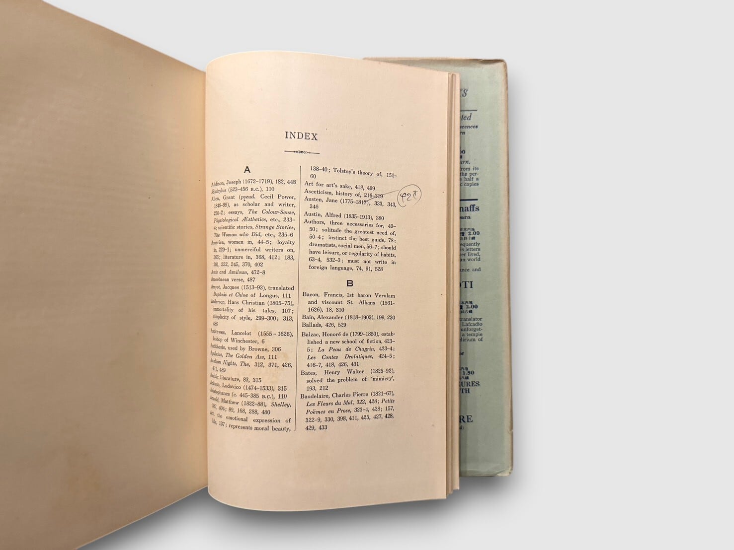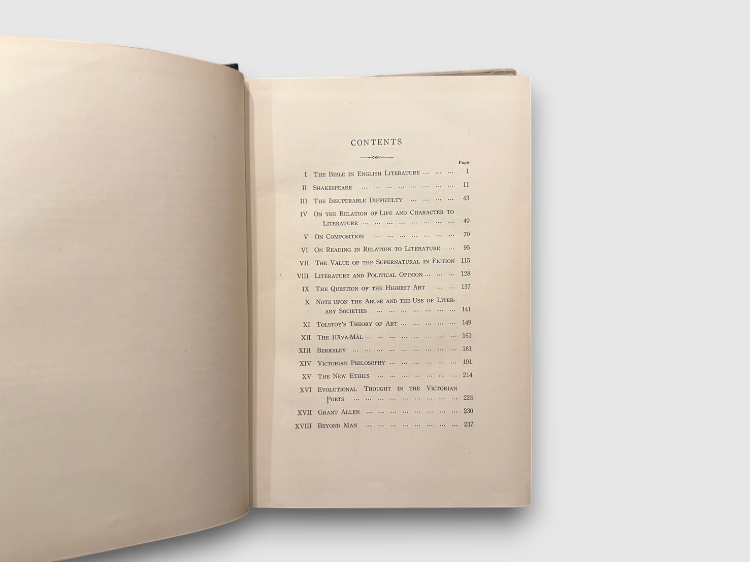小泉八雲として知られるラフカディオ・ハーンの東京帝国大学講義録。1896–1903年に行われた英文学講義を編集し刊行された「Complete Lectures」シリーズの一巻。内容は「The Bible in English Literature」「Shakespeare」「Tolstoy's Theory of Art」などを含み、文学と哲学、美と倫理を横断する講義群。ハーンの批評精神が最も直接的に現れる資料的価値の高い一冊である。初版は1932年(昭和7年)刊行。本書は昭和14年(1939年)再版発行分。