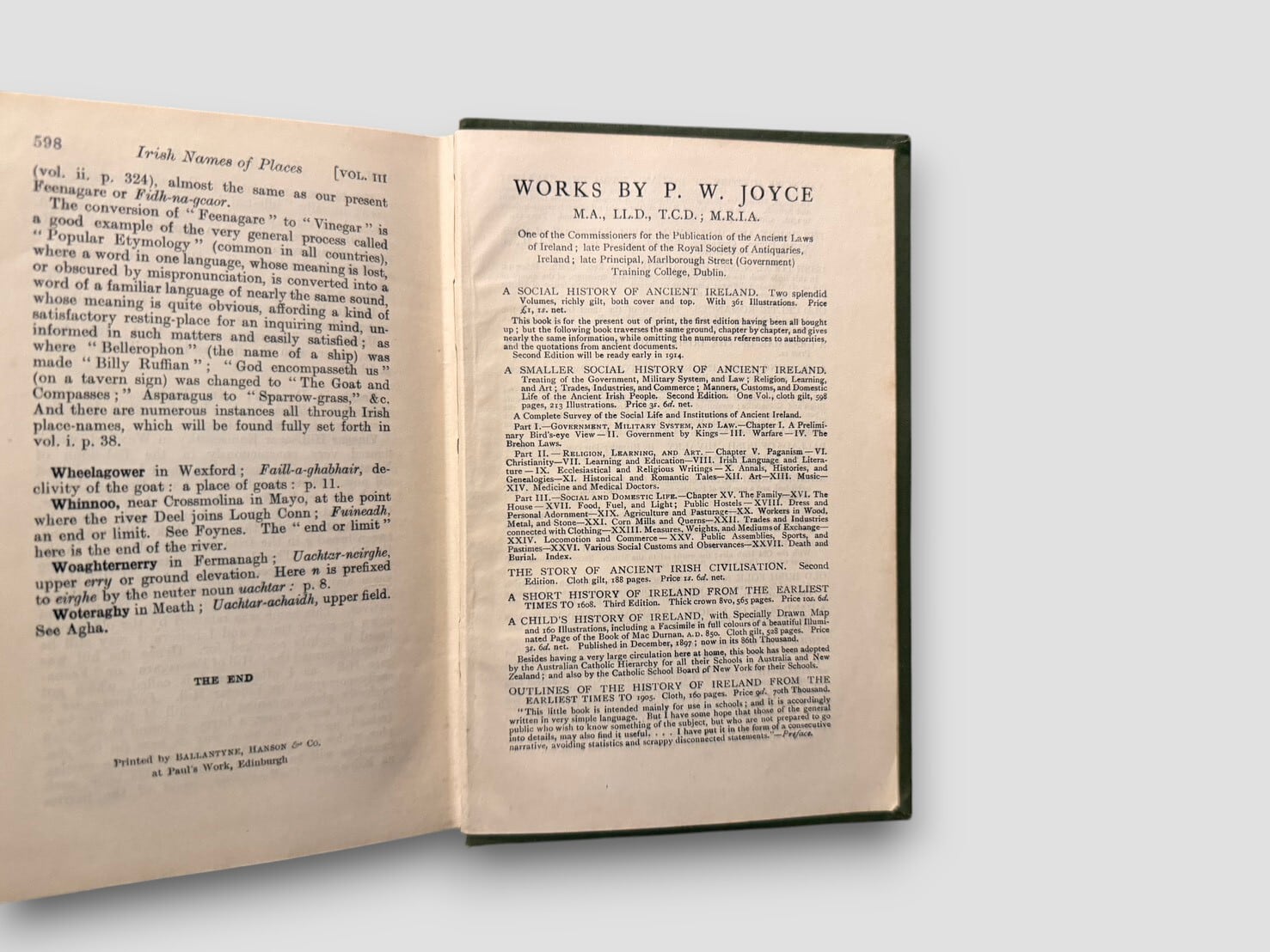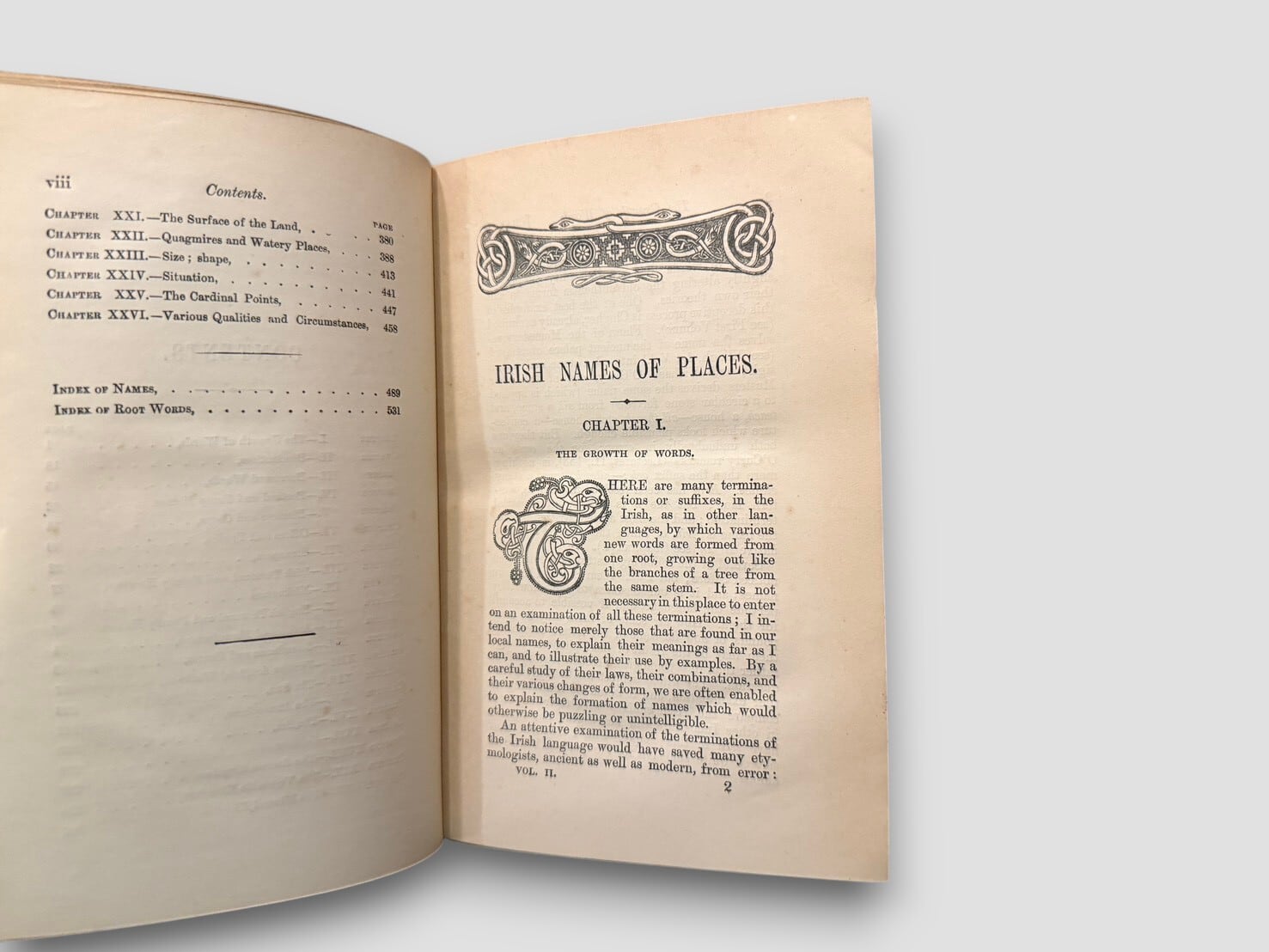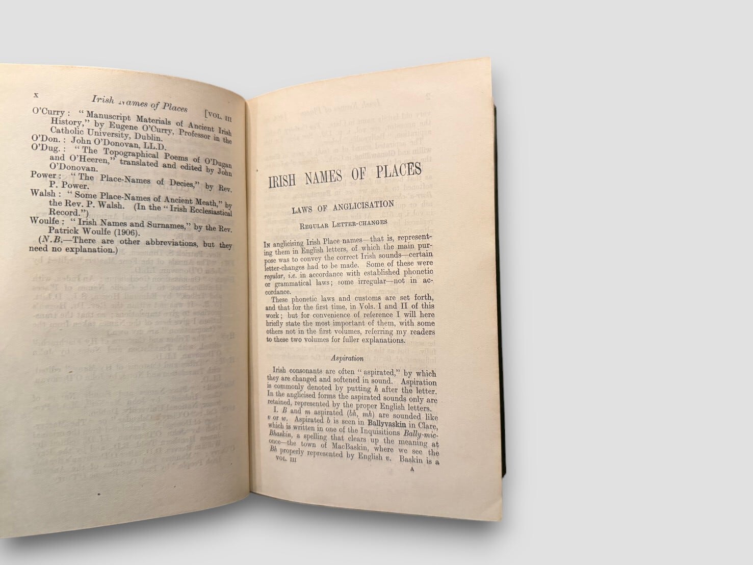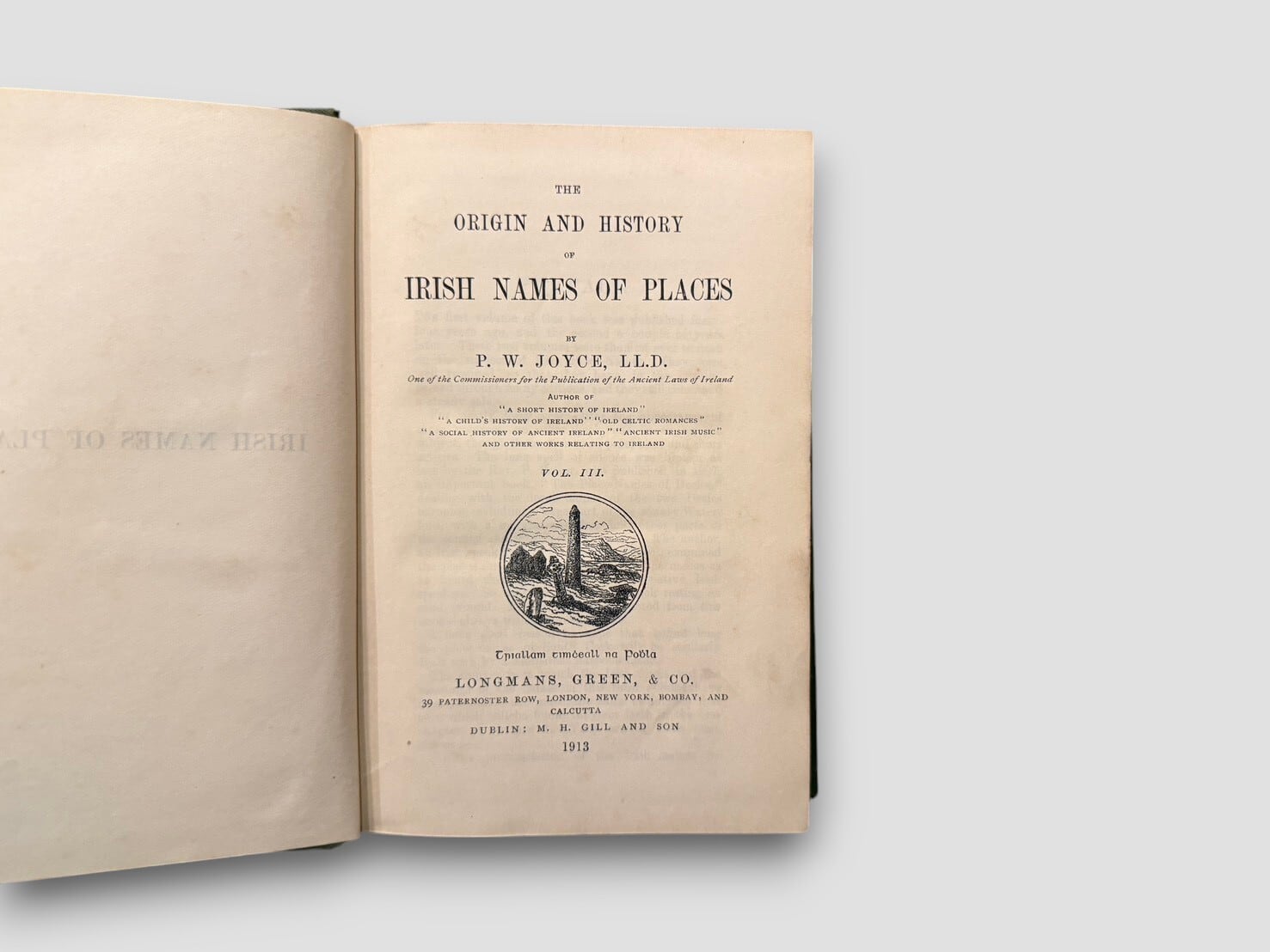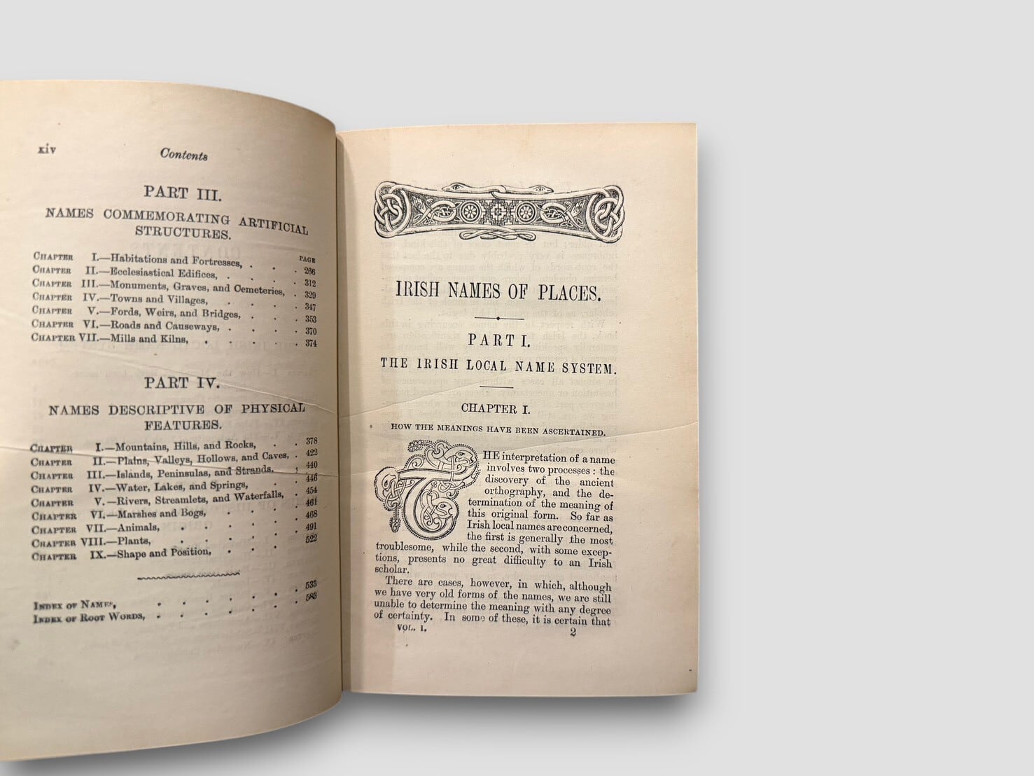 アイルランド各地の地名の語源、言語的構造、歴史的背景を体系的に分析した研究書で、河川・山地・土地の形状・歴史人物・伝説など、地名に残された文化的痕跡を読み解くことでアイルランドの歴史と社会を明らかにする内容となっている。19世紀後半に刊行された地名研究の代表的文献の一つとして知られ、アイルランド史・ケルト研究・歴史言語学の基礎資料として長く参照されてきた。全3巻本揃。