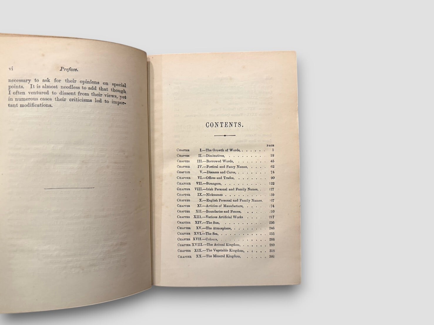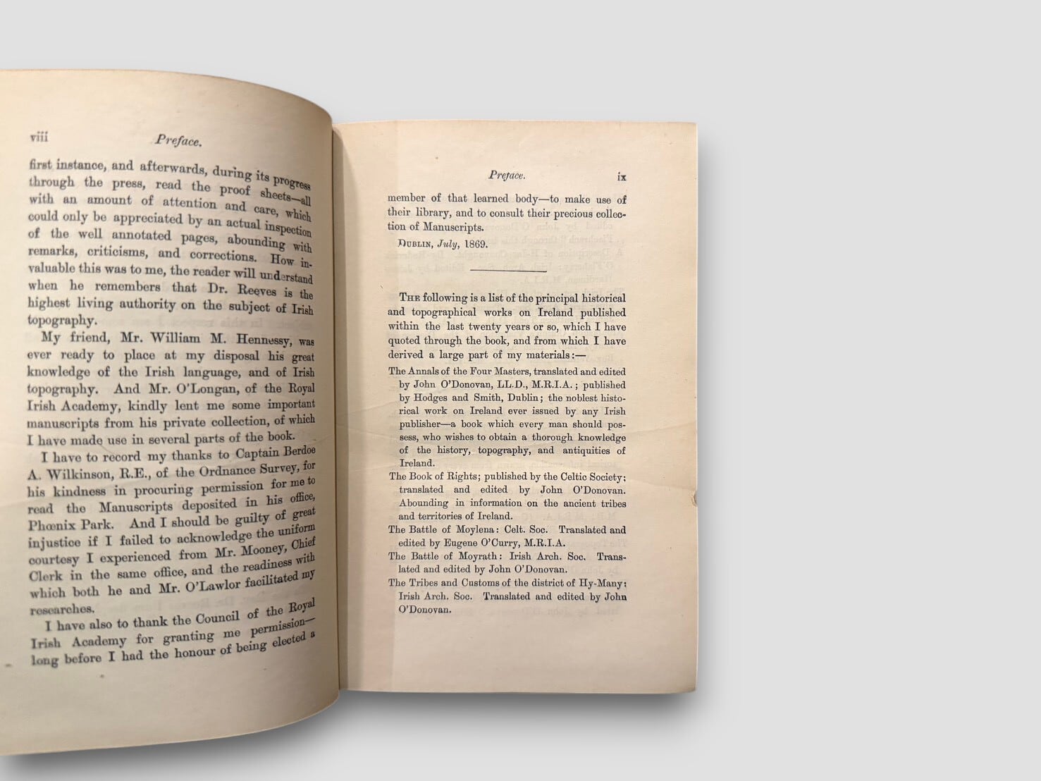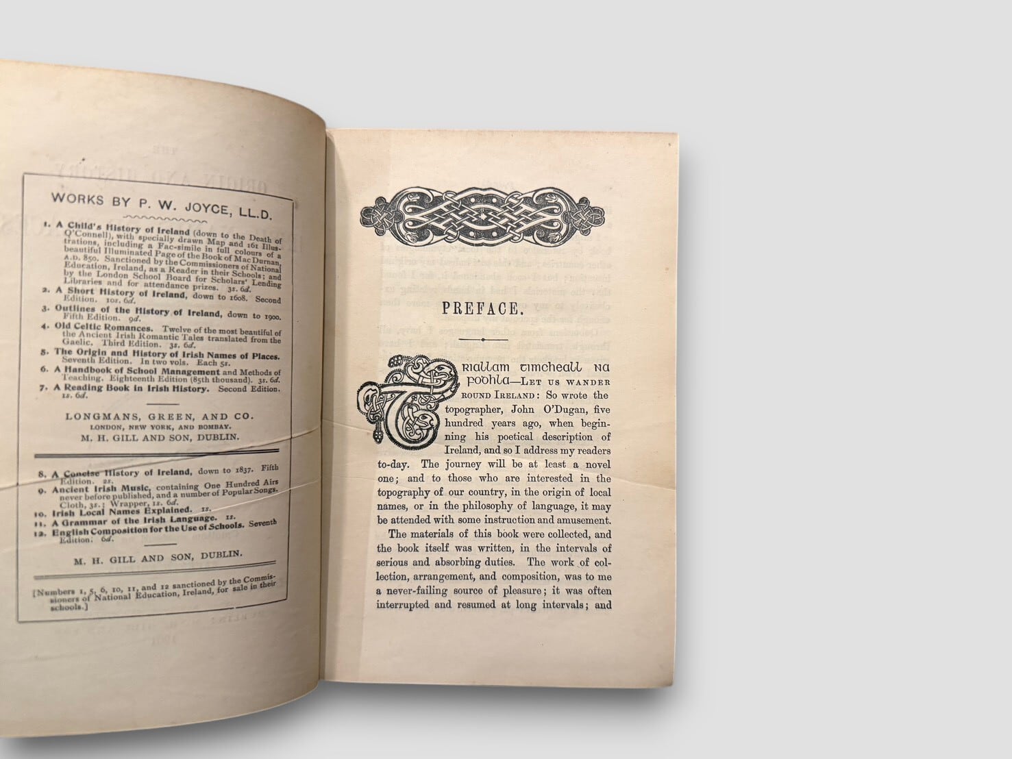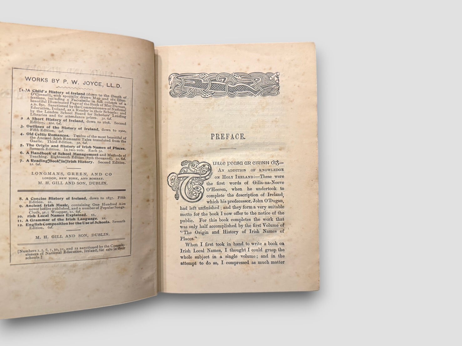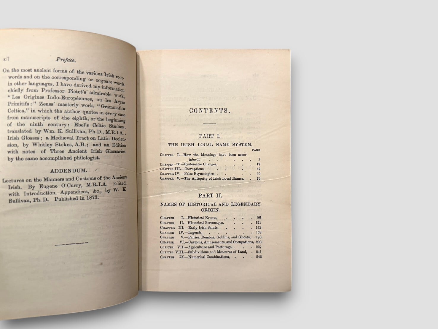 アイルランド各地の地名の語源、言語的構造、歴史的背景を体系的に分析した研究書で、河川・山地・土地の形状・歴史人物・伝説など、地名に残された文化的痕跡を読み解くことでアイルランドの歴史と社会を明らかにする内容となっている。19世紀後半に刊行された地名研究の代表的文献の一つとして知られ、アイルランド史・ケルト研究・歴史言語学の基礎資料として長く参照されてきた。全3巻本揃。