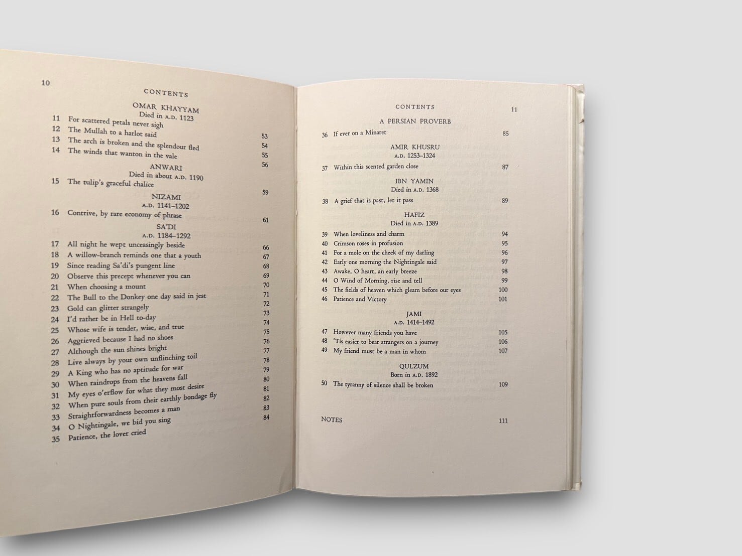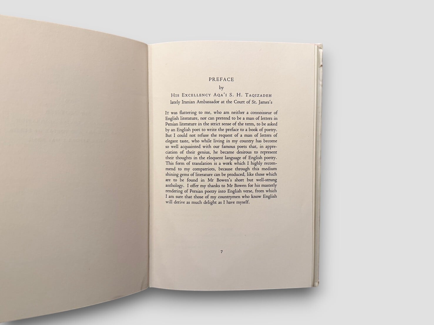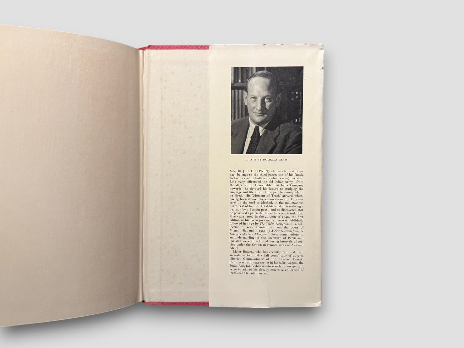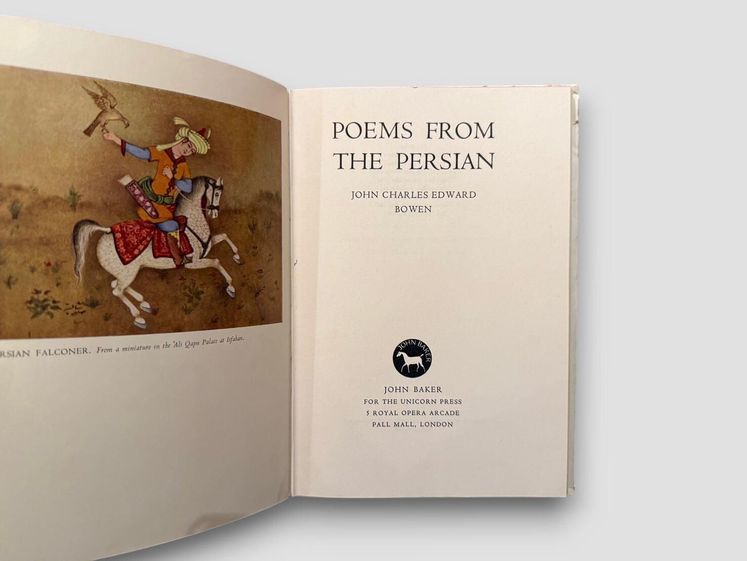 イギリスの作家・翻訳者 John Charles Edward Bowen による、ペルシア詩の英訳アンソロジー。東洋趣味の装丁とカラー口絵を備えた版であり、20世紀中頃の英語圏におけるペルシア詩受容の一端を示す出版物。