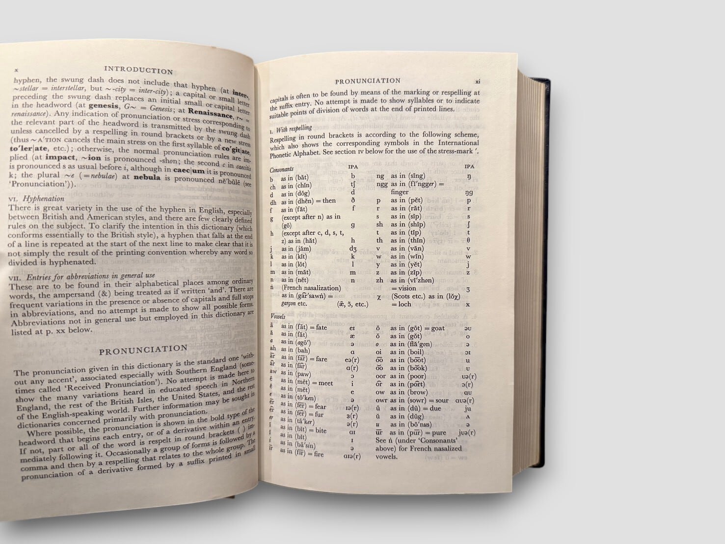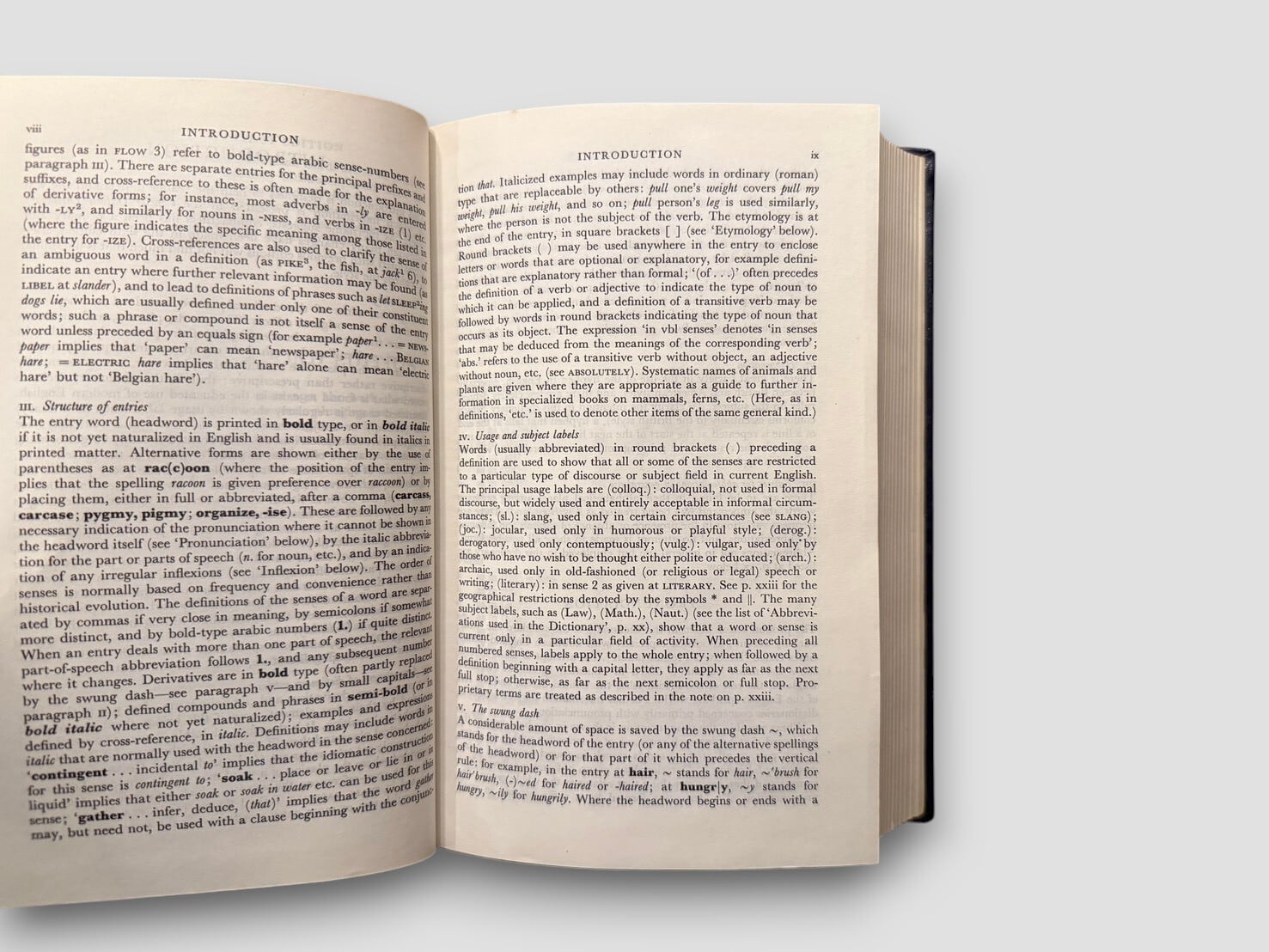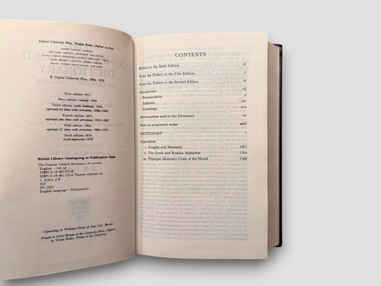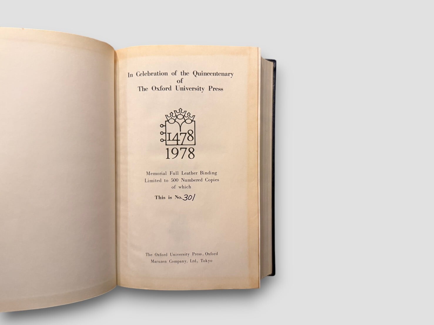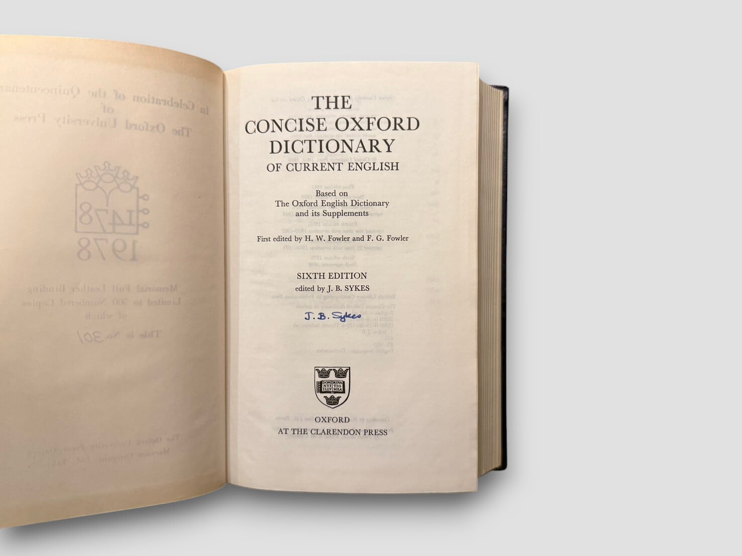 20世紀の英語辞書の中でも広く読まれてきた Oxford 系列の代表的な中型辞書の一つ。本書は、H. W. Fowler と F. G. Fowler によって編纂された The Concise Oxford Dictionary の第六版をもとに刊行された記念版である。原典となる初版は1911年刊行で、学術的な厳密さと一般読者への実用性を両立させた辞書として長く利用されてきた。本書はOxford University Press 創立500周年を記念して1978年に制作された Memorial Full Leather Binding の限定版。総限定500部の番号入りで、本書は No.301。タイトルページに第六版編集者 J. B. Sykes の直筆署名入り。