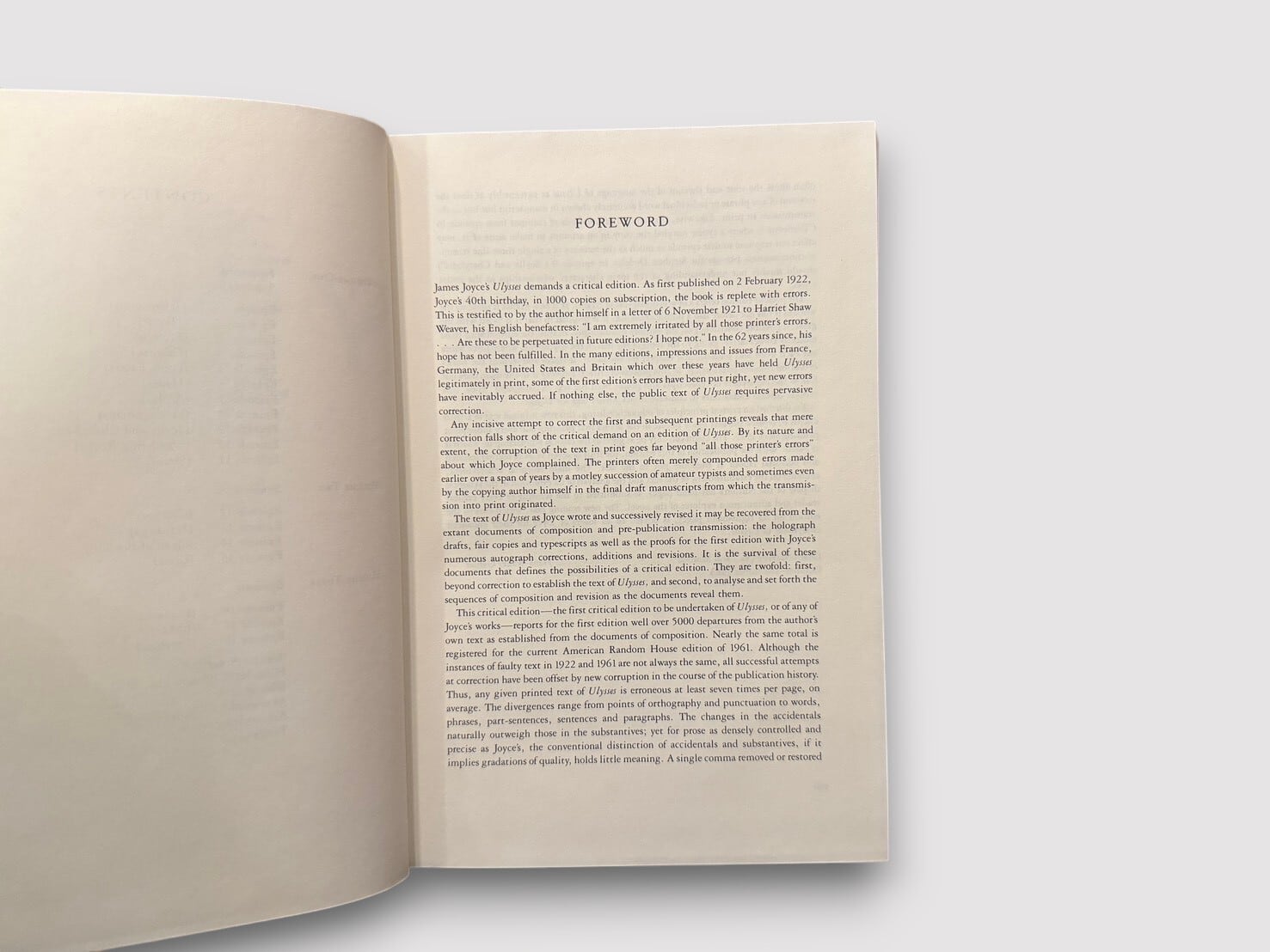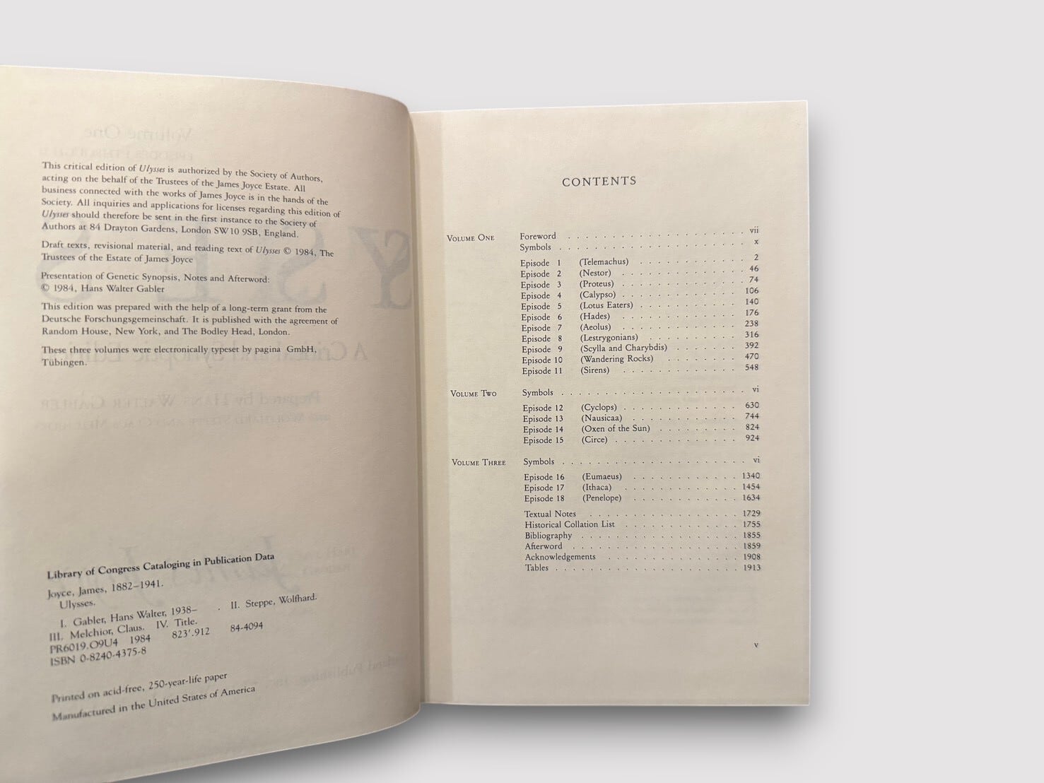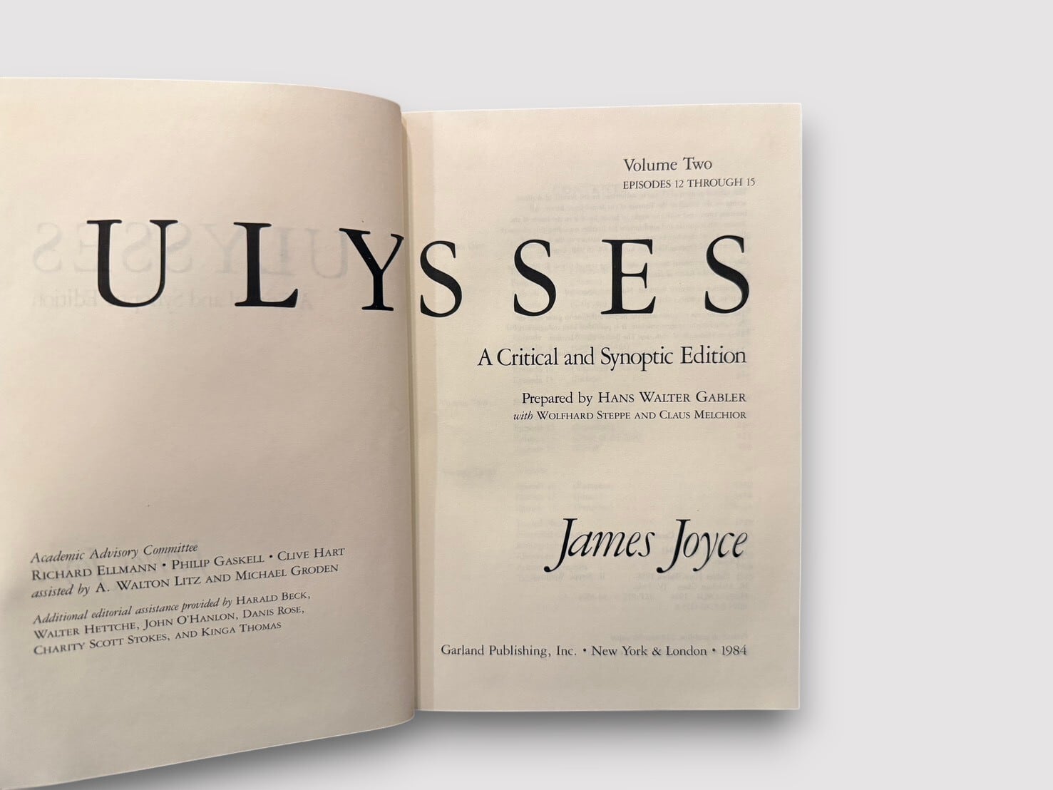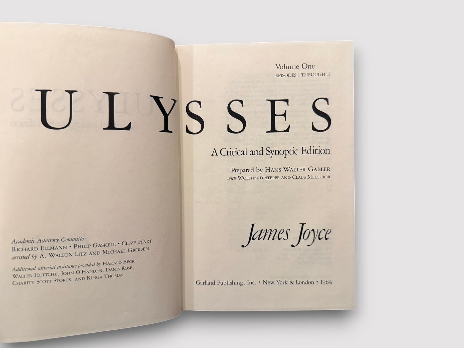 20世紀文学を代表する小説の一つ、ジェイムズ・ジョイス『Ulysses』批判校訂版。本書はドイツのジョイス研究者 Hans Walter Gabler を中心とする編集チームにより編纂されたエディション。ジョイスの草稿、写本、校正刷などの資料を精査し、テクストの成立過程を検証したうえで校訂された版であり、本文とともに校訂装置・異同一覧などを収録。1980年代のジョイス研究において大きな影響を与えた版の一つであり、原典研究やテクスト批評の文脈で参照されてきた。文学作品としての『Ulysses』だけでなく、その成立過程を示す研究資料としての側面も併せ持つ版である。1984年刊行初版。