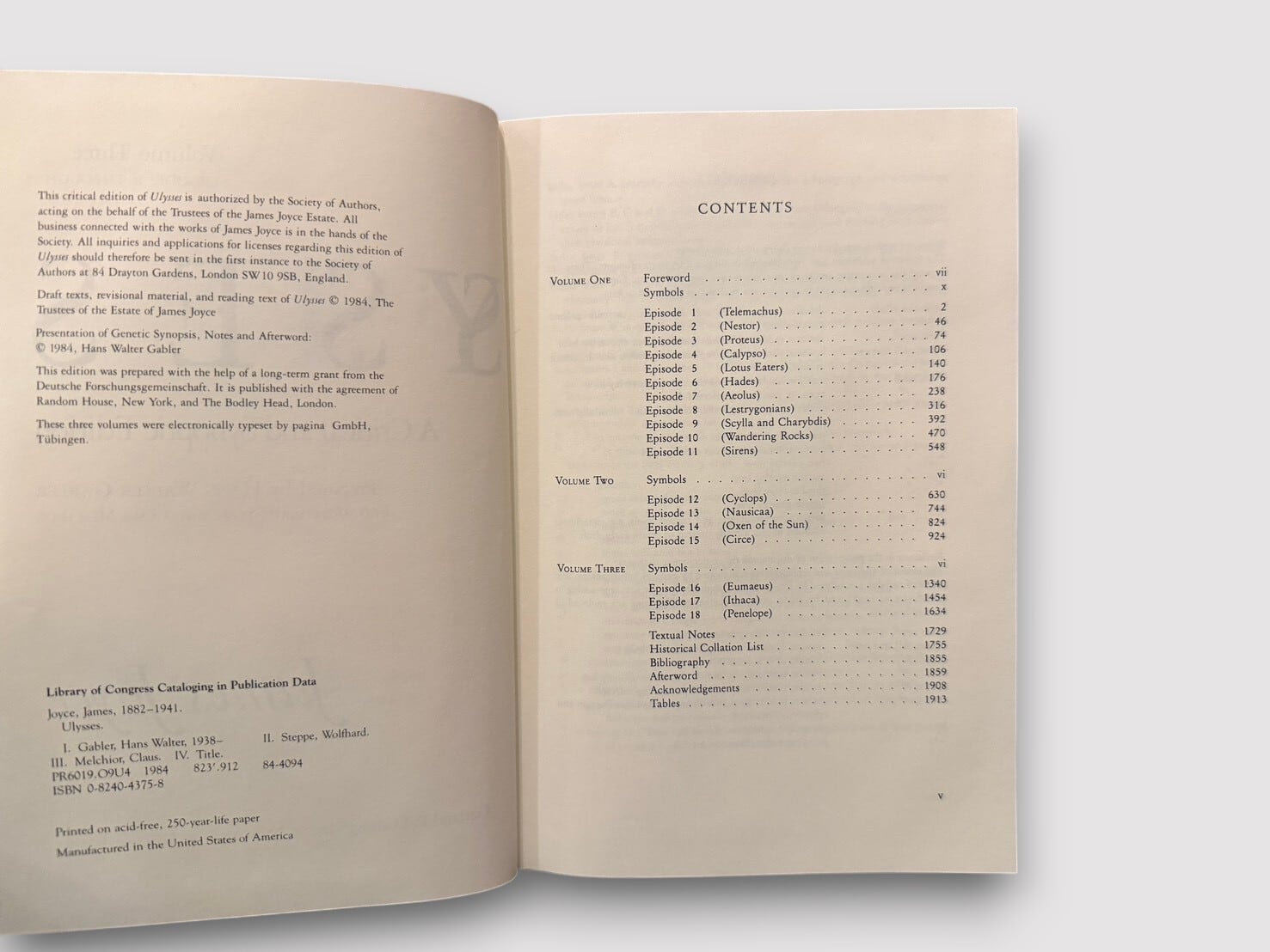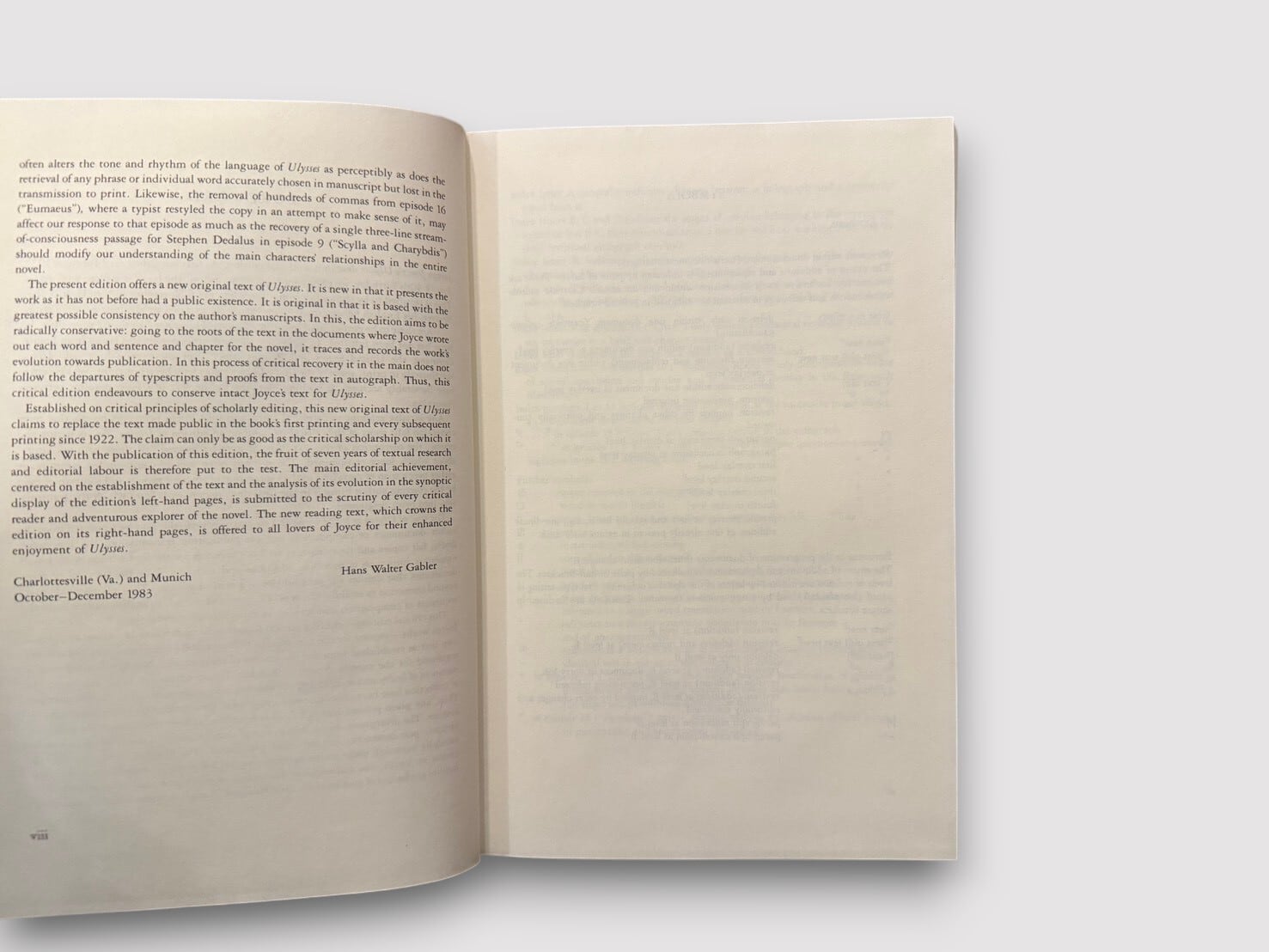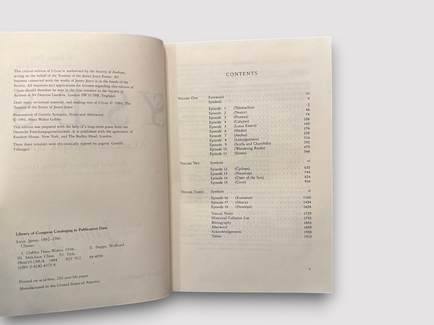 20世紀文学を代表する小説の一つ、ジェイムズ・ジョイス『Ulysses』批判校訂版。本書はドイツのジョイス研究者 Hans Walter Gabler を中心とする編集チームにより編纂されたエディション。ジョイスの草稿、写本、校正刷などの資料を精査し、テクストの成立過程を検証したうえで校訂された版であり、本文とともに校訂装置・異同一覧などを収録。1980年代のジョイス研究において大きな影響を与えた版の一つであり、原典研究やテクスト批評の文脈で参照されてきた。文学作品としての『Ulysses』だけでなく、その成立過程を示す研究資料としての側面も併せ持つ版である。1984年刊行初版。