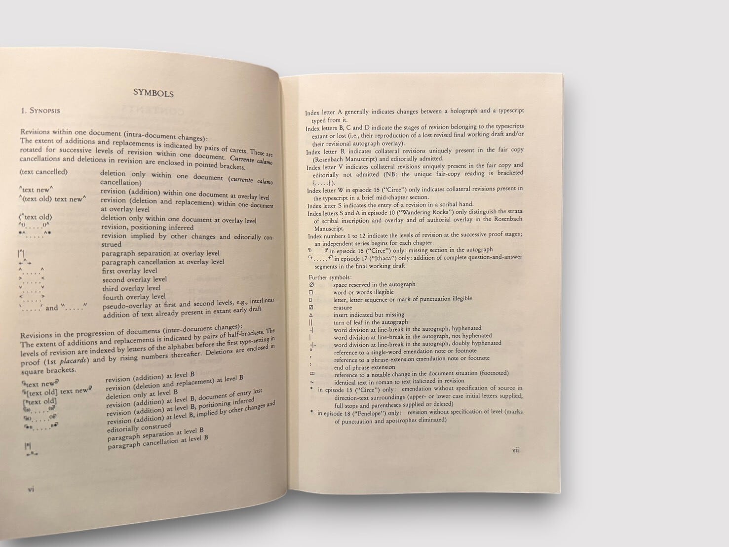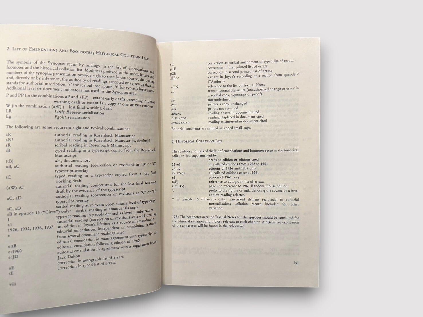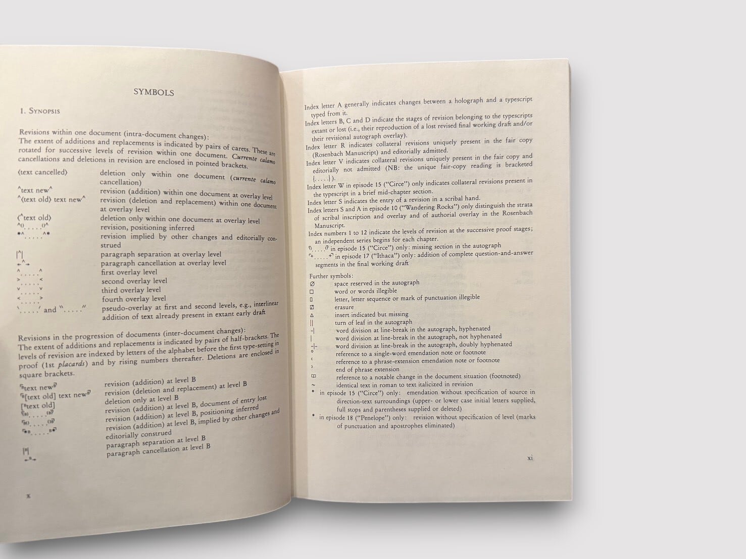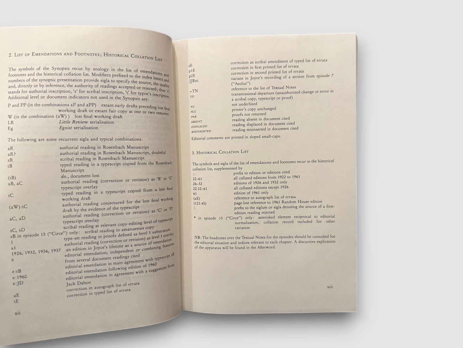 20世紀文学を代表する小説の一つ、ジェイムズ・ジョイス『Ulysses』批判校訂版。本書はドイツのジョイス研究者 Hans Walter Gabler を中心とする編集チームにより編纂されたエディション。ジョイスの草稿、写本、校正刷などの資料を精査し、テクストの成立過程を検証したうえで校訂された版であり、本文とともに校訂装置・異同一覧などを収録。1980年代のジョイス研究において大きな影響を与えた版の一つであり、原典研究やテクスト批評の文脈で参照されてきた。文学作品としての『Ulysses』だけでなく、その成立過程を示す研究資料としての側面も併せ持つ版である。1984年刊行初版。