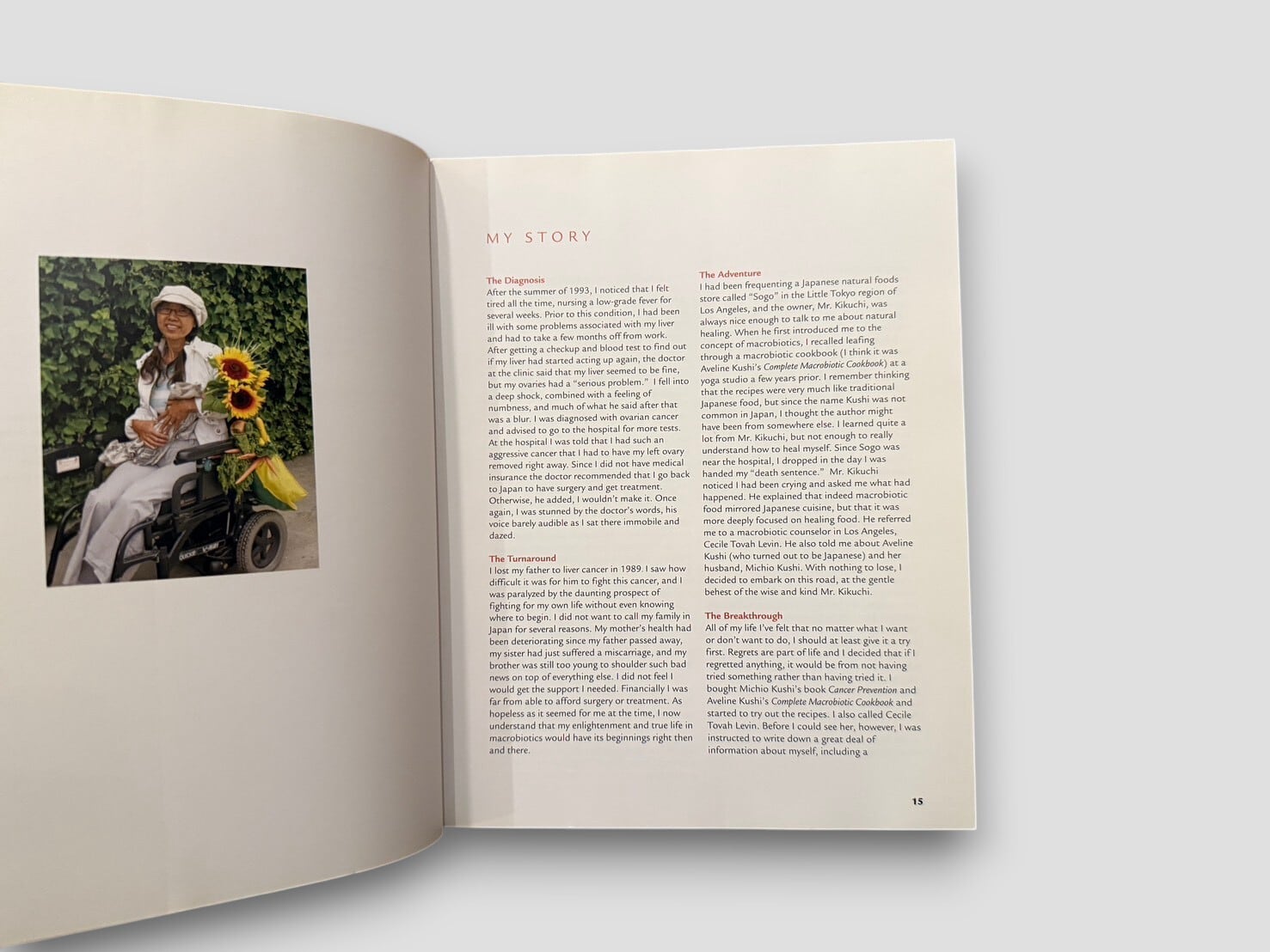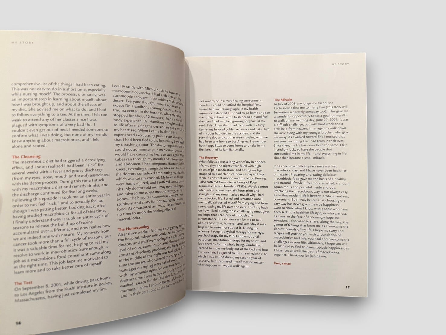 日本出身のマクロビオティック実践者である鈴木さなえによる、料理と回復の記録を兼ねた一冊。重い病を経験した著者が、自身の体験をもとに食生活を見直し、マクロビオティックの実践を通じて再び日常を取り戻していく過程が語られる。