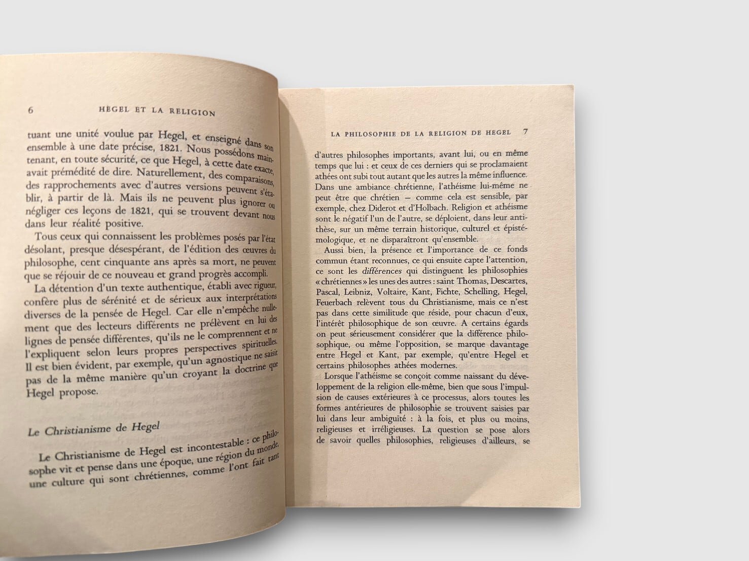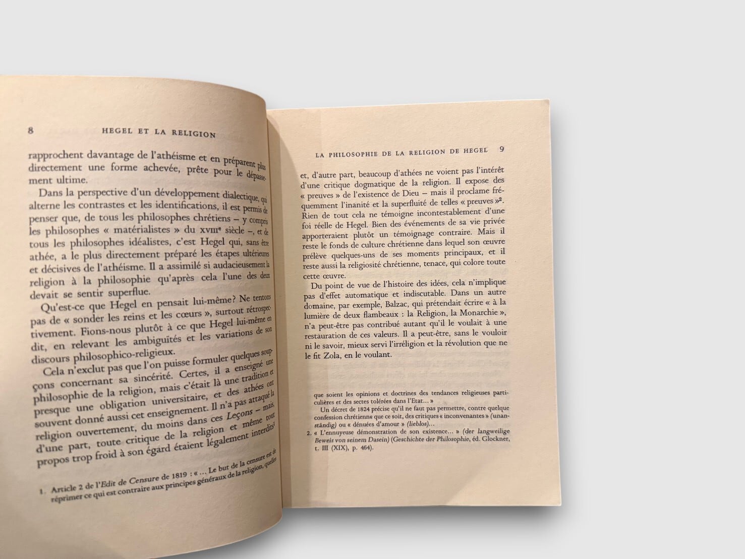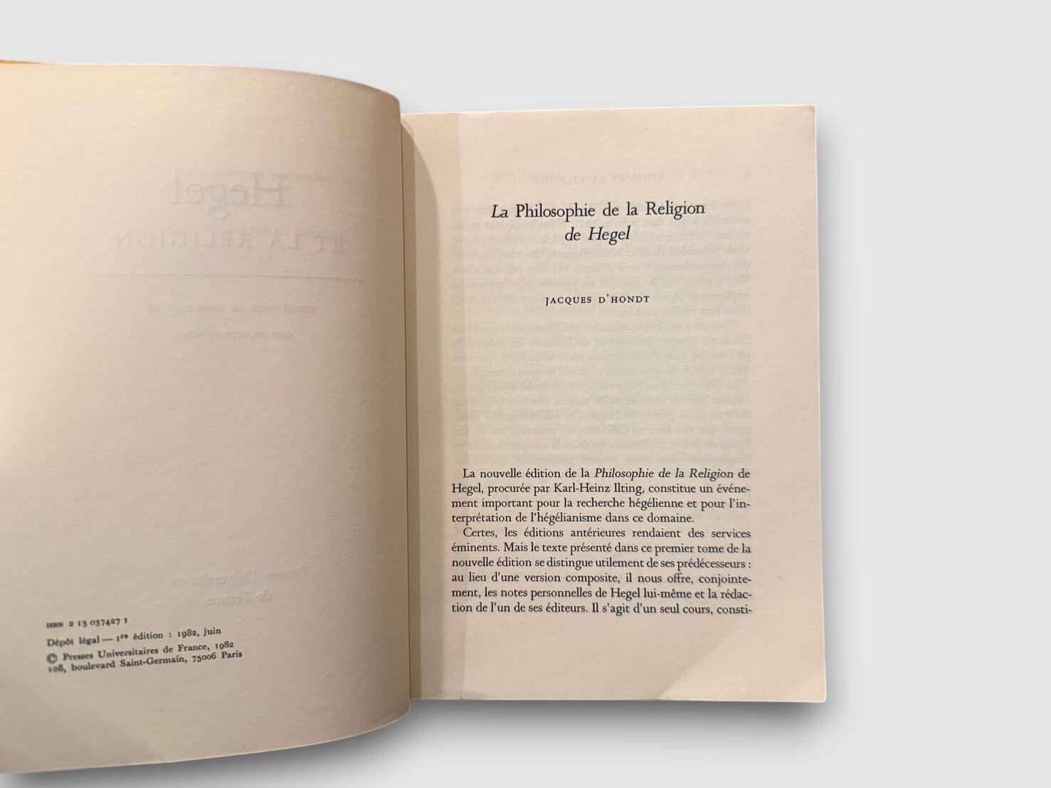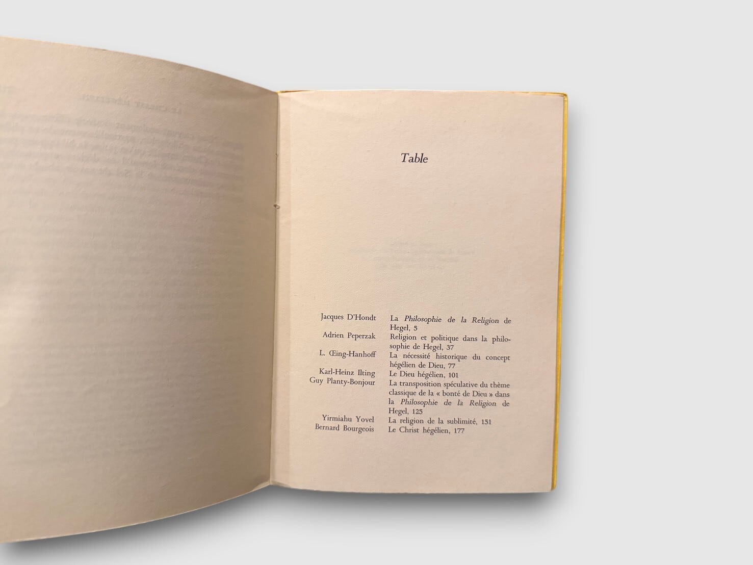 ヘーゲルにおける宗教の問題をめぐる研究の文脈の中に置かれる論文集。本書は、ヘーゲル哲学における宗教の位置づけを主題とし、CNRSおよびポワティエ大学の研究センターによる研究活動の一環として刊行されたものである。ギー・プランティ=ボンジュールの編集のもと、複数の研究者による論考が収録されている。宗教と哲学の関係、神の概念、弁証法的思考などをめぐる議論によって構成されており、ヘーゲル思想における宗教的主題が、それぞれの立場から検討されている。