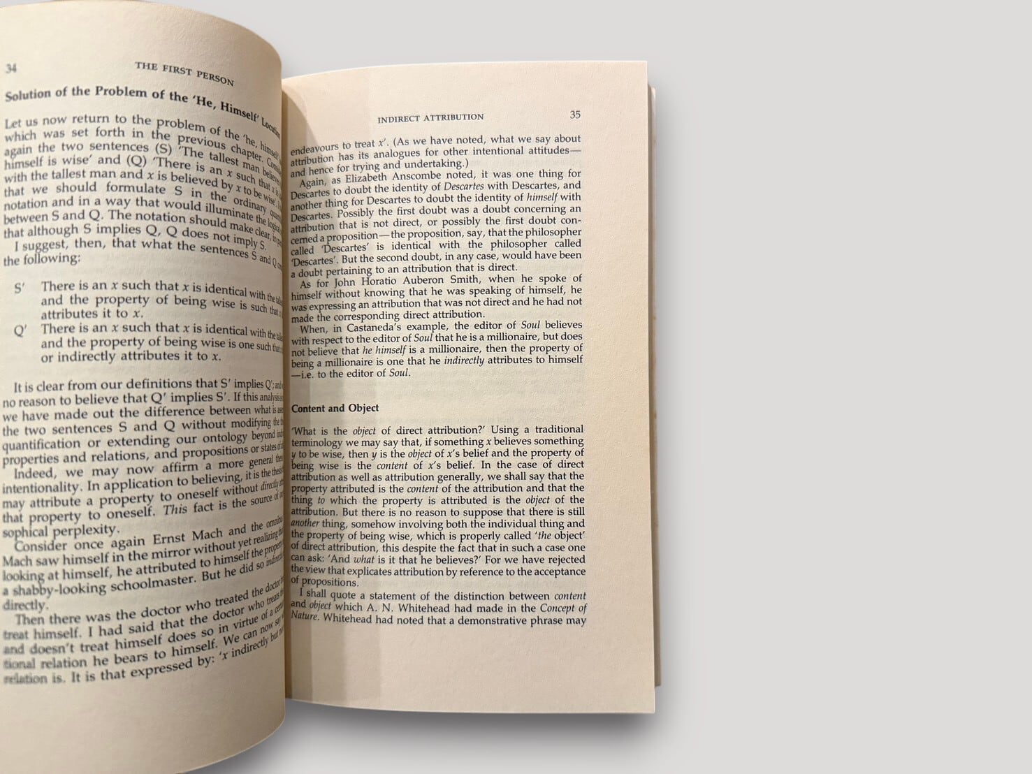 チザムは、意識の志向性や自己言及の問題を中心に据え、「第一人称」とは何を指すのか、またどのように意味を持つのかを論理的に検討している。構成は章ごとに整理され、知識・信念・意識の統一性といったテーマに関する分析が展開される。言語哲学および心の哲学の接点に位置するテクストとして、分析哲学の一つの問題系を示す著作である。