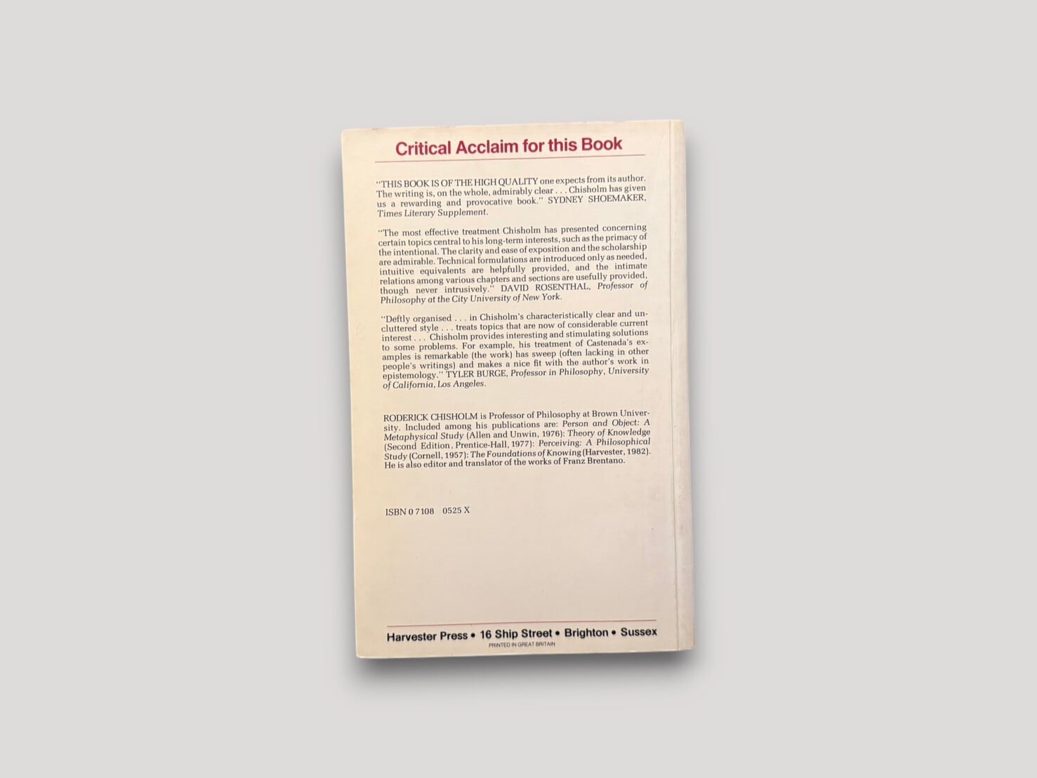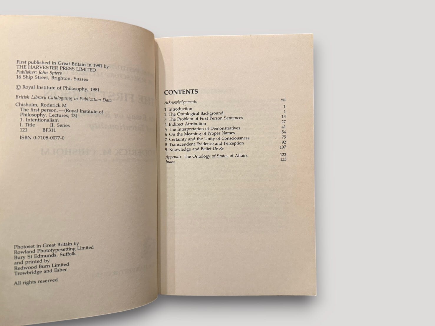 A philosophical work by Roderick M. Chisholm on first-person reference and intentionality. It examines topics such as self-reference, belief, and consciousness through structured chapters based on lectures delivered in 1979. First published in 1981.