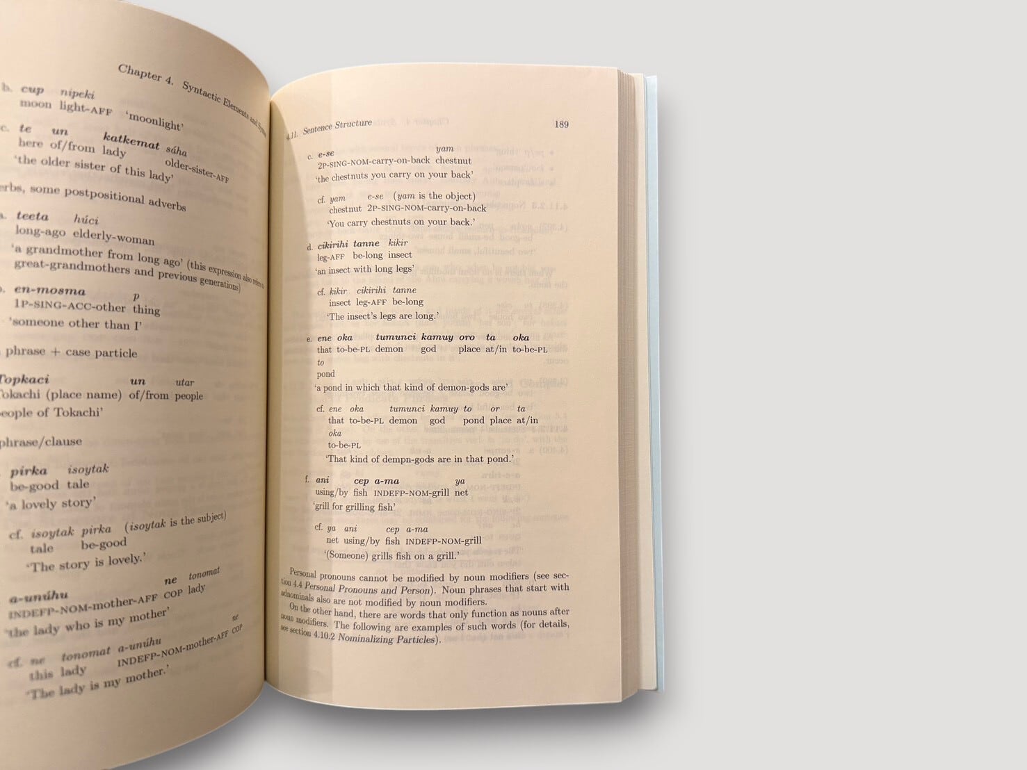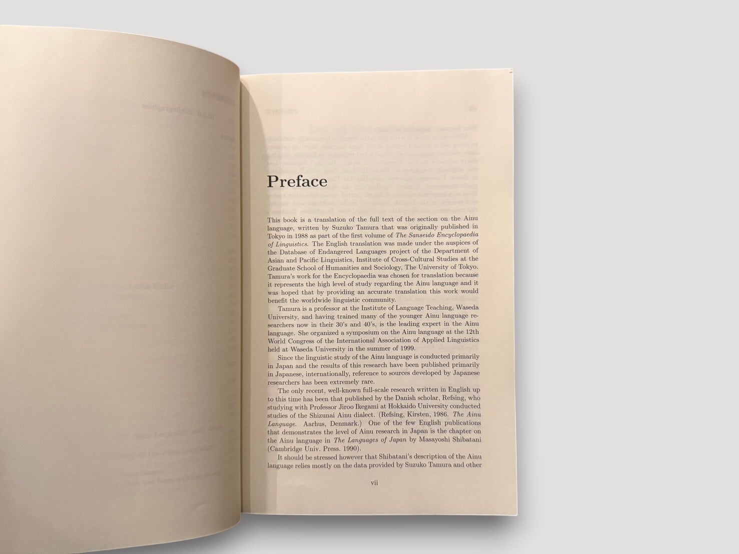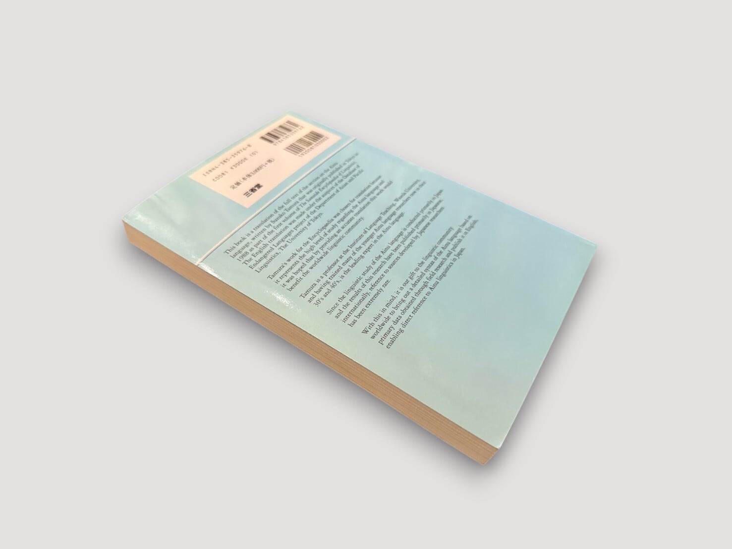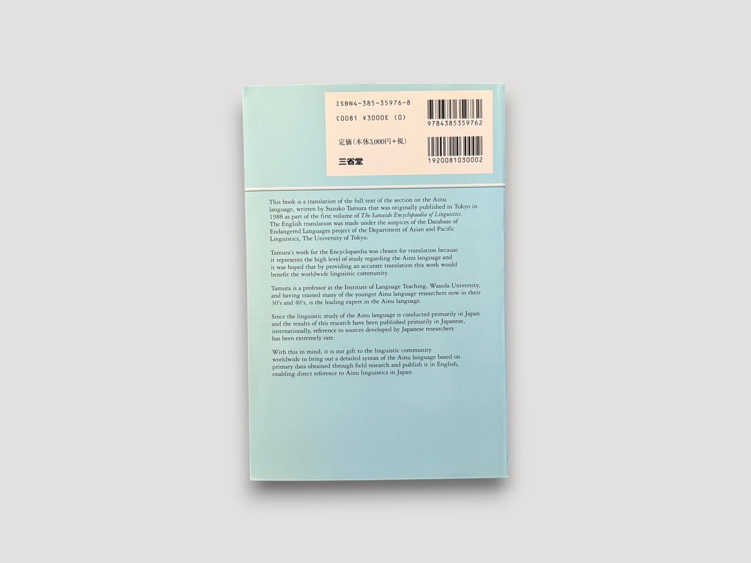 日本におけるアイヌ語研究を牽引してきた言語学者・田村すず子による、体系的な記述研究書。本書は、1988年に刊行された日本語版『アイヌ語』をもとに、その内容を英語で提示したもの。英語版は、東京大学のDatabase of Endangered Languages projectのもとで翻訳され、日本語で蓄積されてきた研究成果を国際的に共有することを目的として刊行された。記述言語学の成果としてだけでなく、消滅の危機にある言語を記録する試みとしての側面も持つ、基礎資料として位置づけられる一冊である。