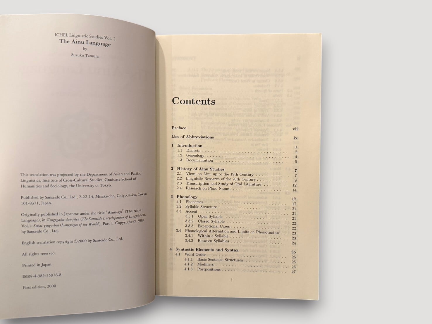 A linguistic study of the Ainu language by Suzuko Tamura. It presents analyses of phonology, word formation, syntax, and vocabulary through structured chapters. This is a 2000 English edition based on the original Japanese work published in 1988, translated under the auspices of a University of Tokyo project.
