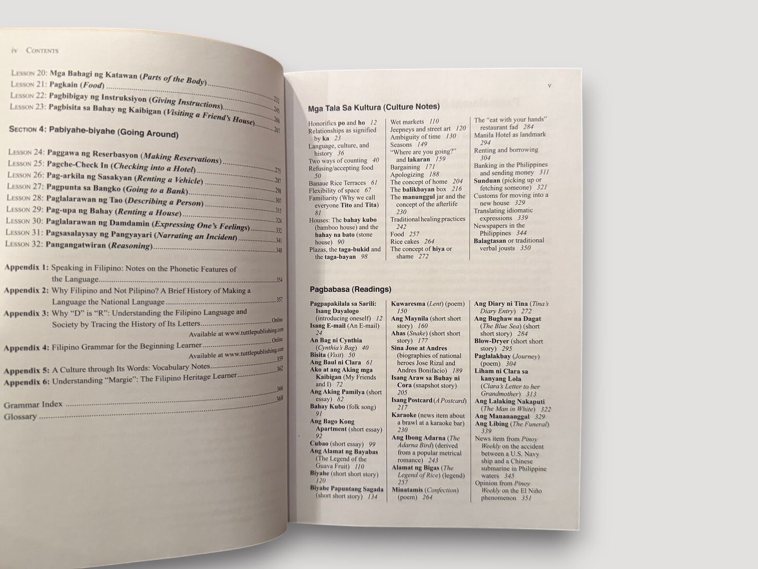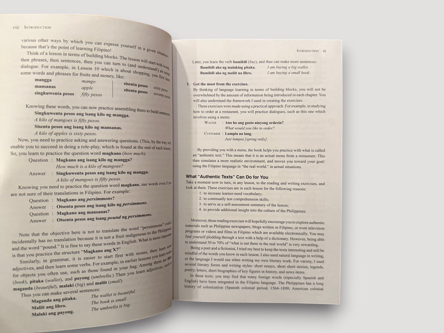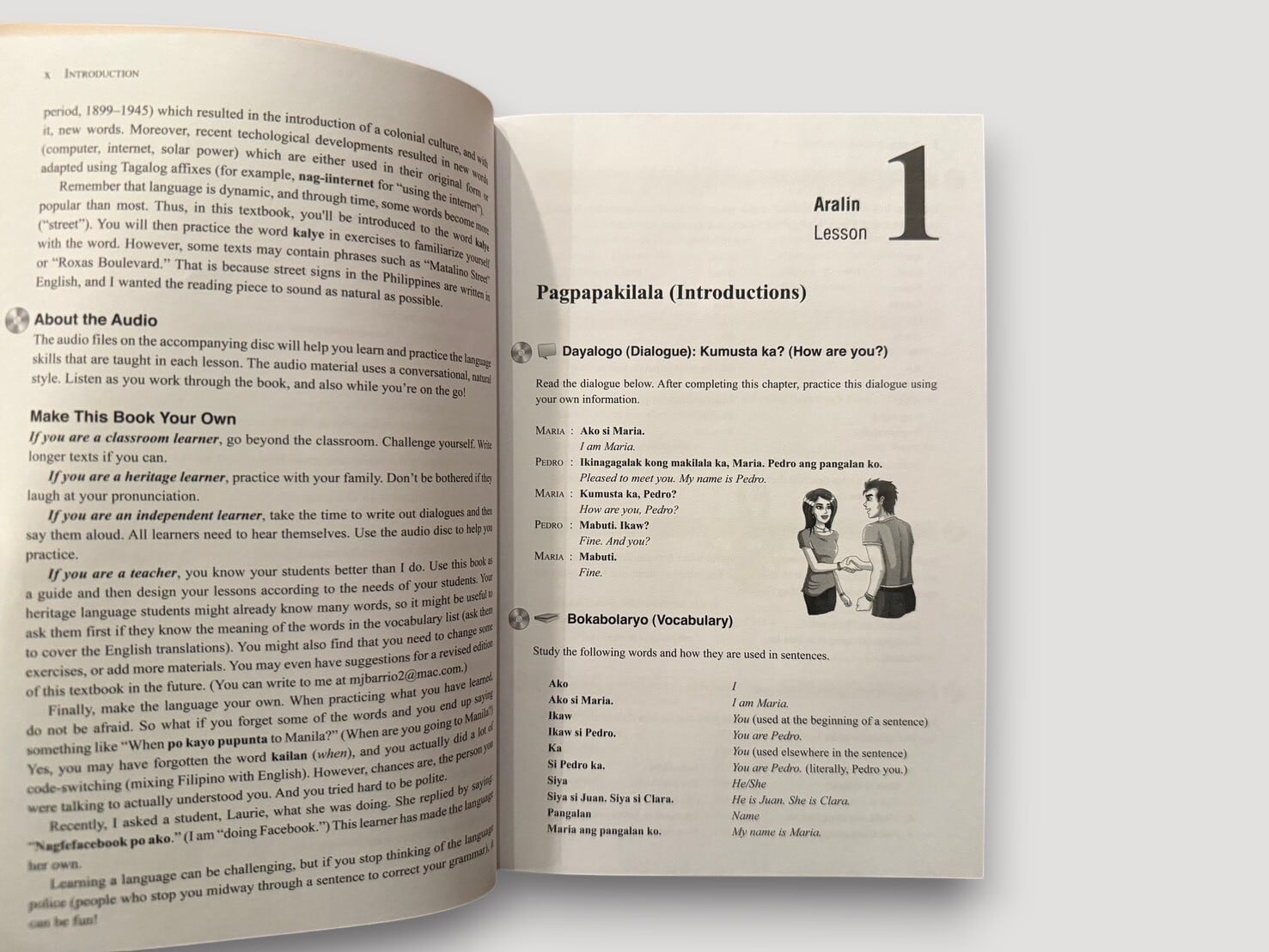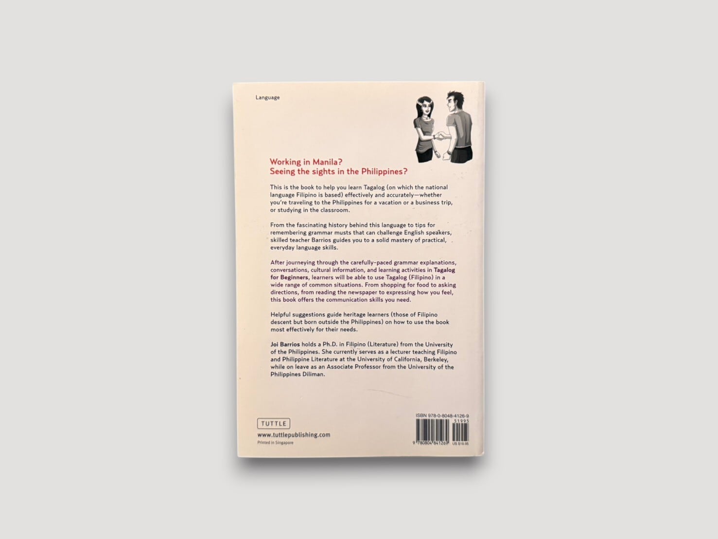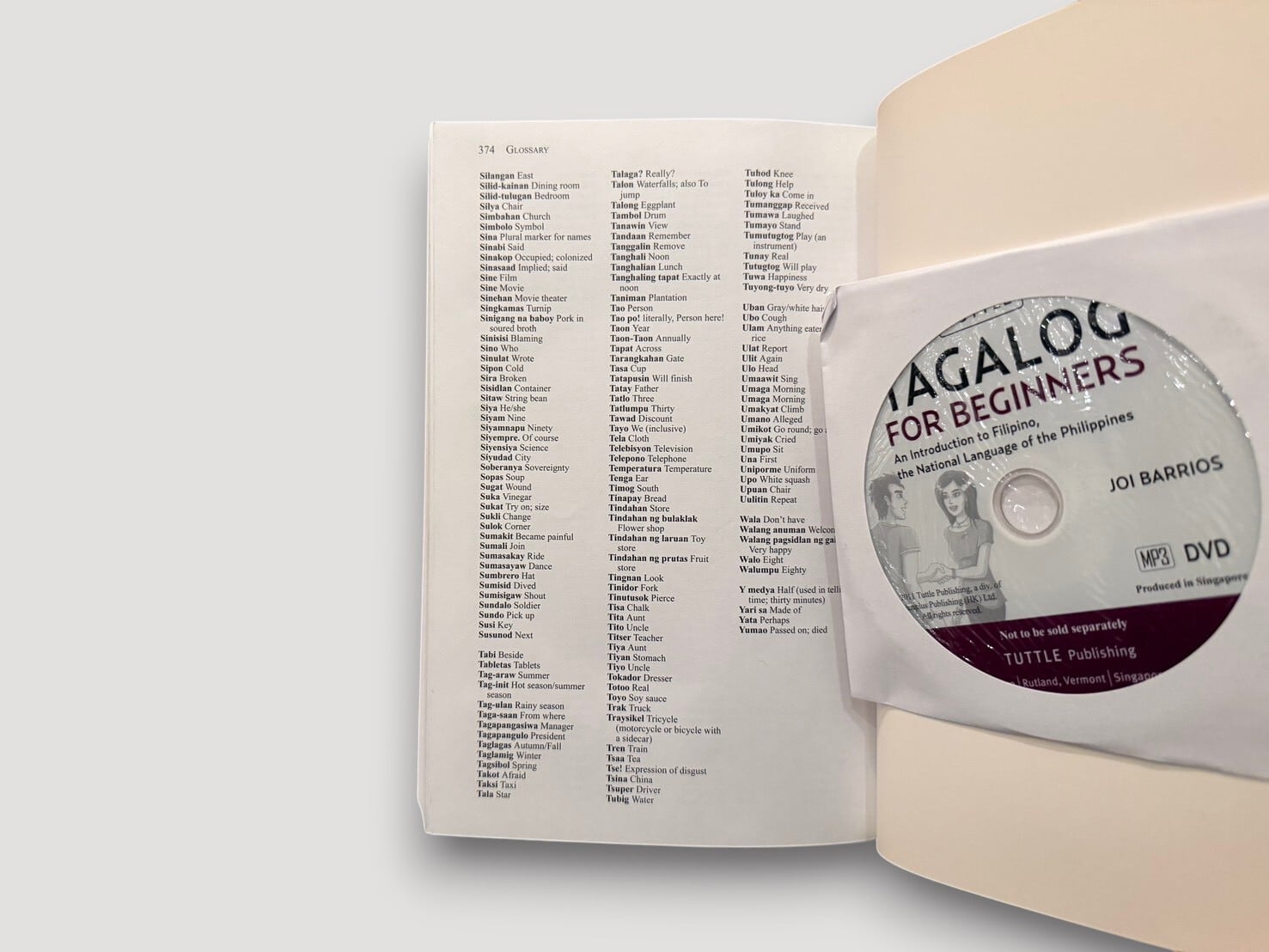 著者ジョイ・バリオスは、フィリピン文学と言語教育に関わる研究者であり、本書では日常会話を軸に、文法・語彙・文化的背景を段階的に提示している。構成はレッスン形式となっており、「introductions」「shopping」「giving directions」「daily life」など、実際の生活場面に基づく会話と語彙が整理されている。巻末には語彙集や文化ノートが付されており、言語だけでなくフィリピン社会の文脈にも触れることができる構成となっている。音声教材(MP3ディスク)付属(未検品)。
