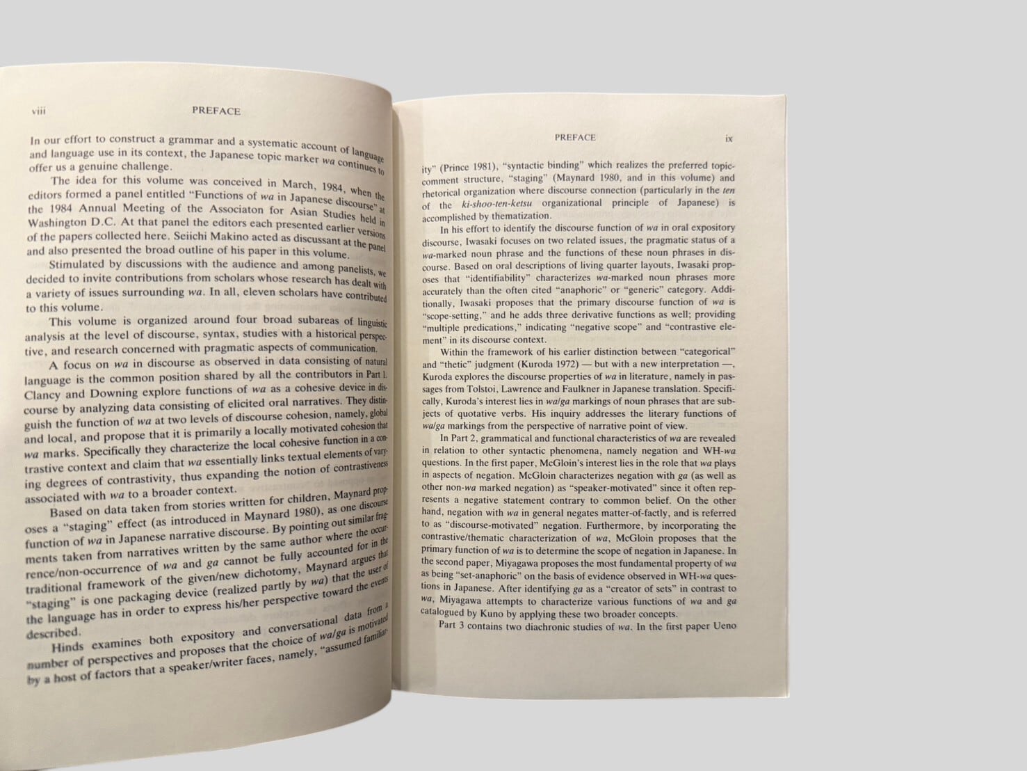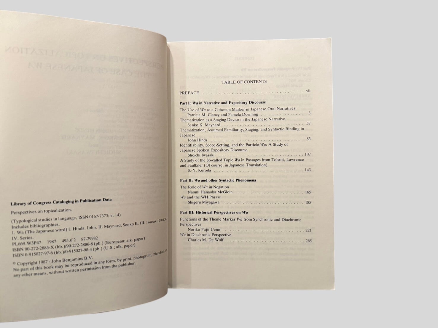 A collection of essays examining the Japanese topic marker "wa". It includes studies on discourse, syntax, historical development, and pragmatic functions based on empirical data. The volume presents multiple approaches to the analysis of topicalization in Japanese.