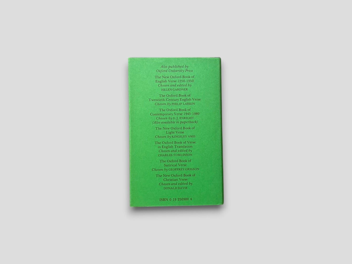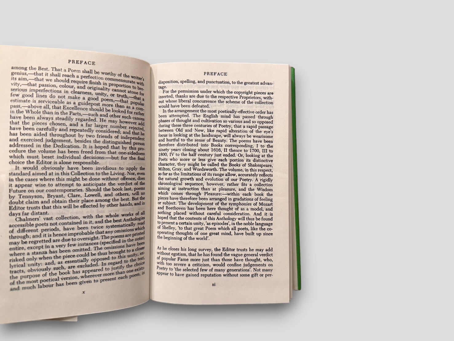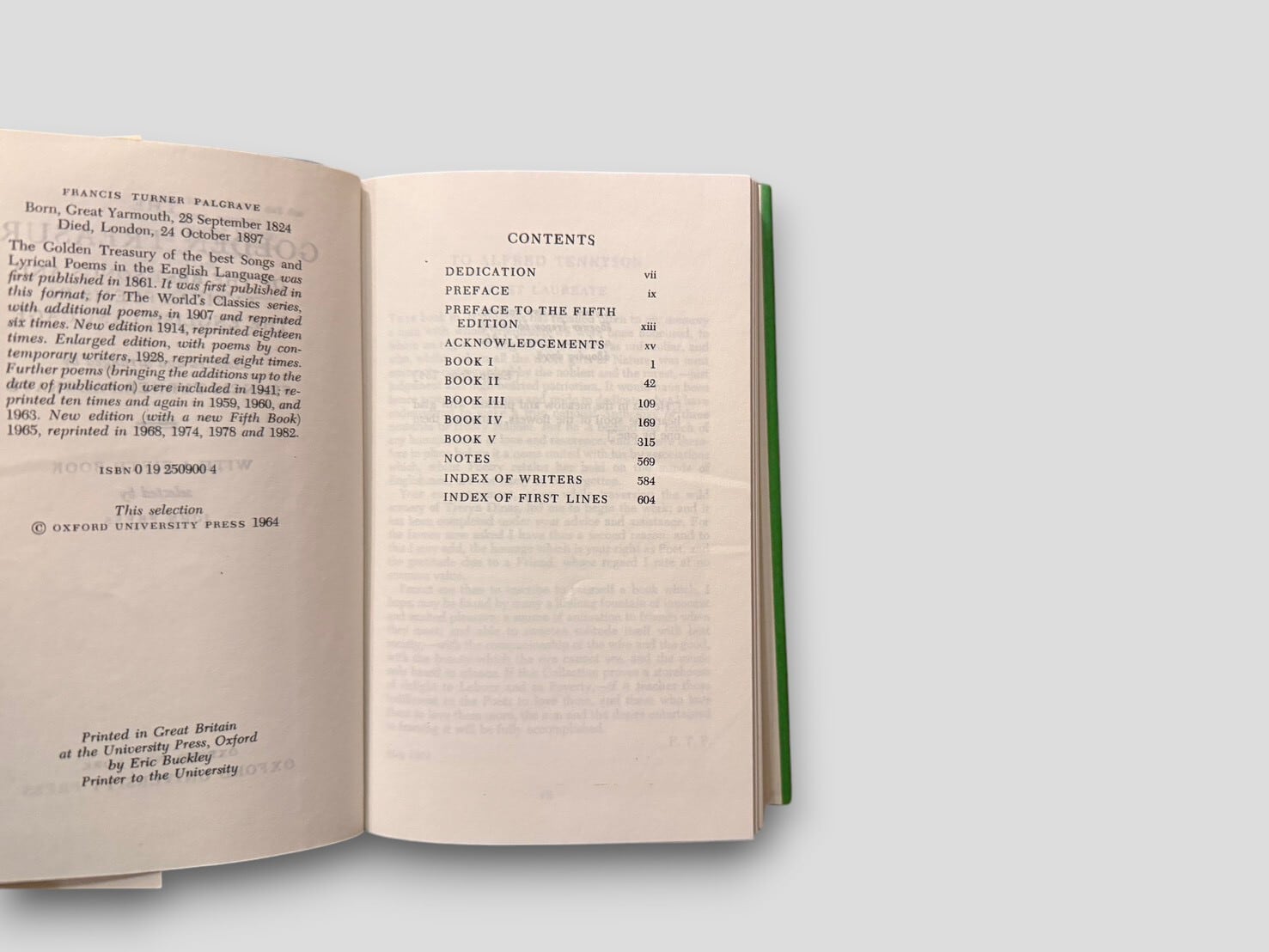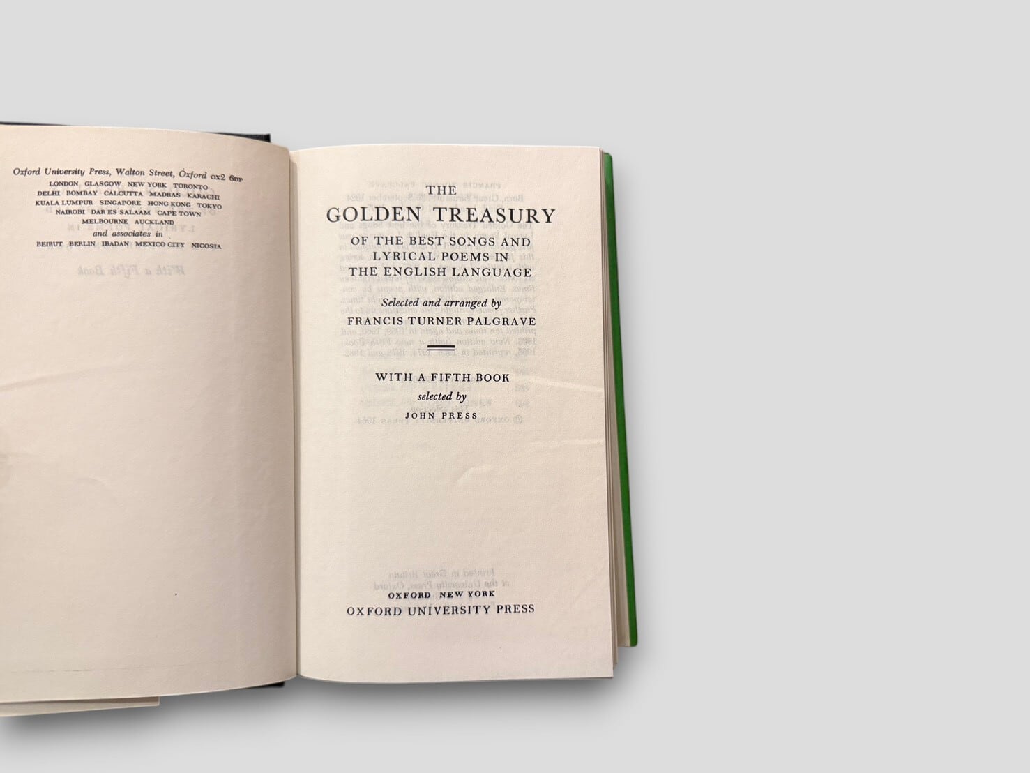 本書は、フランシス・ターナー・パルグレイヴによって編まれ、1861年に初版が刊行された。英語詩の中から抒情性を重視して選ばれた作品群によって構成されている。本版は、後年追加された第五部を含む構成であり、その選定はジョン・プレスによる。目次構成からも確認できるように、複数の区分に分けて詩が配置されており、時代ごとの流れに沿って読むことができる形式となっている。選ばれた作品の集積としてだけでなく、「何を詩とするか」という視点のあり方を示す構成をとった1冊。1982年刊行リプリント。