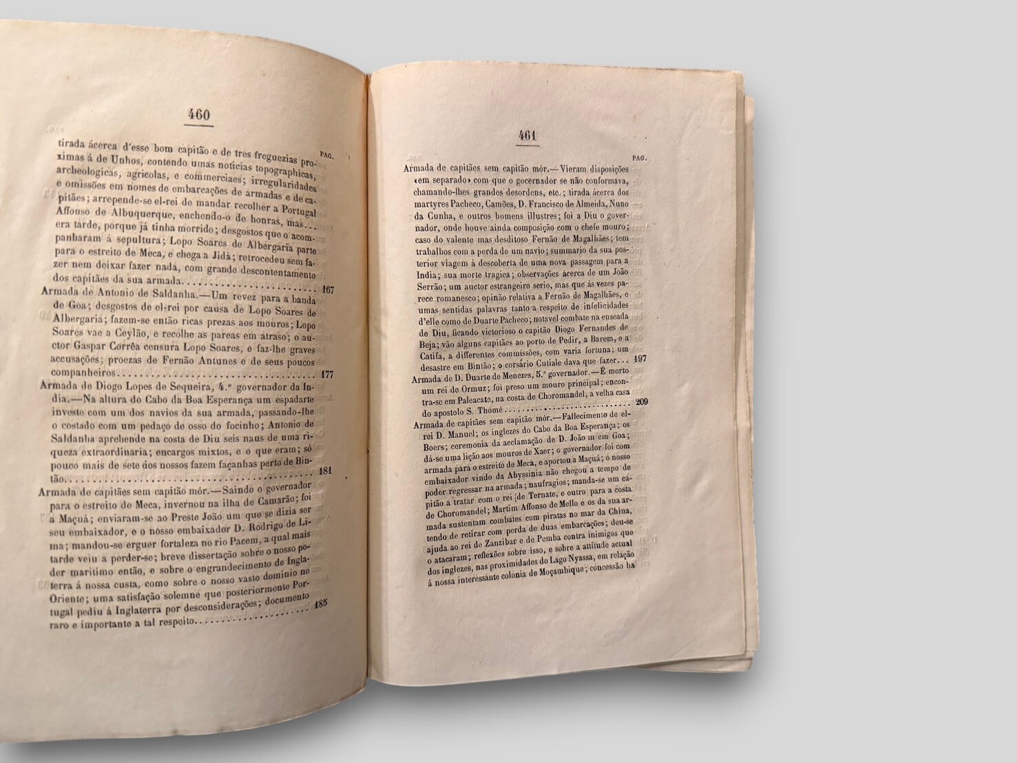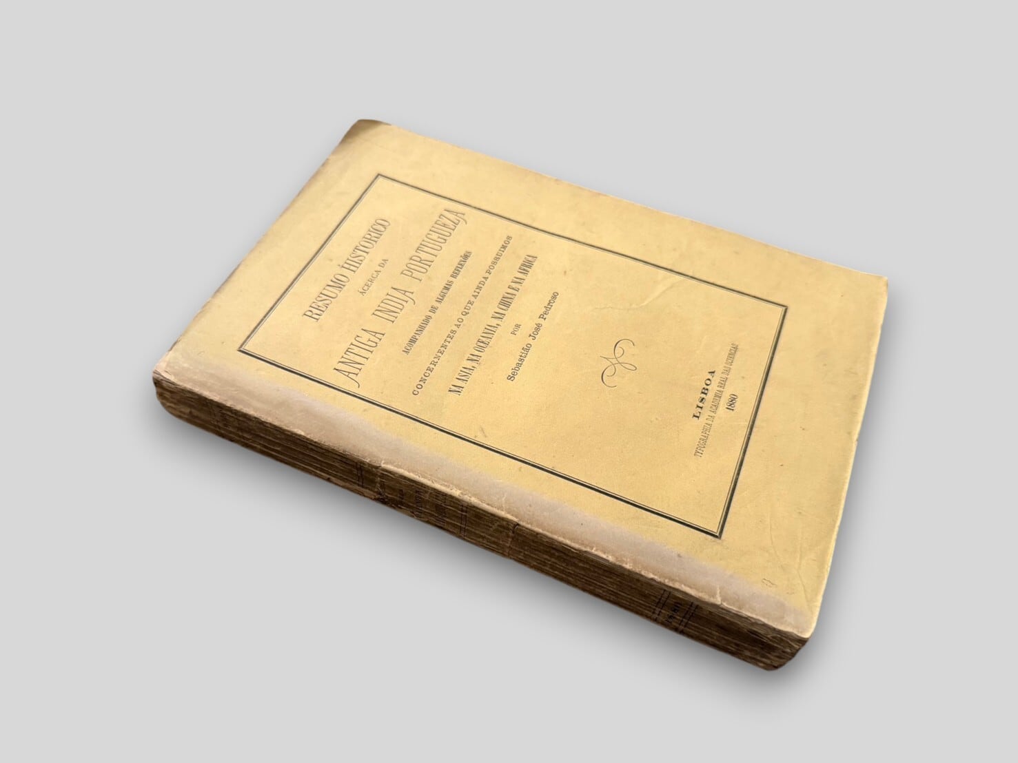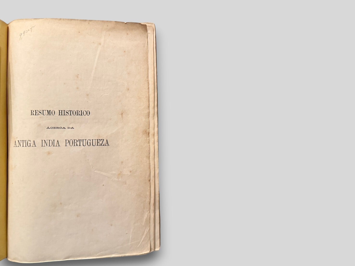 19世紀後半に刊行された、ポルトガルによるインド支配および関連地域に関する歴史記述書。インドを中心に、アジア、オセアニア、中国、アフリカにおけるポルトガルの活動について、出来事の記述と反省的言及を含めてまとめたテキスト。本文は航海や軍事行動、統治に関する事項ごとに整理され、連続的に記述される構成となっている。巻末には erratas(正誤表)が付されている。同時代の視点から書かれた記録であり、ポルトガルによる海外活動がどのように把握されていたかを示す資料である。表紙(wrapper)には1880年、タイトルページには1879年と記載されている。