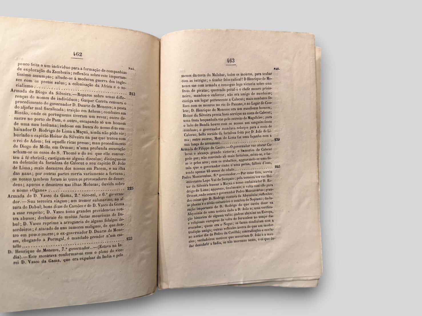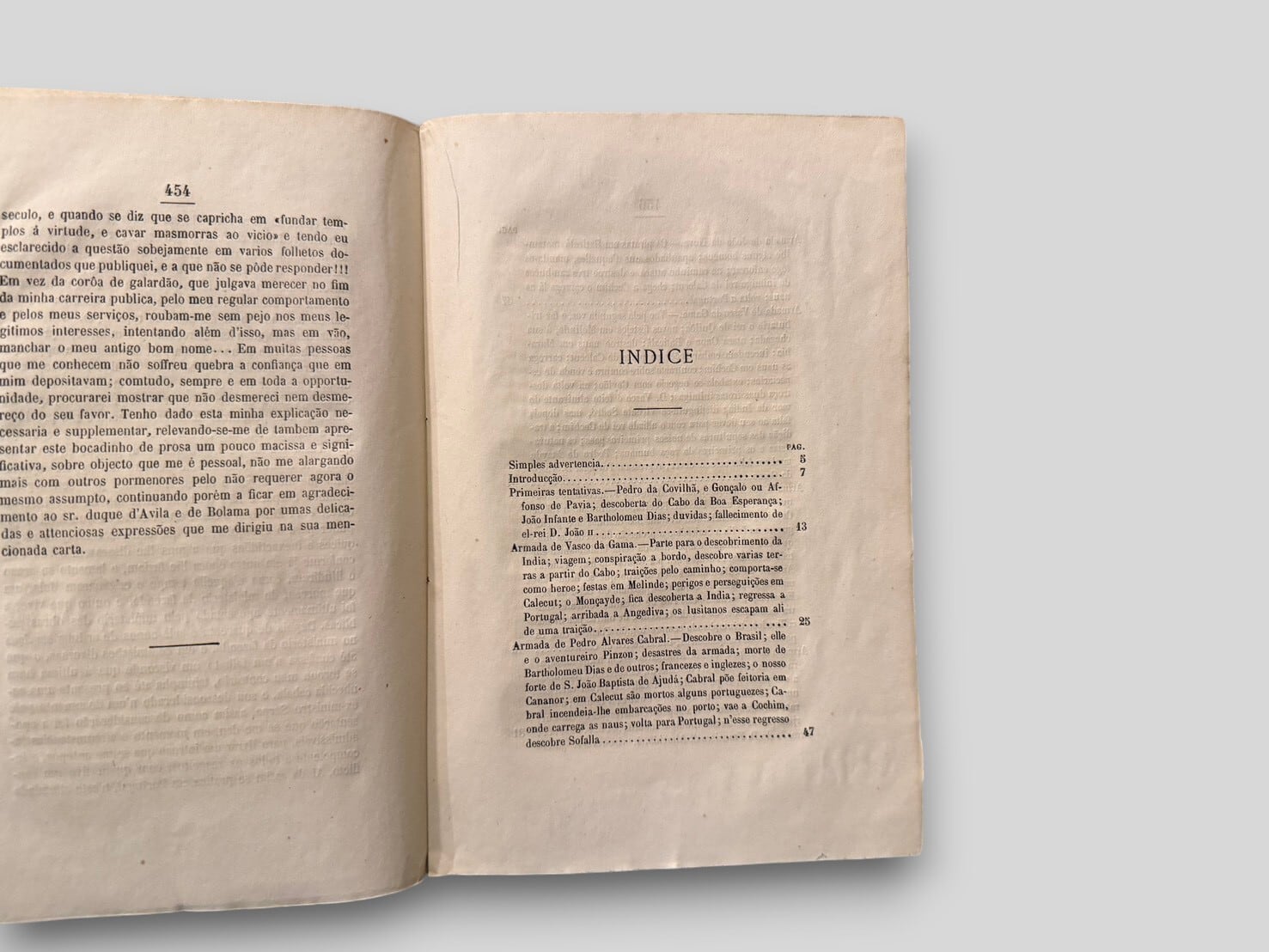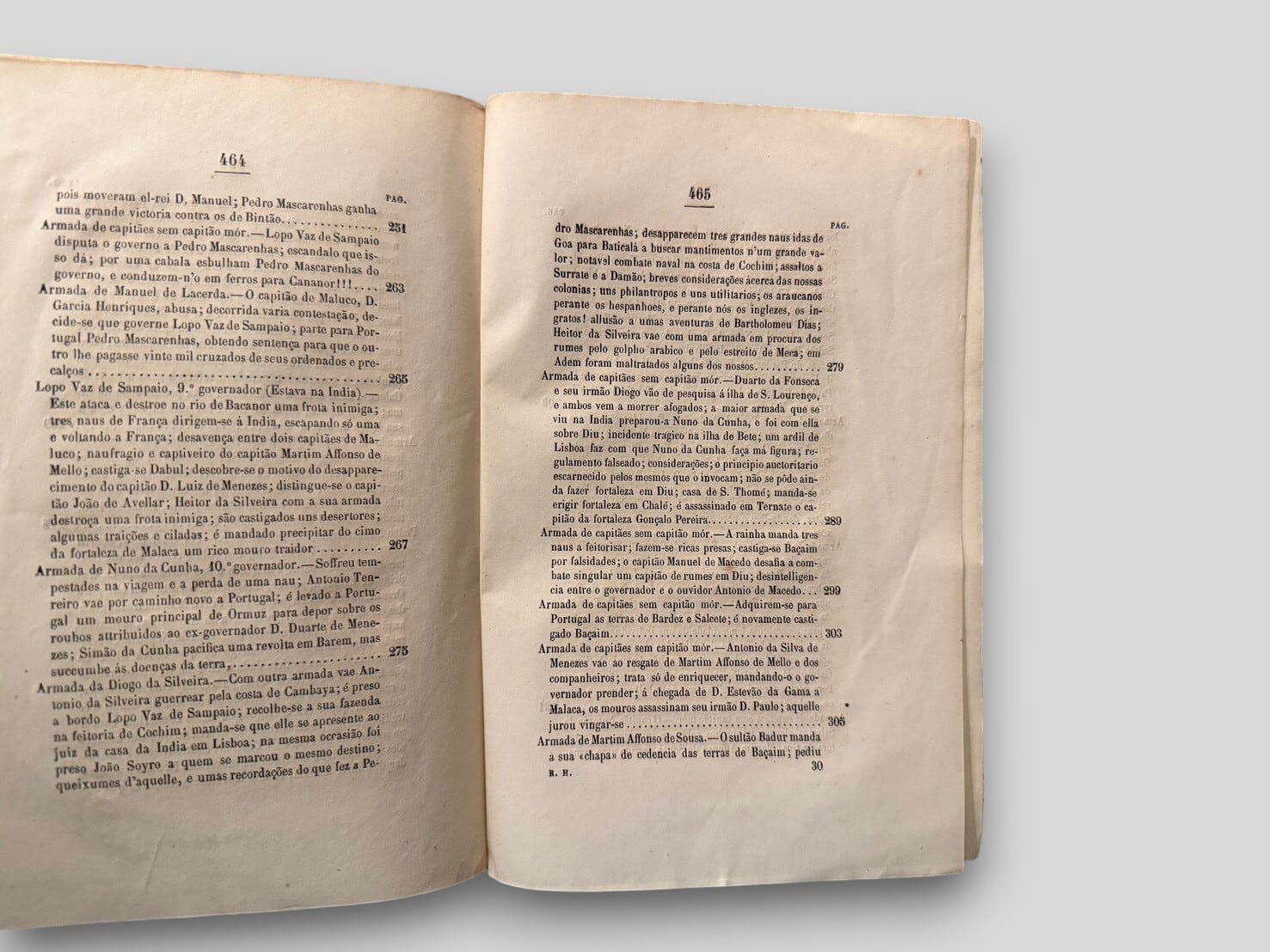 19世紀後半に刊行された、ポルトガルによるインド支配および関連地域に関する歴史記述書。インドを中心に、アジア、オセアニア、中国、アフリカにおけるポルトガルの活動について、出来事の記述と反省的言及を含めてまとめたテキスト。本文は航海や軍事行動、統治に関する事項ごとに整理され、連続的に記述される構成となっている。巻末には erratas(正誤表)が付されている。同時代の視点から書かれた記録であり、ポルトガルによる海外活動がどのように把握されていたかを示す資料である。表紙(wrapper)には1880年、タイトルページには1879年と記載されている。