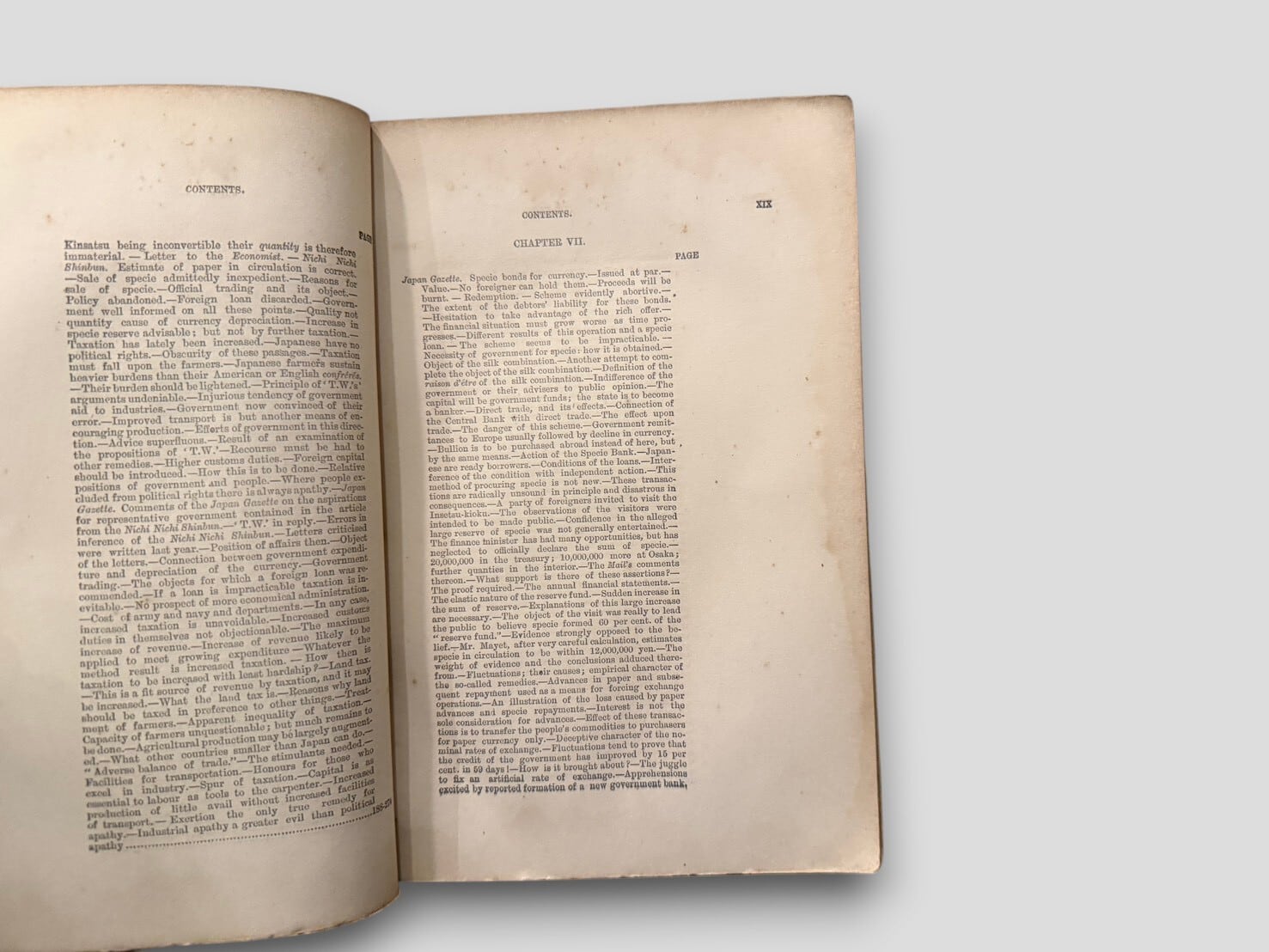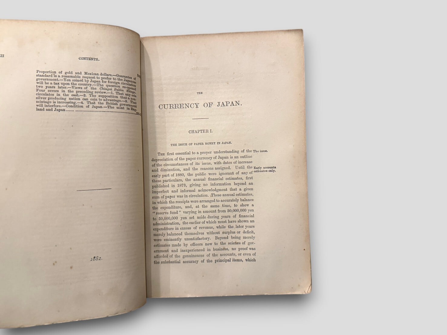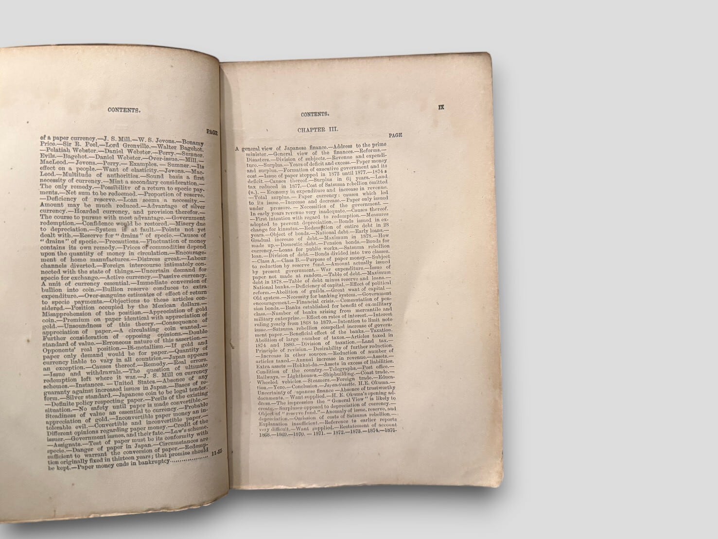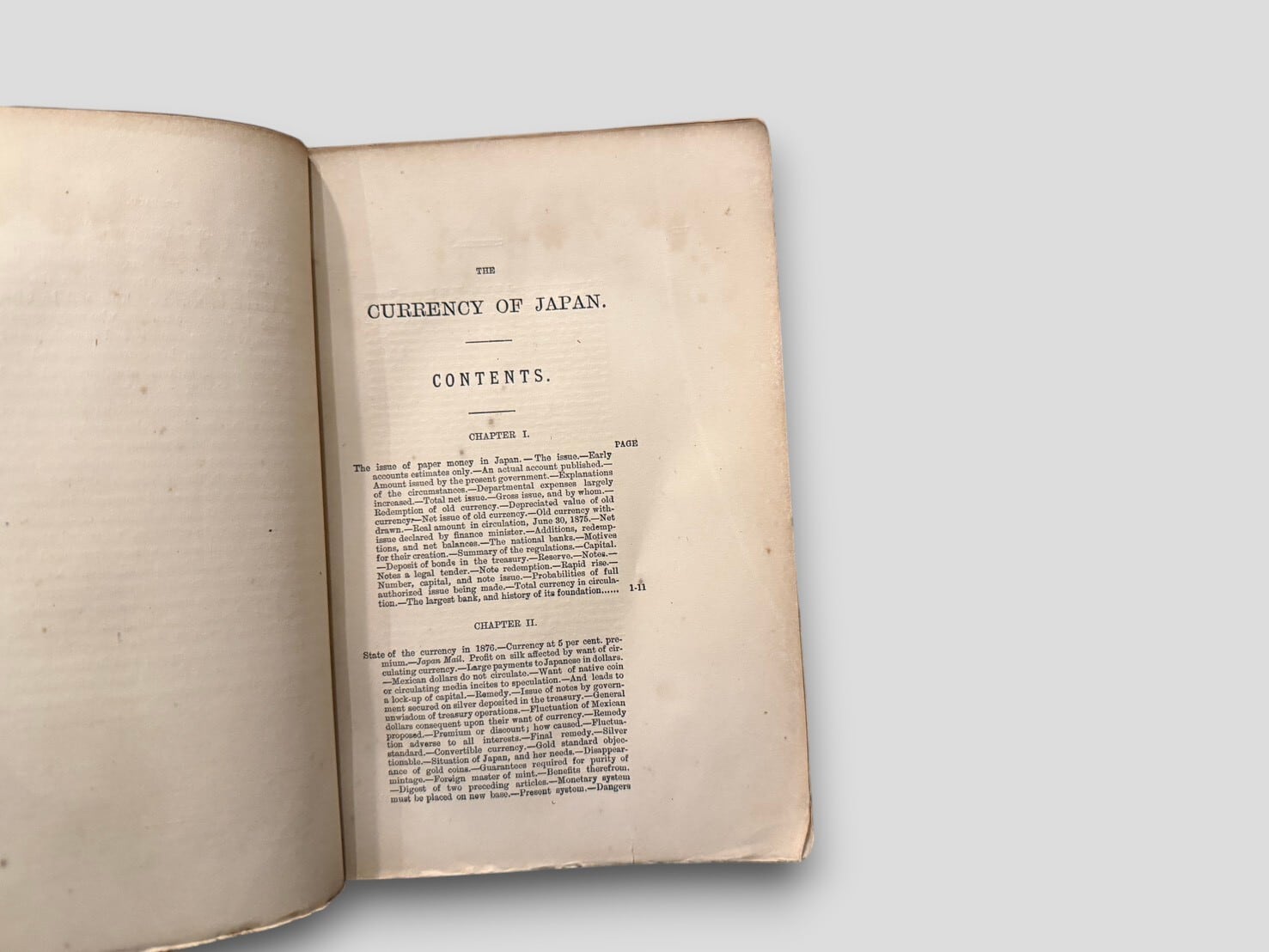 A collection of articles, letters, and official reports relating to the currency of Japan. It includes materials published in foreign newspapers in Japan together with translations from Japanese journals. The volume is organized into chapters covering monetary policy and finance.