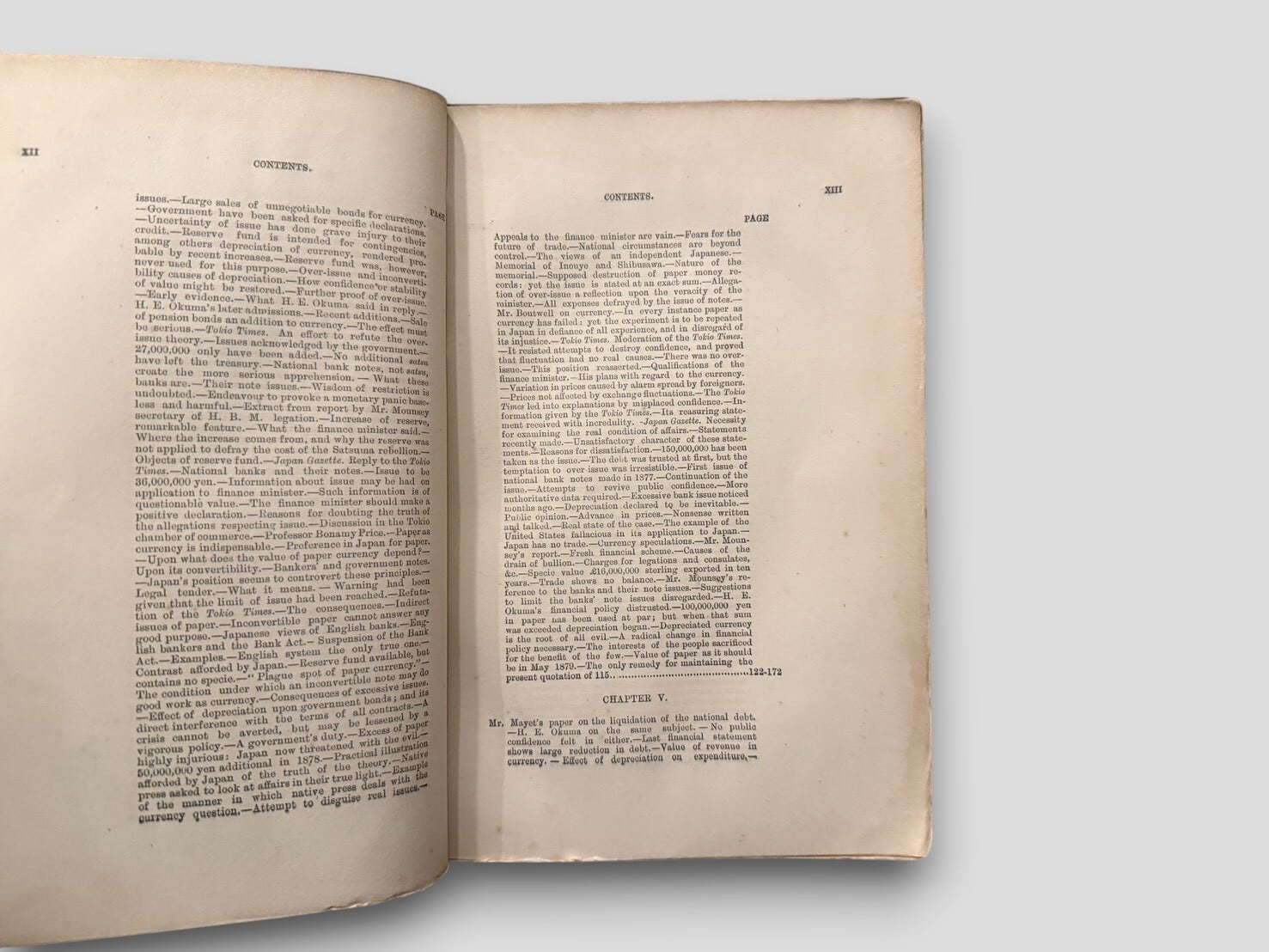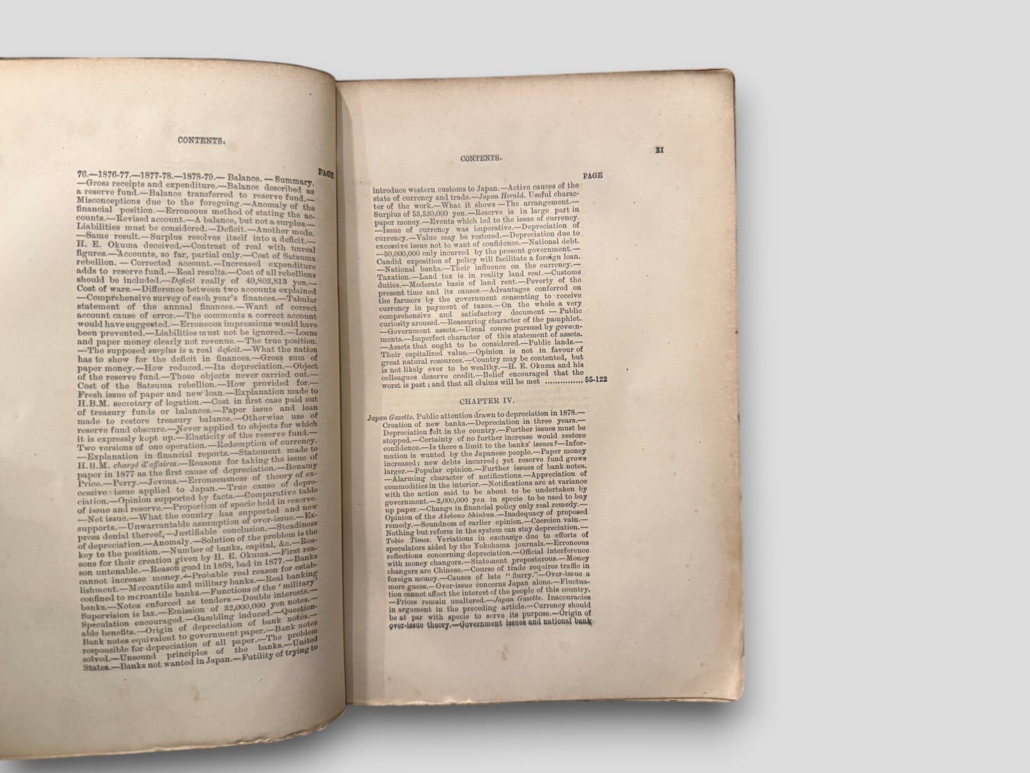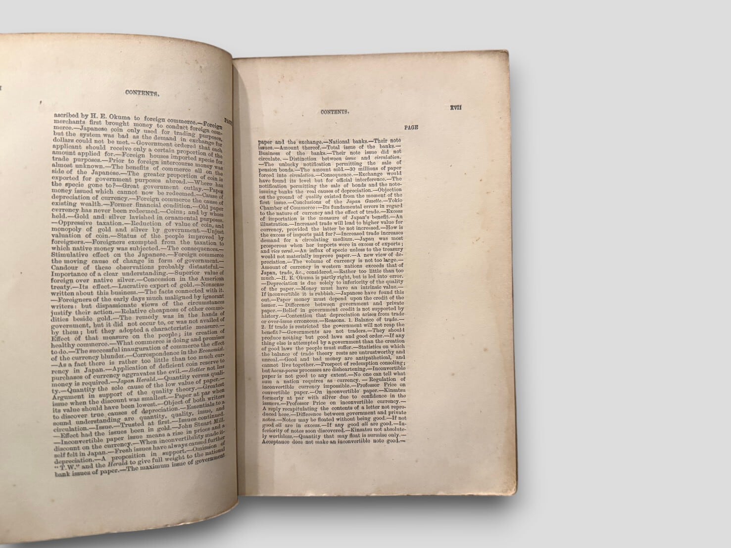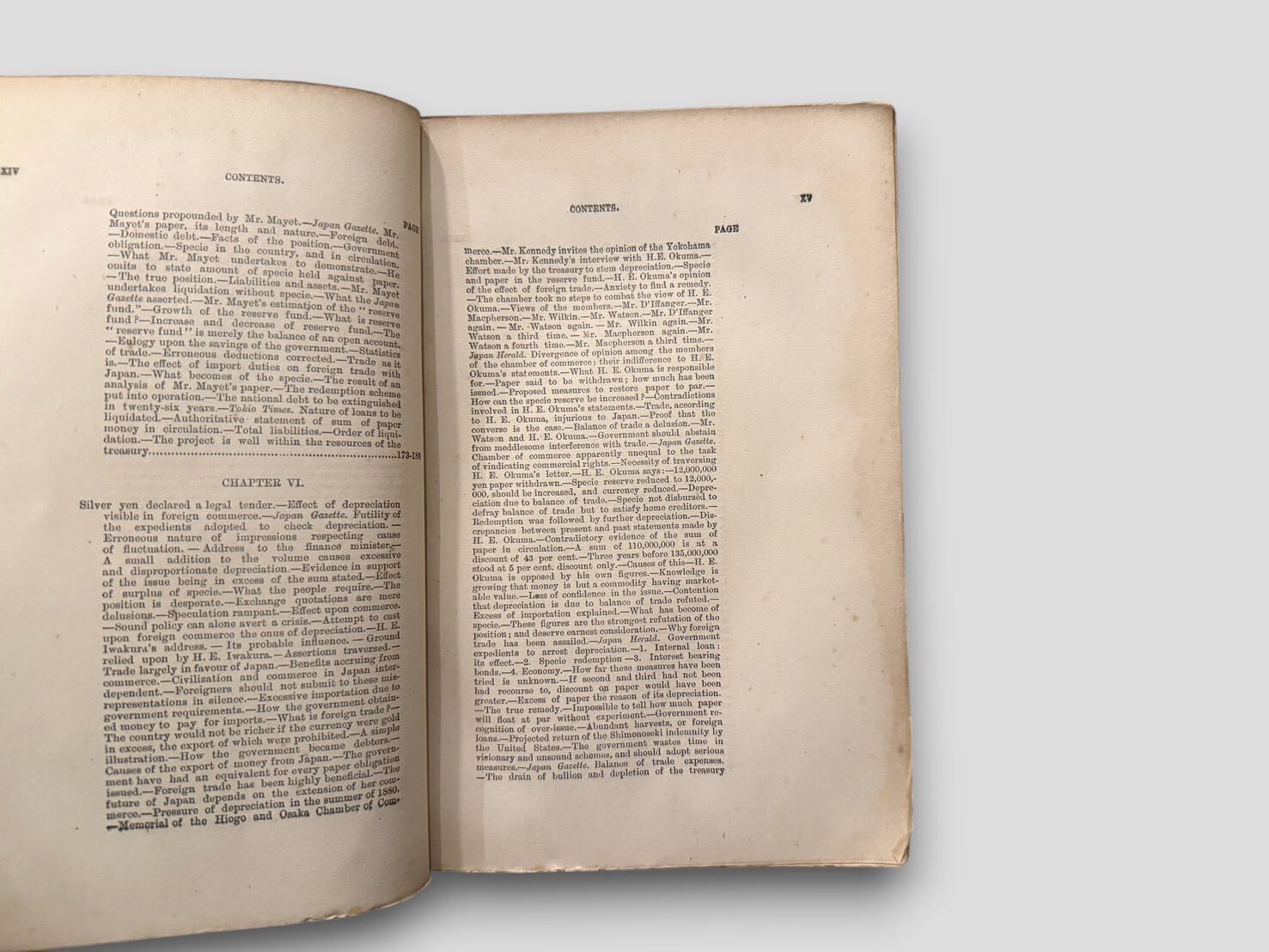 A collection of articles, letters, and official reports relating to the currency of Japan. It includes materials published in foreign newspapers in Japan together with translations from Japanese journals. The volume is organized into chapters covering monetary policy and finance.