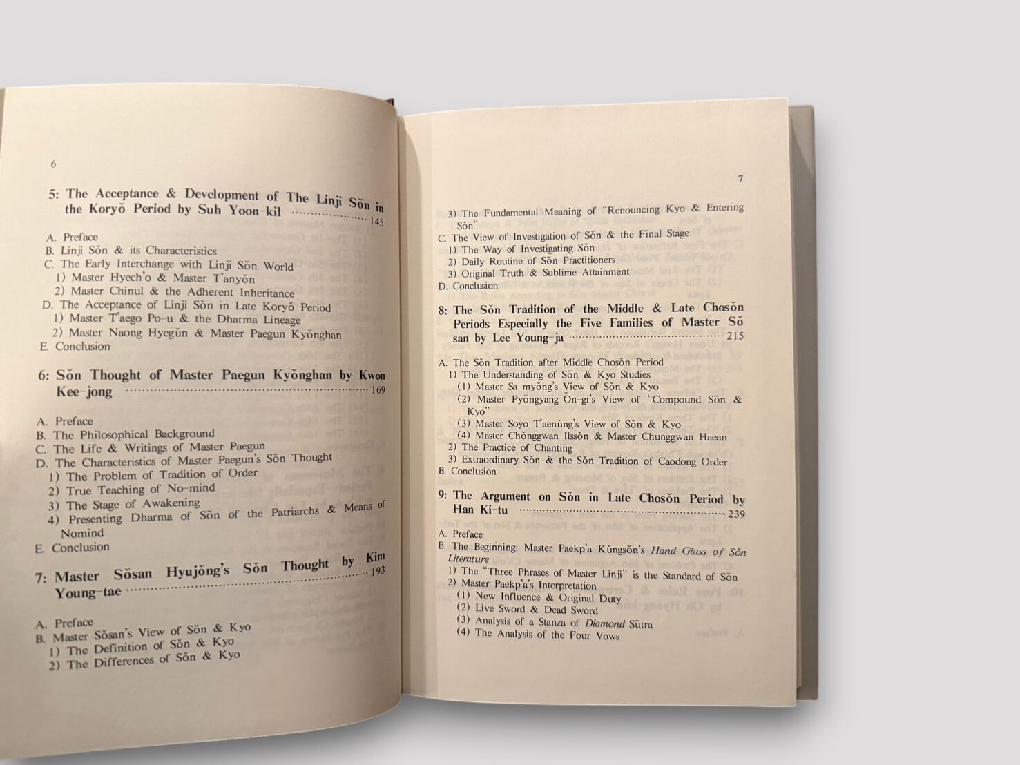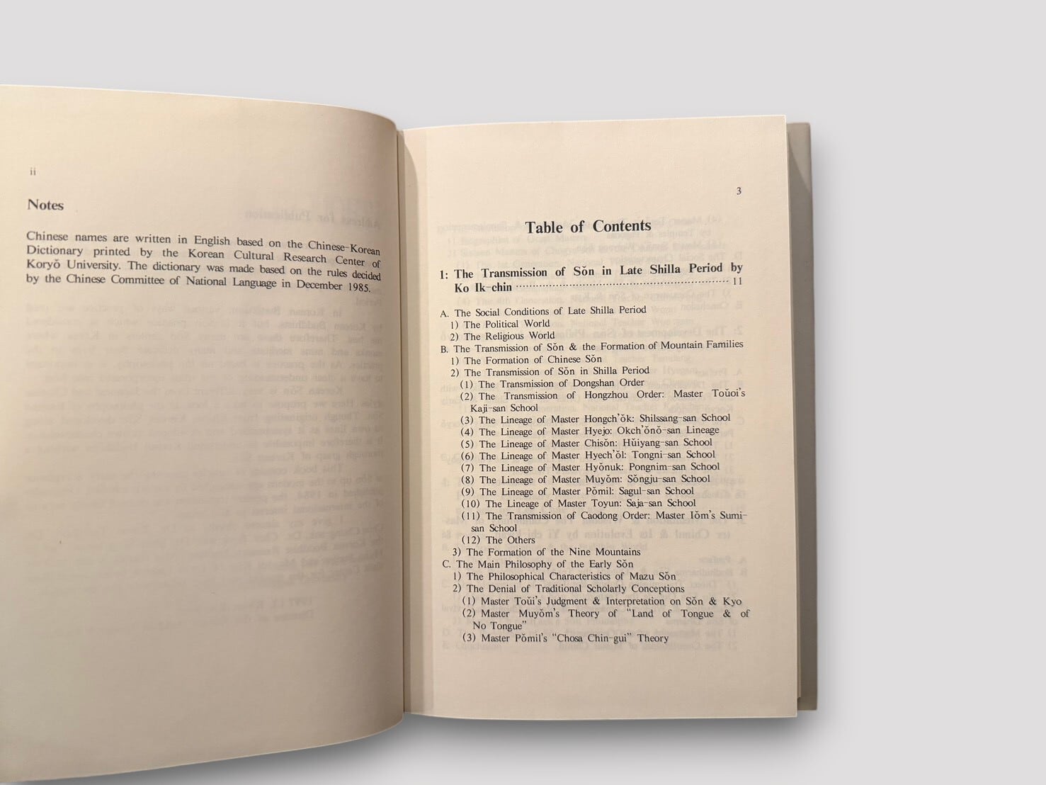 韓国仏教における禅(Sŏn)思想の展開を、時代ごとに整理した研究論集。韓国仏教研究機関によって編まれた論文集であり、三国時代から高麗・朝鮮期、さらに近代に至るまでのSŏn思想の受容と発展を扱う。、九山禅門の形成、中国禅との関係、知訥(Chinul)の思想と実践、臨済系禅の受容、朝鮮後期における禅の展開など、複数の論考によって構成されている。禅思想を歴史的文脈の中で捉え、その展開を個別研究の積み重ねとして提示する一冊である。