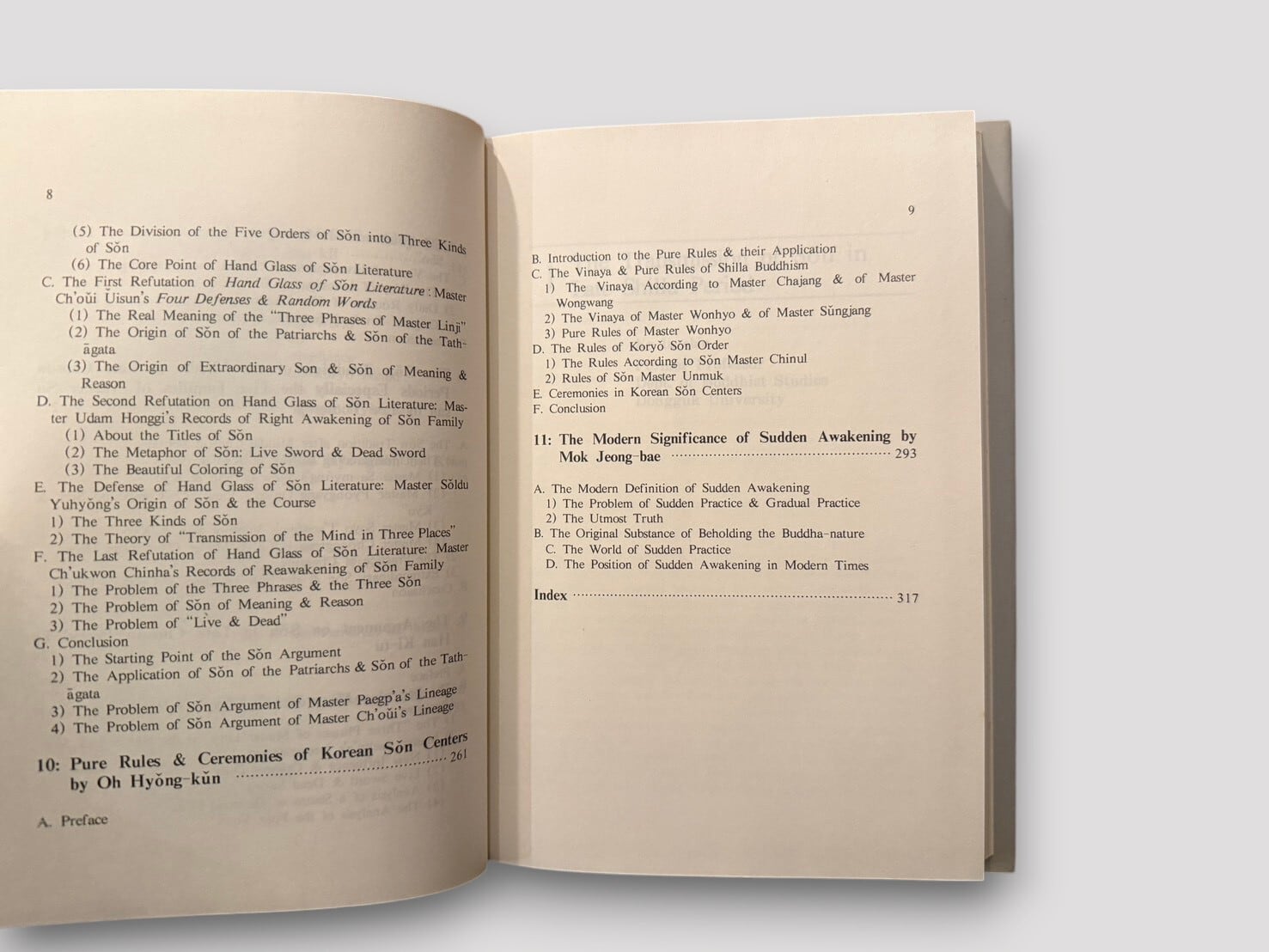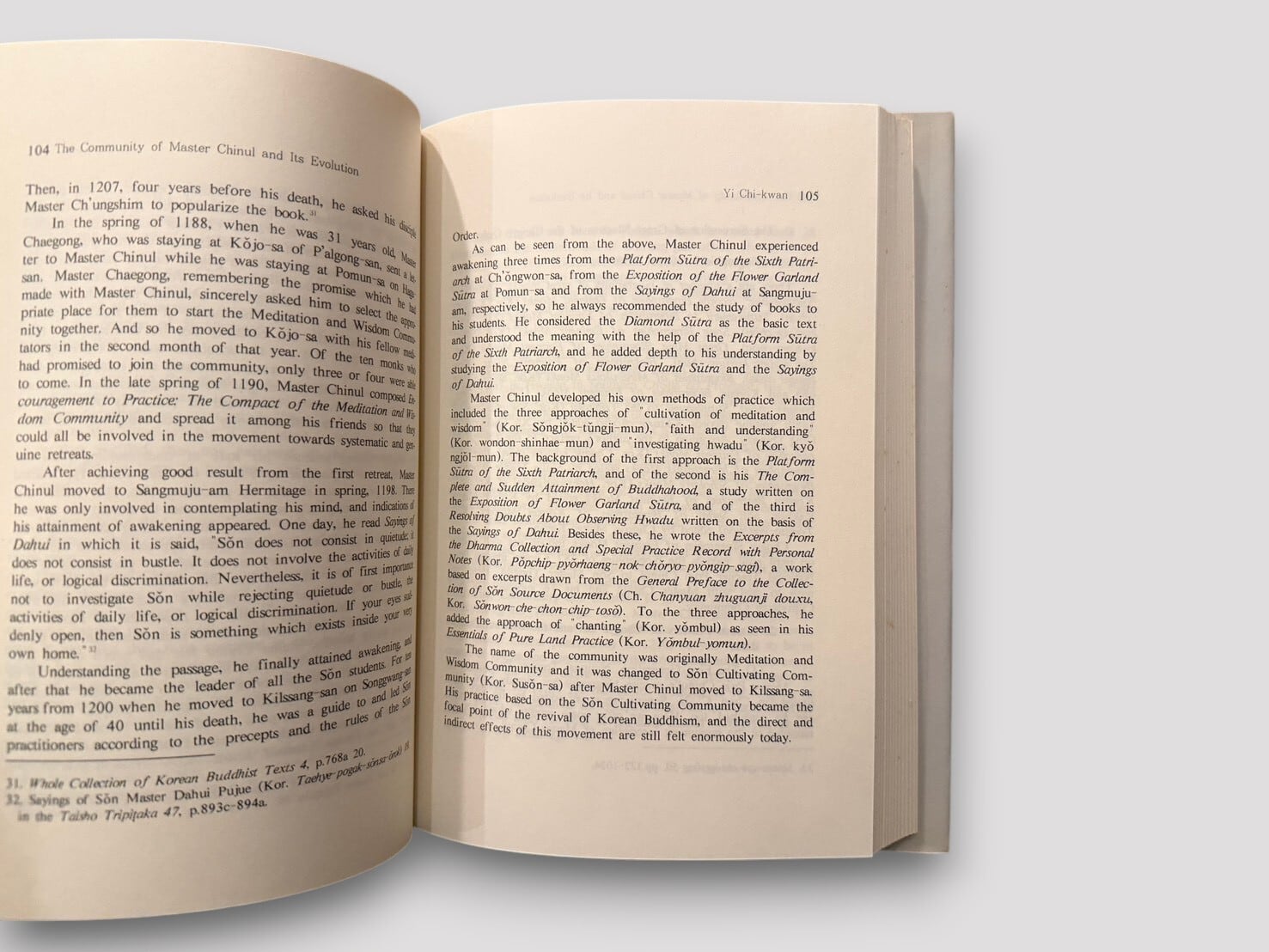 A scholarly volume on Sŏn thought in Korean Buddhism, edited by the Korean Buddhist Research Institute. It examines the development of Sŏn traditions from early periods to modern times, including studies on Chinul, the Nine Mountains Sŏn, and later developments. The book consists of essays addressing doctrinal, historical, and institutional aspects.