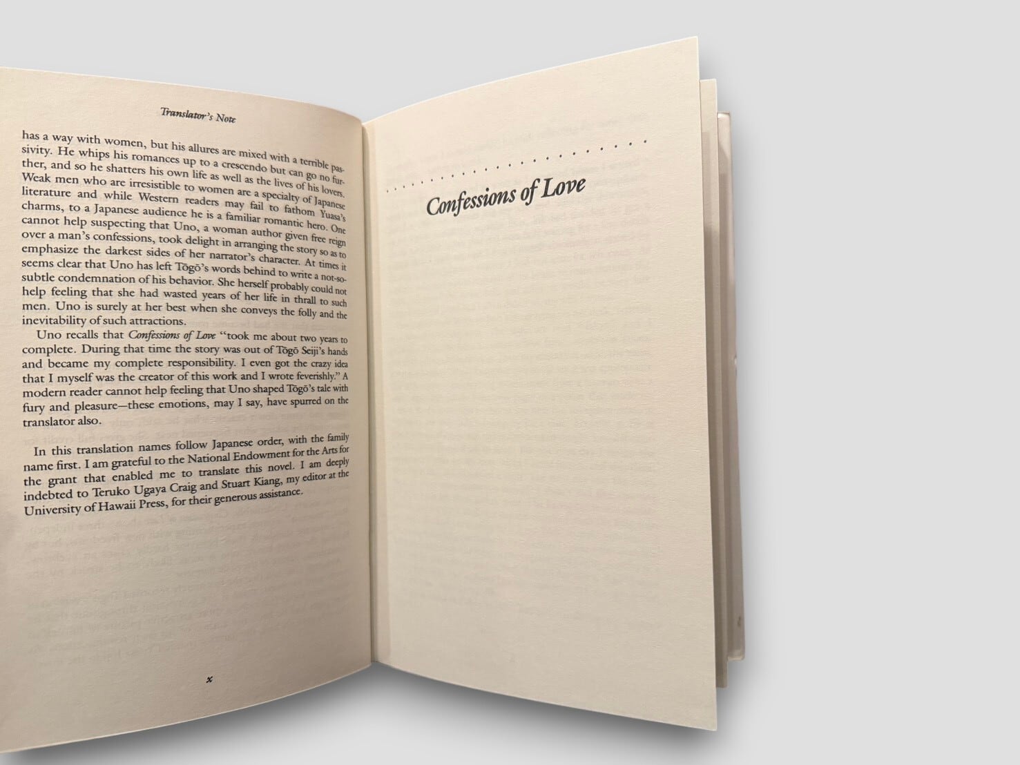告白形式で語られる恋愛の物語であり、一人の男性の語りを通して複数の関係が重ねられていく構成を持つ。作中の人物像については、画家・東郷青児との関係がしばしば指摘されている。作品は、情熱や執着といった感情の動きとともに、人間関係の不均衡や欲望のあり方を描く。語りの形式によって、出来事そのものよりも、その記憶と解釈の重なりが前景化されている点に特徴がある。宇野千代の作品を英語圏に紹介する主要な翻訳の一つ。巻頭にはTranslator's Noteが収録されている。