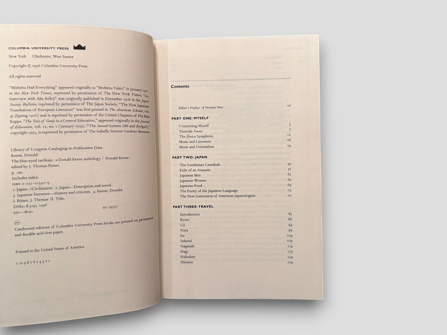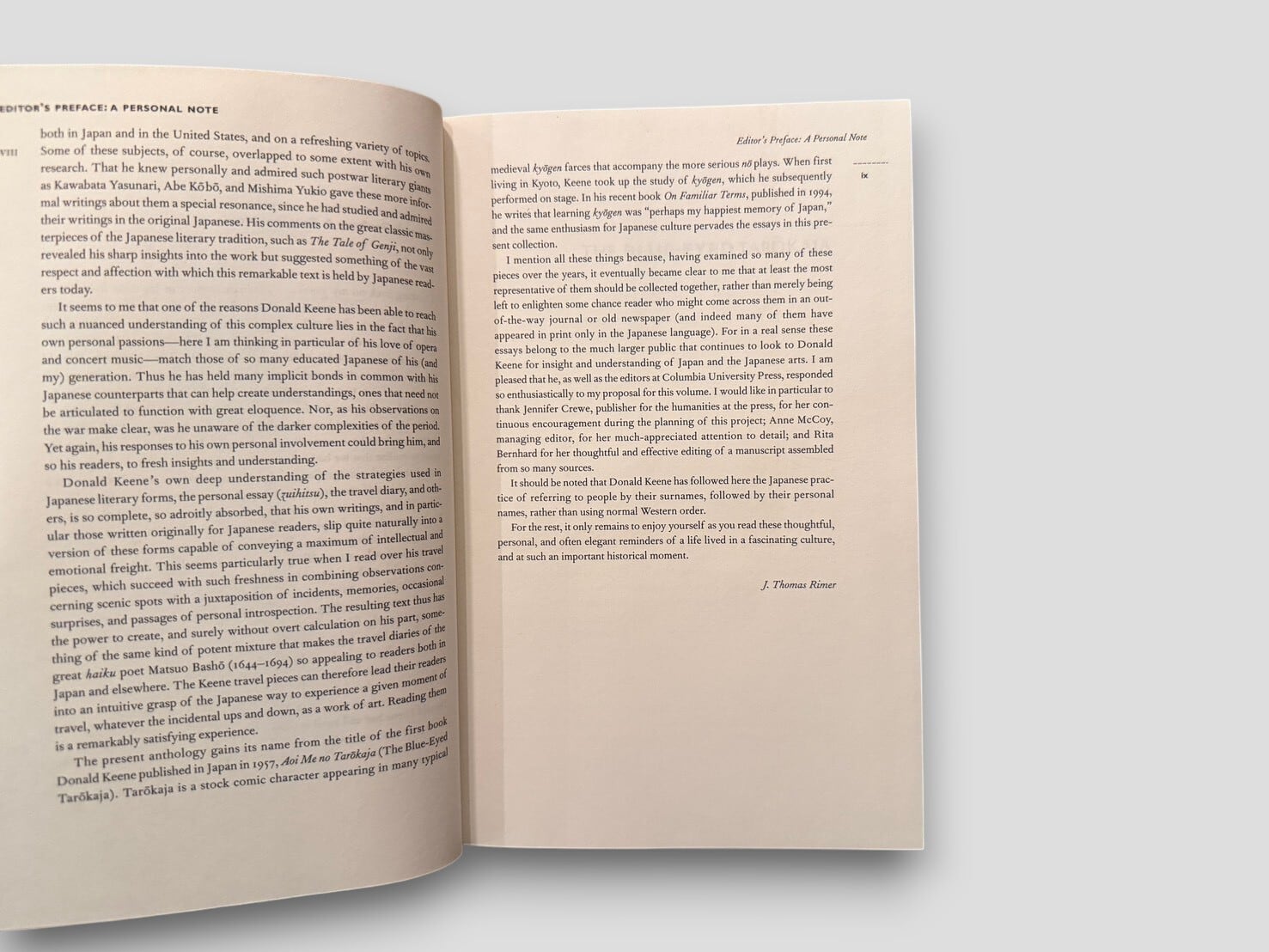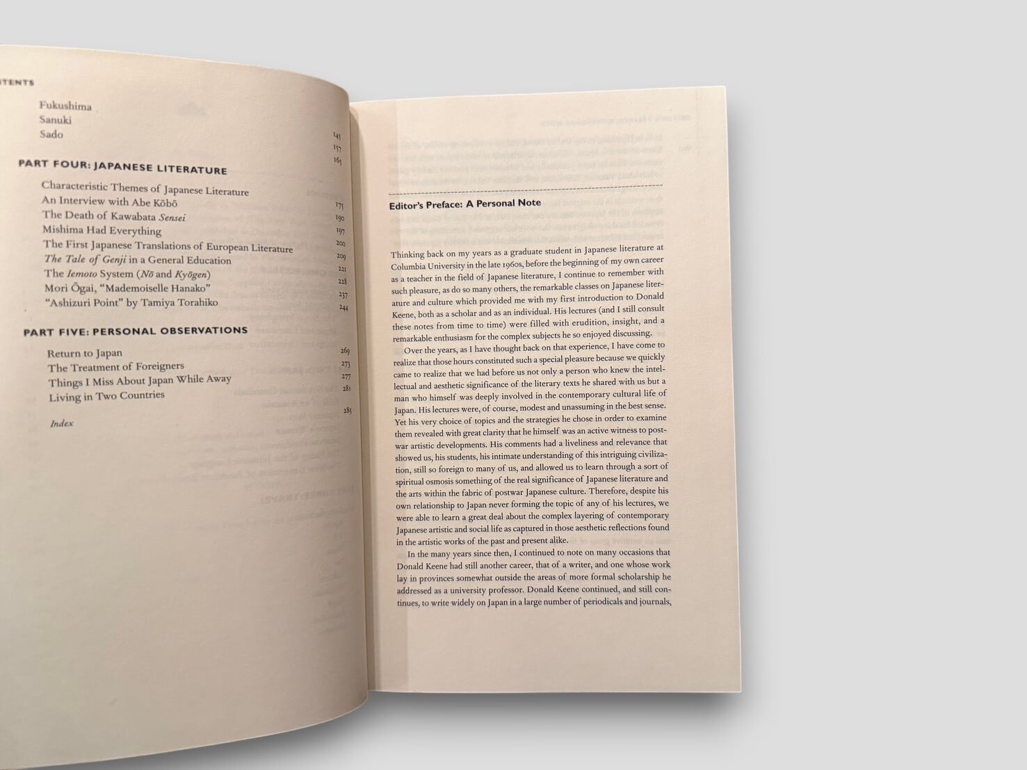収録内容は、日本文学、翻訳、演劇、音楽、日本文化に関する考察、ならびに個人的回想などにわたる。各テキストは、文学作品そのものだけでなく、それを取り巻く文化や人間関係にも目を向けたものとなっている。構成は5部に分かれ、"Myself"、"Japan"、"Travel"、"Japanese Literature"、"Personal Observations"といった主題ごとに整理されている。英語圏における日本文学受容の一側面を示す重要な1冊。1996年刊行初版。