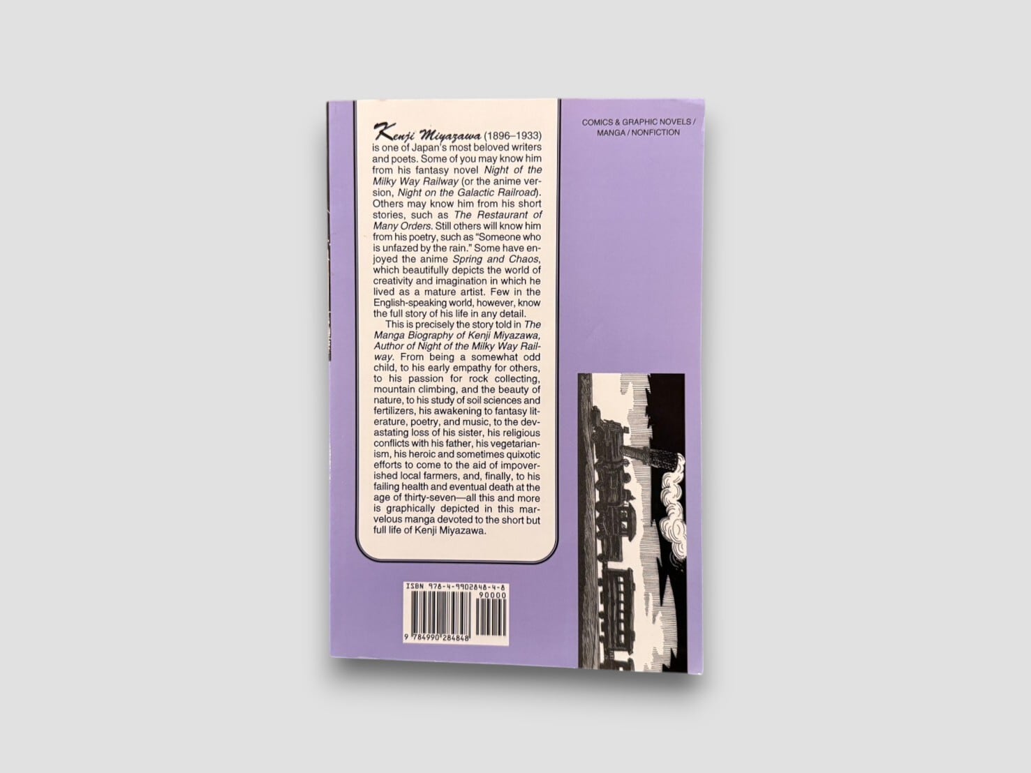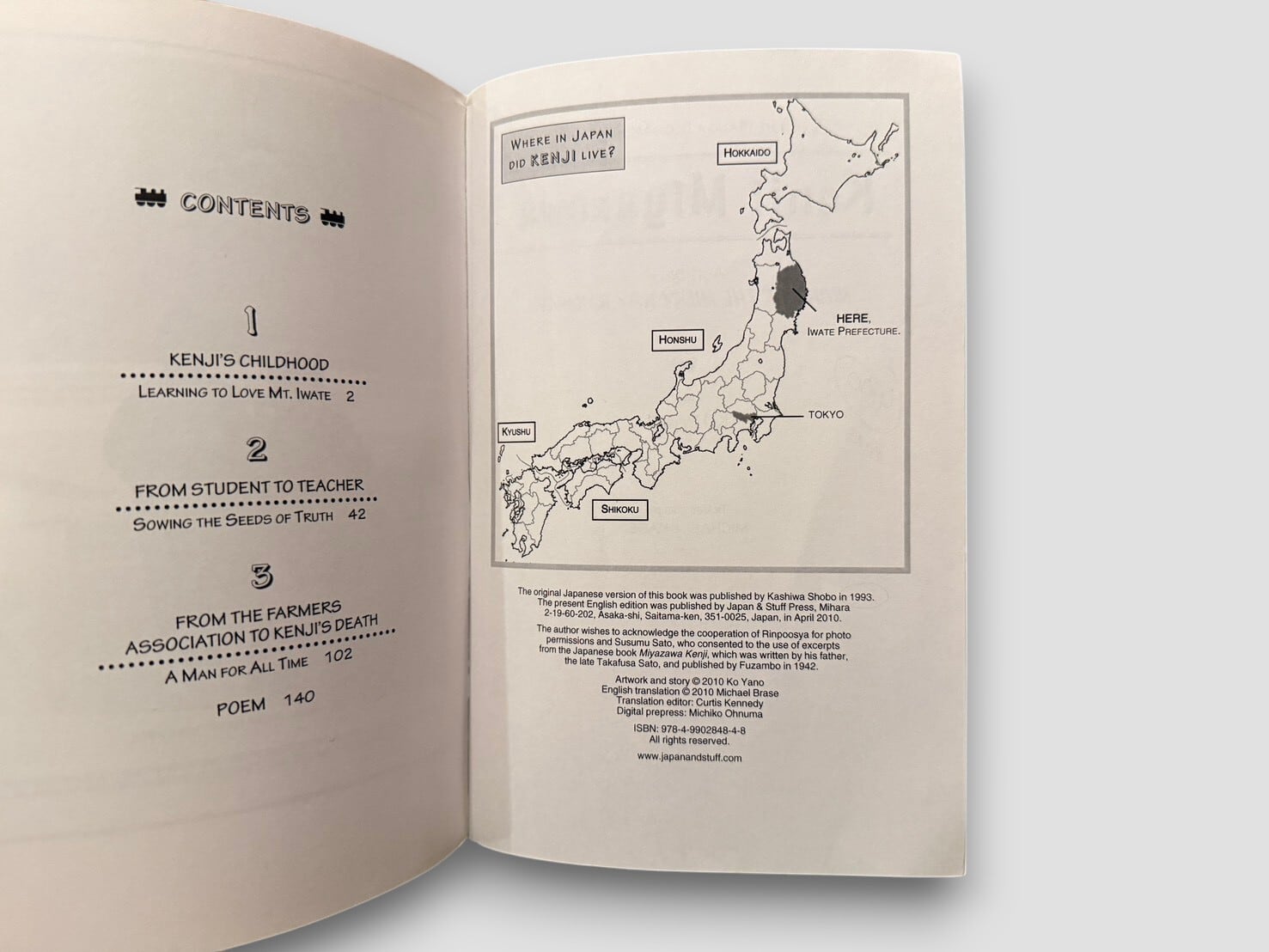 宮沢賢治(1896-1933)の生涯を、マンガ形式で描いた英語版伝記。『銀河鉄道の夜』などで知られる日本文学の作家を、視覚的かつ平易な語りで紹介する構成となっている。幼少期から晩年までの歩みが章立てで整理され、地図や図版を交えながら、岩手での生活、思想、農民との関わり、宗教観などが簡潔に描かれる。文学作品そのものの読解というよりも、人物像への導入として設計された一冊。