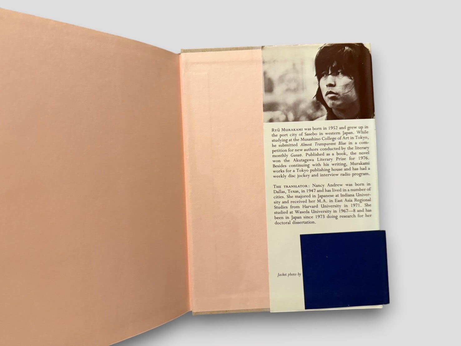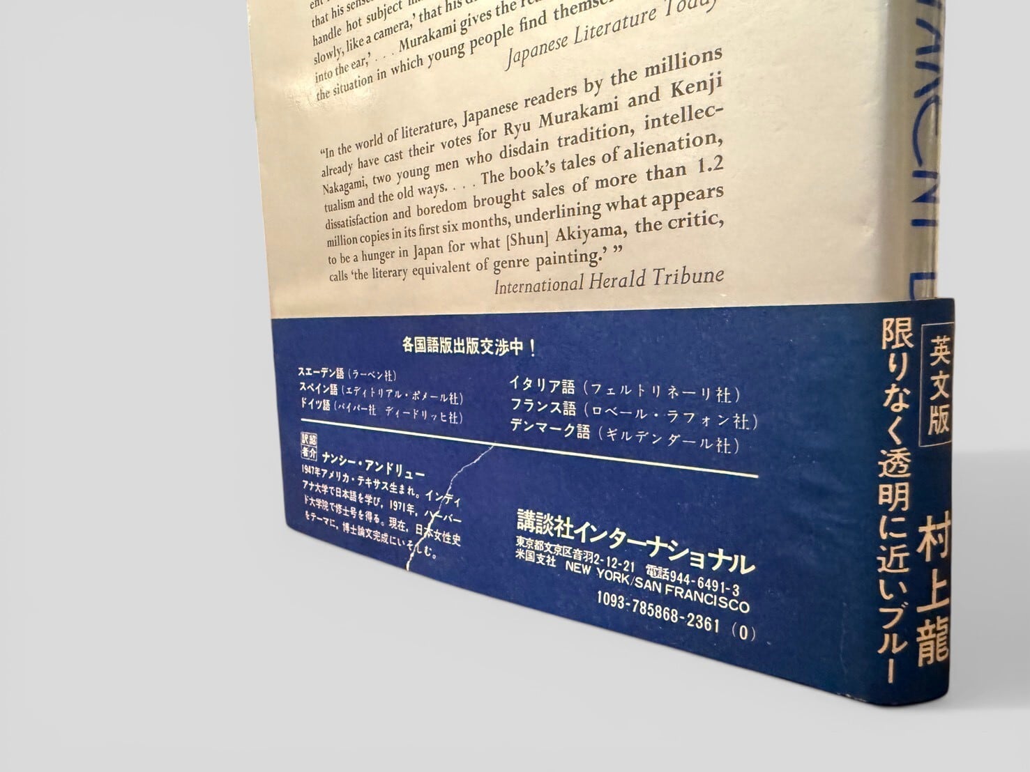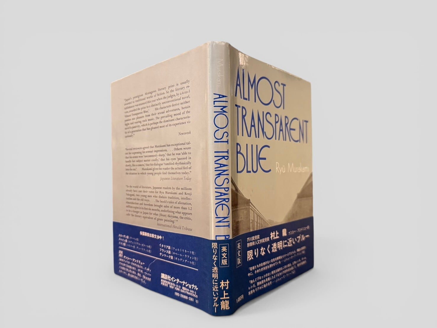 戦後日本の若者文化を鋭く描いた作家である村上龍のデビュー作『限りなく透明に近いブルー』英訳本。本作は芥川賞受賞作として知られ、当時の若者の生活や感覚を、極めて直接的な筆致で描いた作品である。本書はその英訳版として、刊行直後の反響を背景に比較的早い段階で海外に紹介されたものとなる。