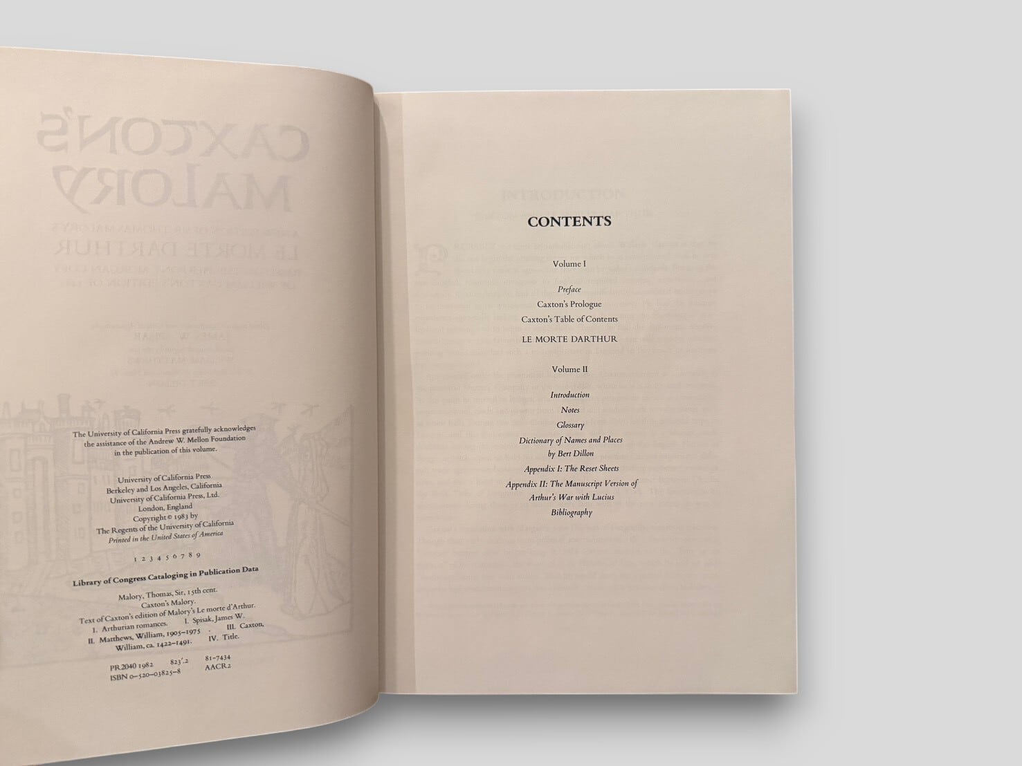中世イングランド文学における騎士道物語の一つとして知られる『Le Morte Darthur』(アーサー王の死)校訂版。本書は、ウィリアム・キャクストンによる1485年の印刷版を底本とし、ピアポント・モルガン図書館所蔵のキャクストン版に基づいて校訂された版である。構成は2巻からなり、注解、用語集、固有名詞辞典などが付されている。オリジナルスリップケース付き。