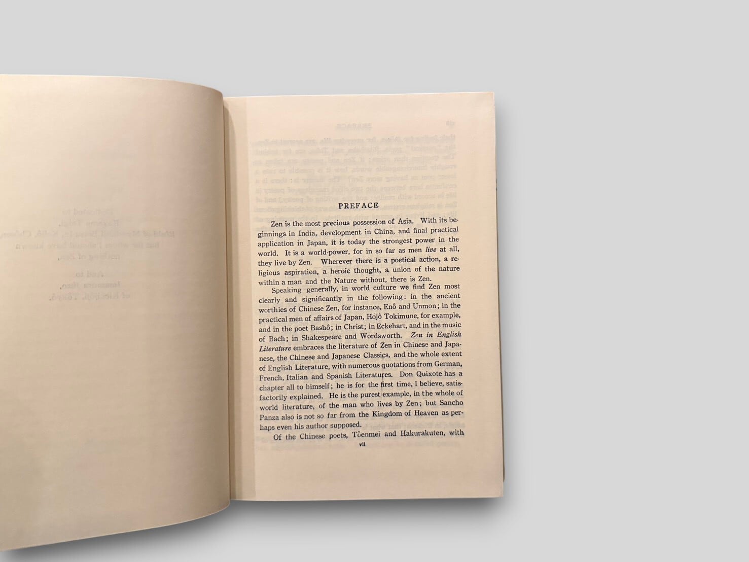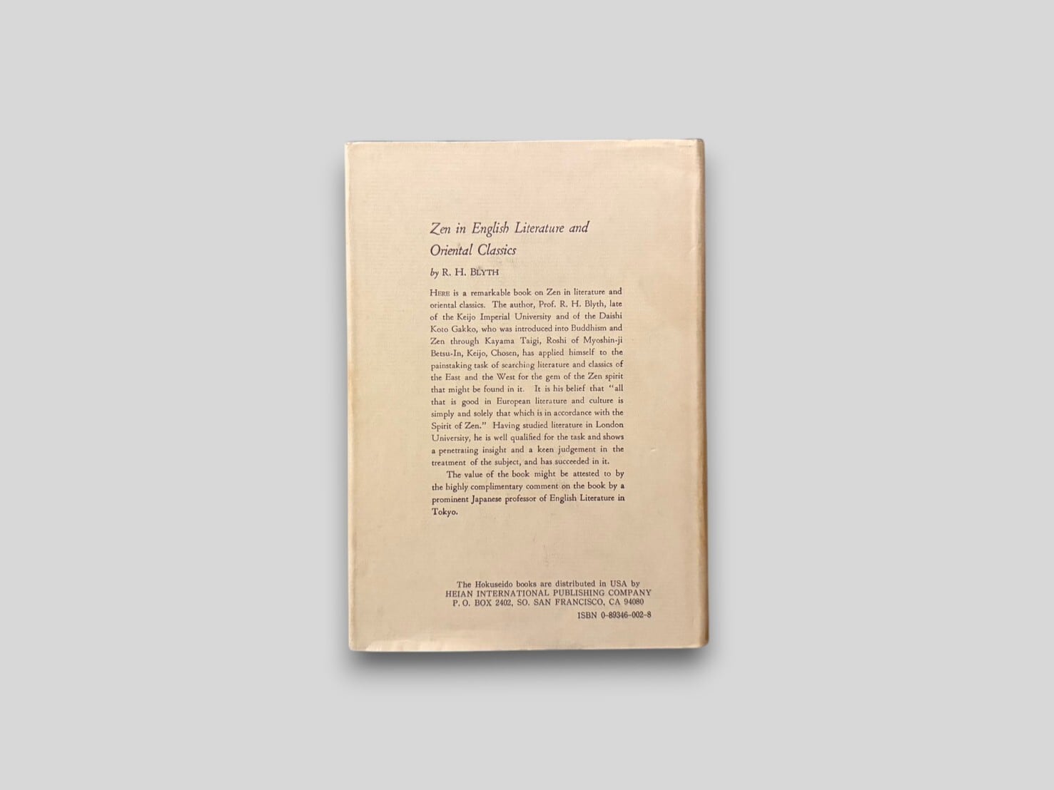 英文学者のR. H. ブライスによる『禅と英文学』。禅という東洋思想を、英文学を通して読み解こうとした一冊である。シェイクスピアやワーズワースなどの作品を素材に、「What is Zen」「Religion is Poetry」「Words, Words, Words」といった主題ごとに議論が展開される。詩や散文の引用を交えながら、言葉や表現のあり方が検討されている。禅と文学の関係を、英語のテキストを通して考える本書は1942年初版の後に重版を重ねた第15版にあたる。