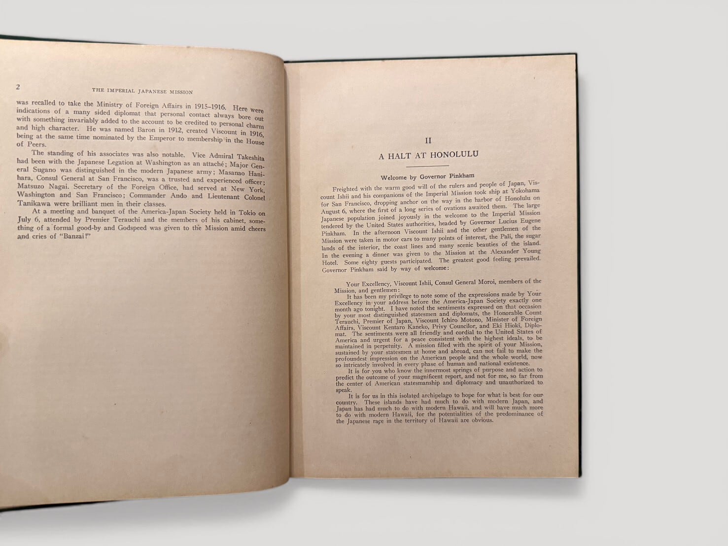 国際平和基金カーネギー財団による、1917年の日本使節団訪米を記録した刊行物。1917年の日本帝国使節団の訪米を記録資料から整理ている。石井菊次郎を団長とする特派使節団の訪米に際して行われた演説、歓迎行事、各都市での応答などを収録しており、当時の外交関係を記録として確認できる1冊。