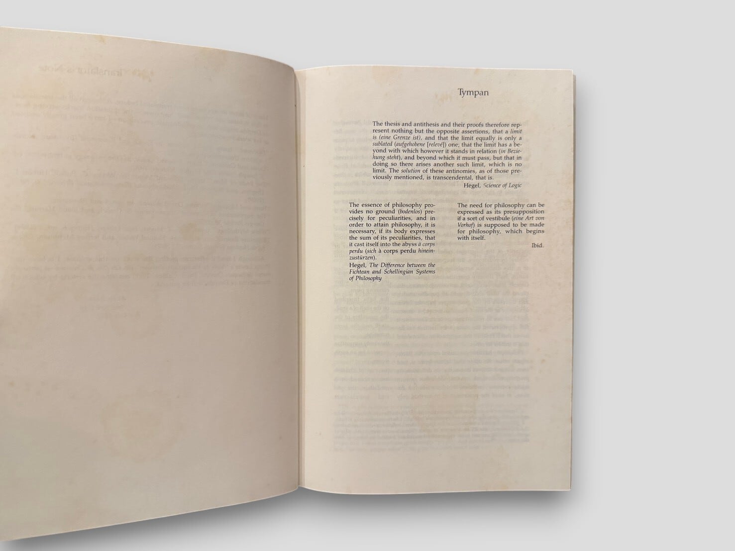 20世紀後半の思想を決定的に変えた哲学者ジャック・デリダによる論文集。1960年代後半から1970年代初頭にかけて発表された論考を収録し、形而上学・言語・哲学の枠組みを問い直す試みを展開する一冊である。「差延(différance)」や「境界(margin)」といった概念を通じて、西洋哲学の前提そのものに揺さぶりをかける構成となっている。個々の論考は独立しつつも、全体としてデリダ思想の展開を示す重要な位置を占める。本書は英訳版としてAlan Bassによる翻訳と注を備え、デリダ思想の受容において基準的な版として広く参照されている。