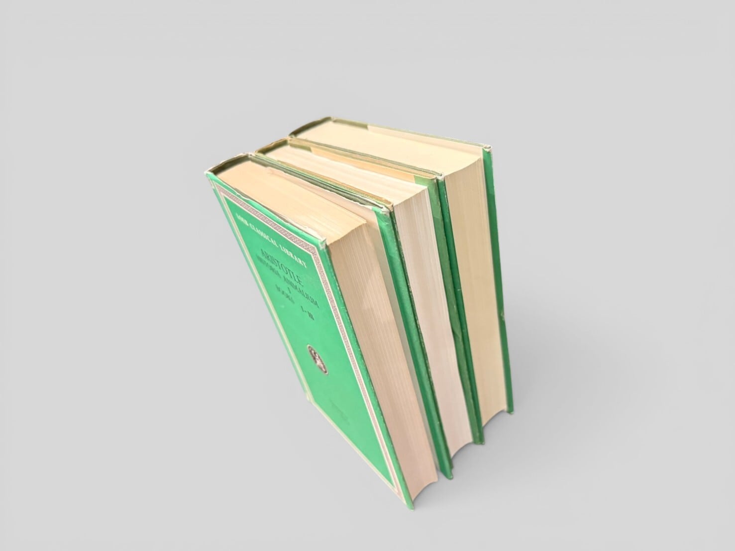 A complete three-volume Loeb Classical Library set presenting Aristotle's Historia Animalium in Greek with English translation.