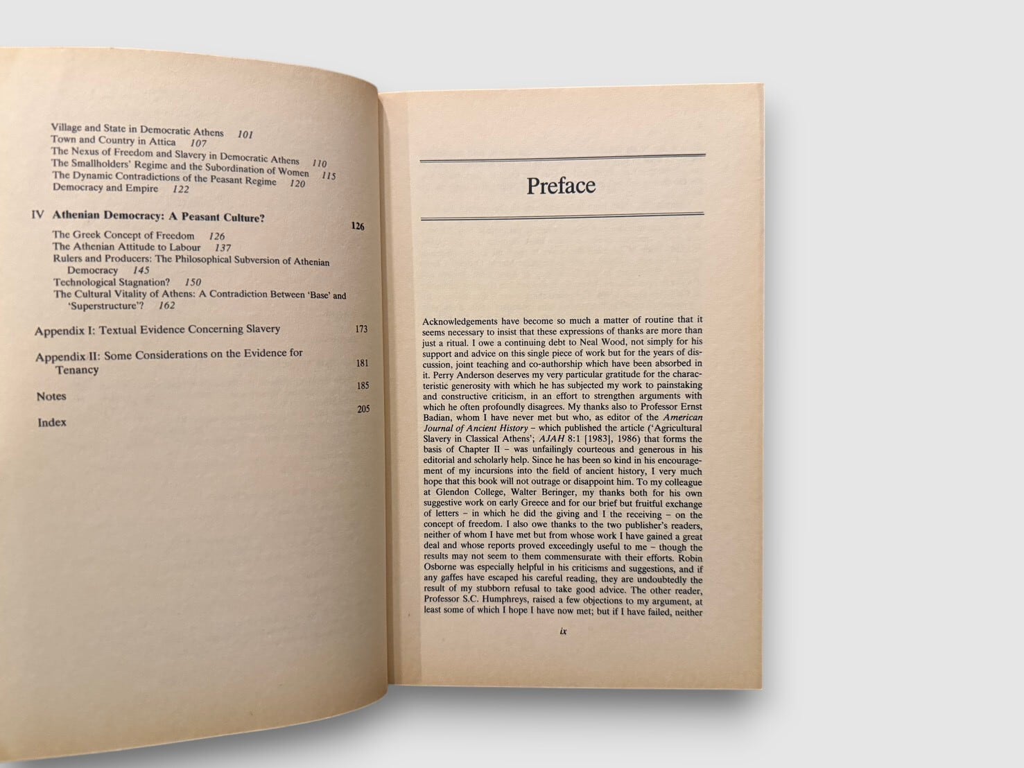 本書では、アテナイ社会における市民、農民、奴隷の位置づけを軸に、民主政を支える社会的関係を扱っている。構成は、Preface、Introductionに続き複数章、Appendix、Notes、Indexから成る。1989年修正版ペーパーバック版。
