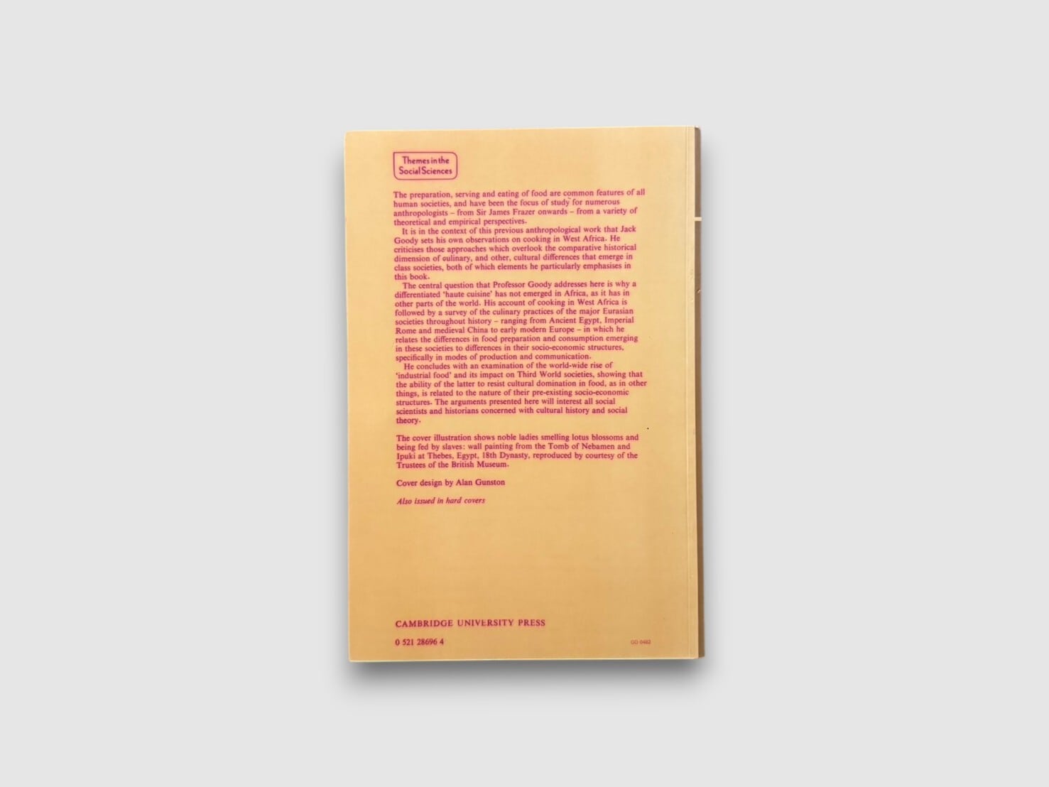 イギリスの人類学者ジャック・グディによる、食文化と社会構造の関係を比較の視点から扱った研究書。本書では、調理や食事の実践と社会的な階層や構造との関係を主題とし、複数の地域や事例を参照しながら論じている。1982年刊行ペーパーバック版。