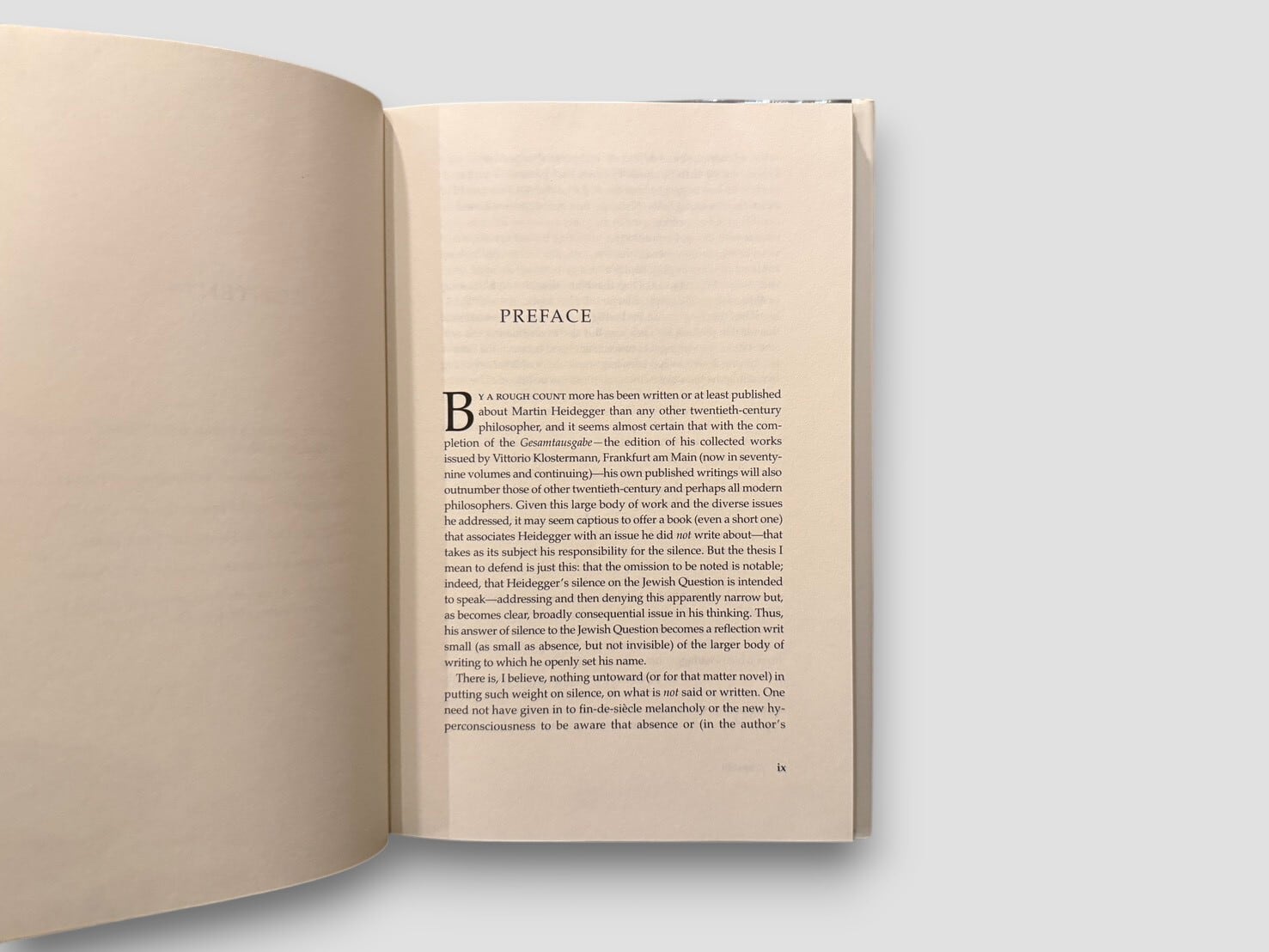 A philosophical study by Berel Lang examining Martin Heidegger's silence, particularly in relation to the Jewish Question and the ethical implications of that silence.