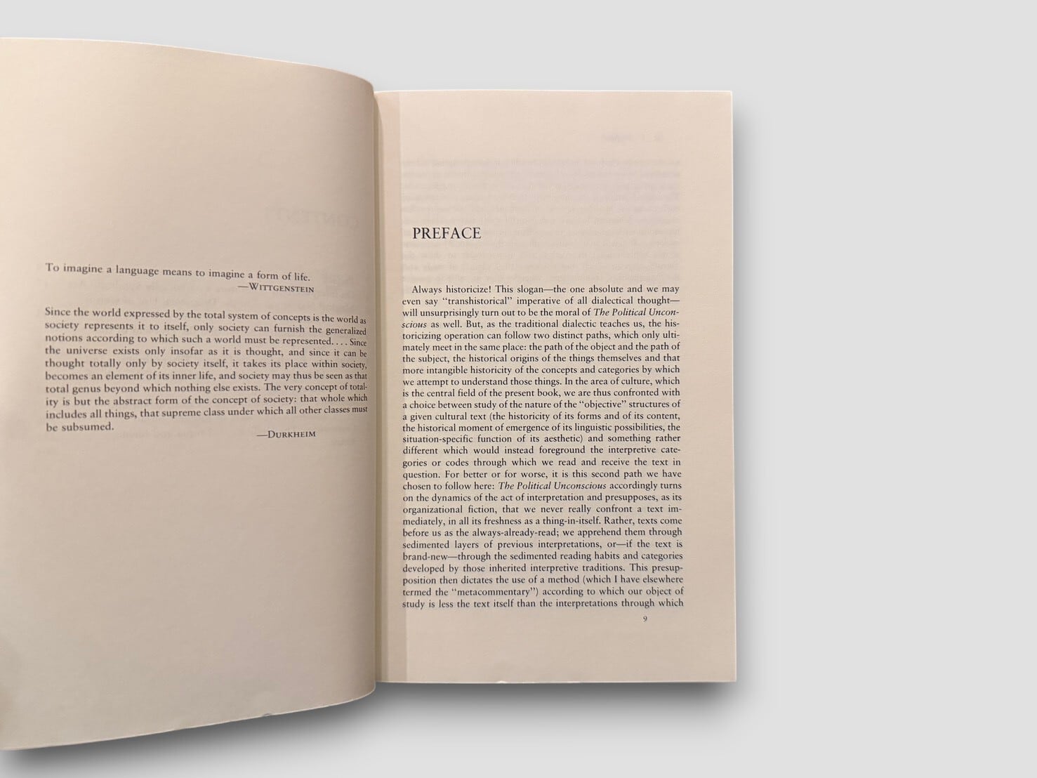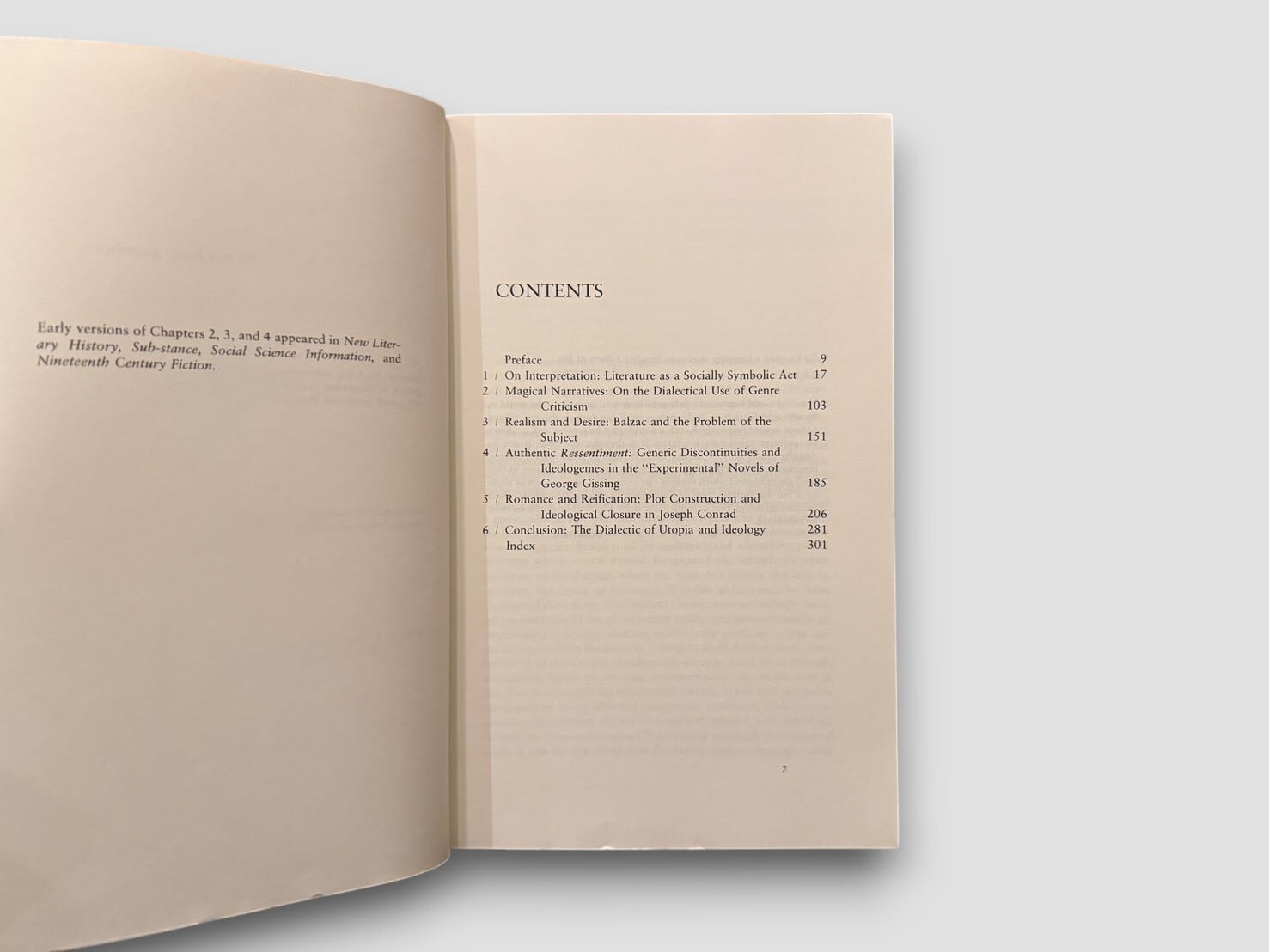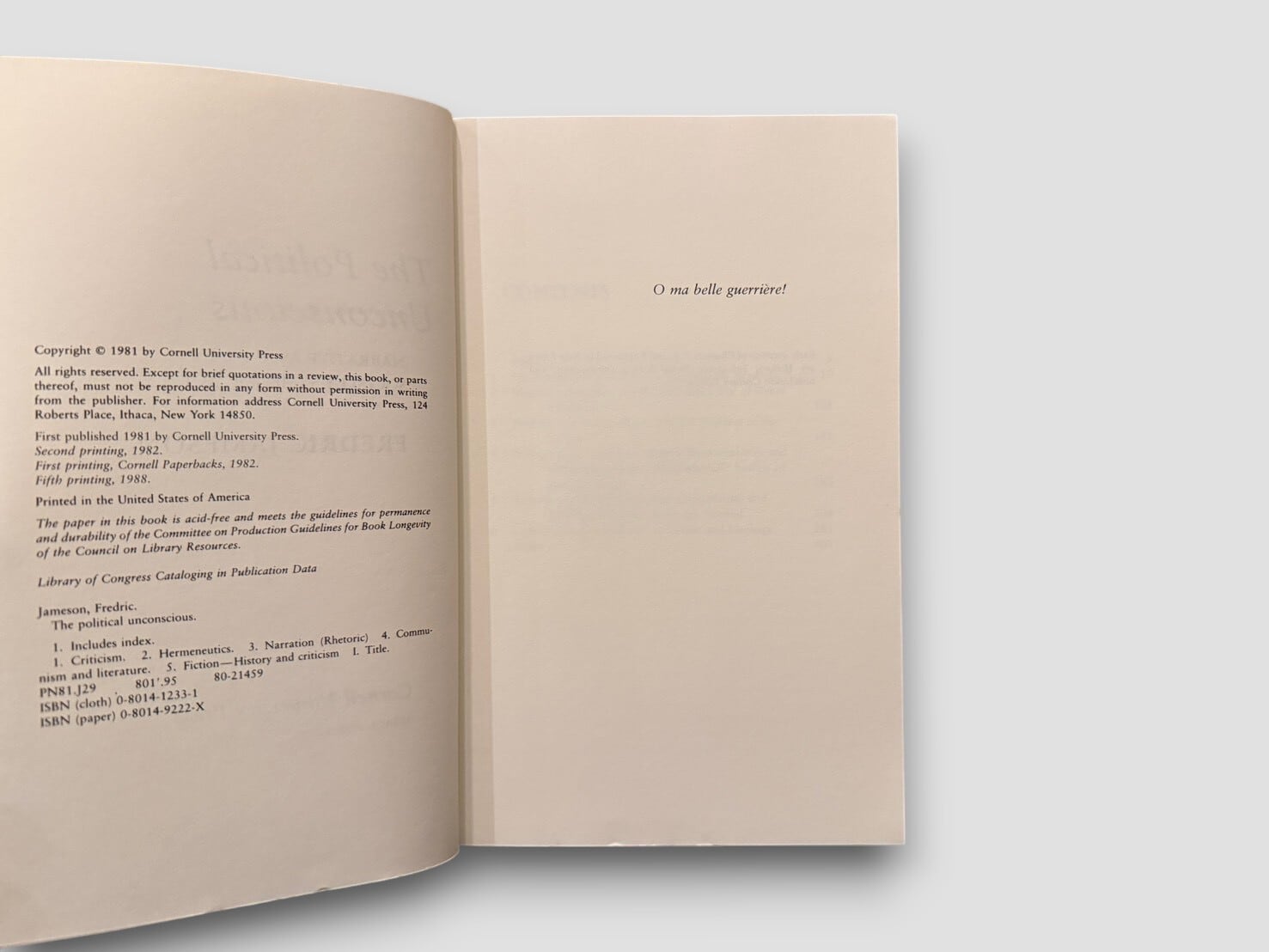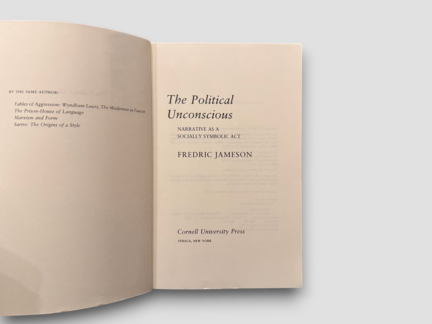 アメリカの文学理論家フレドリック・ジェイムソンによるマルクス主義文学批評に基づく文学理論書。本書は文学作品を歴史的文脈とイデオロギーの関係から読むことを前提に、物語を「社会的象徴行為」として捉える視点を提示する。初版1981年の内容を継続するコーネル・ペーパーバックス版。1988年刊行。