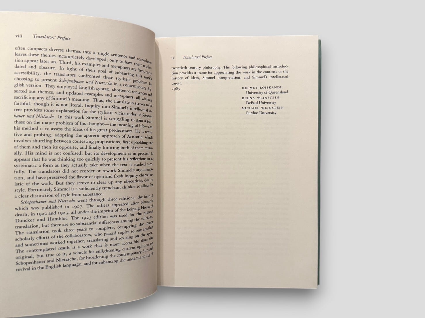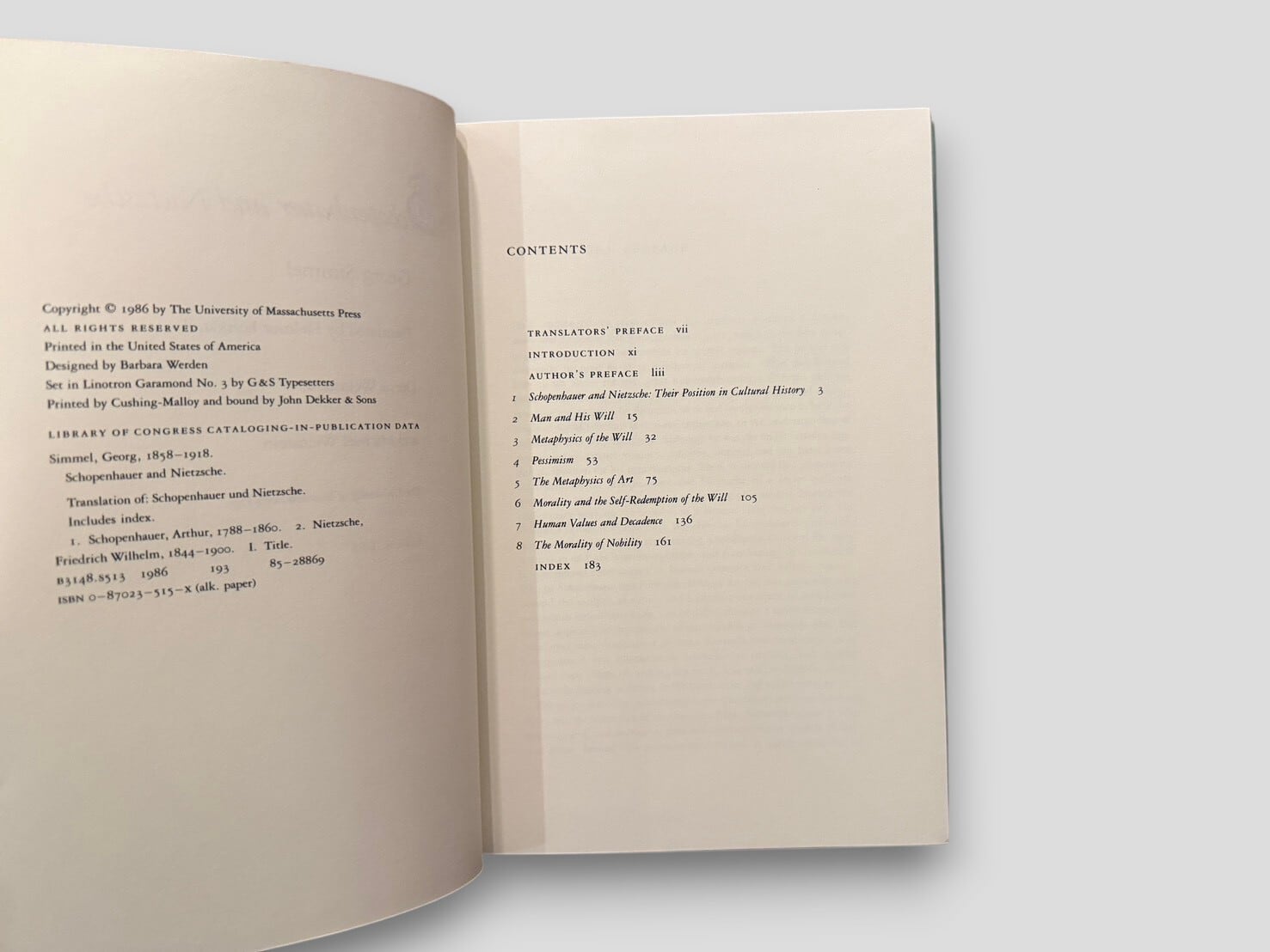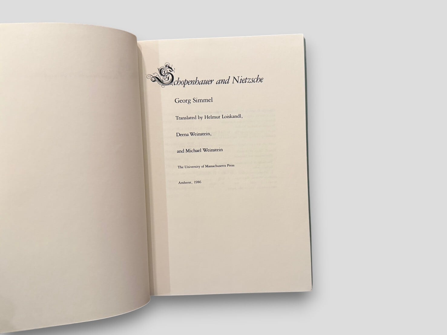 This book, Schopenhauer and Nietzsche by Georg Simmel, is translated by Helmut Loiskandl, Deena Weinstein, and Michael Weinstein, and published by The University of Massachusetts Press (Amherst). This edition was published in 1986, based on the original German work.