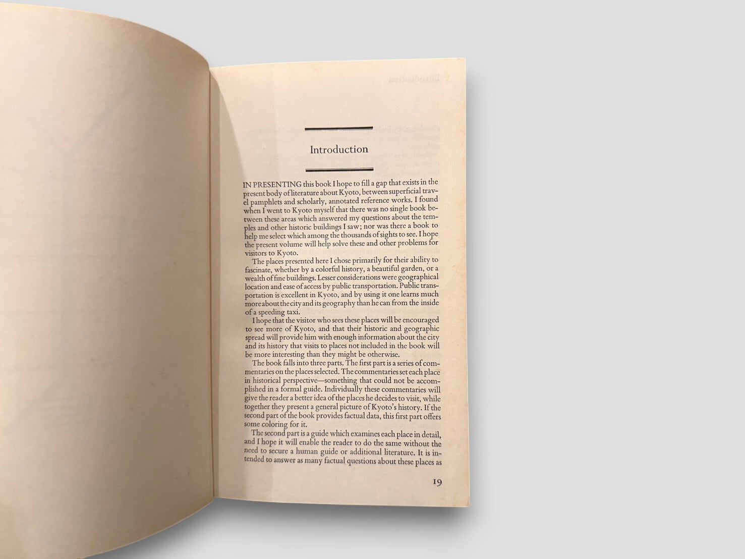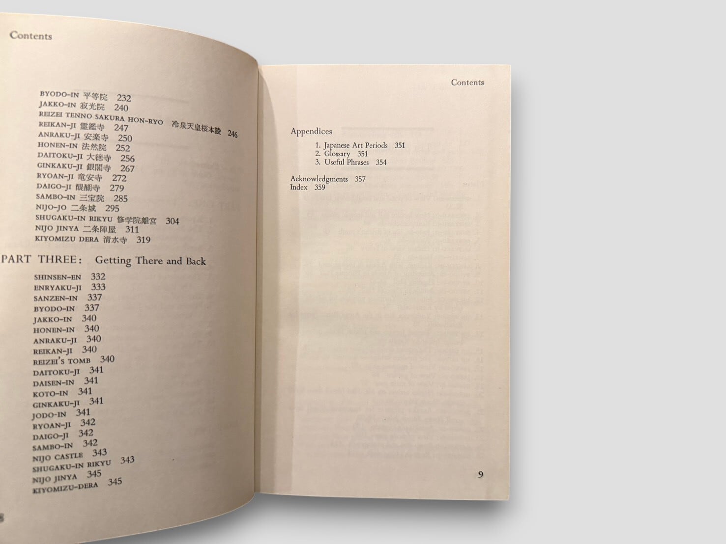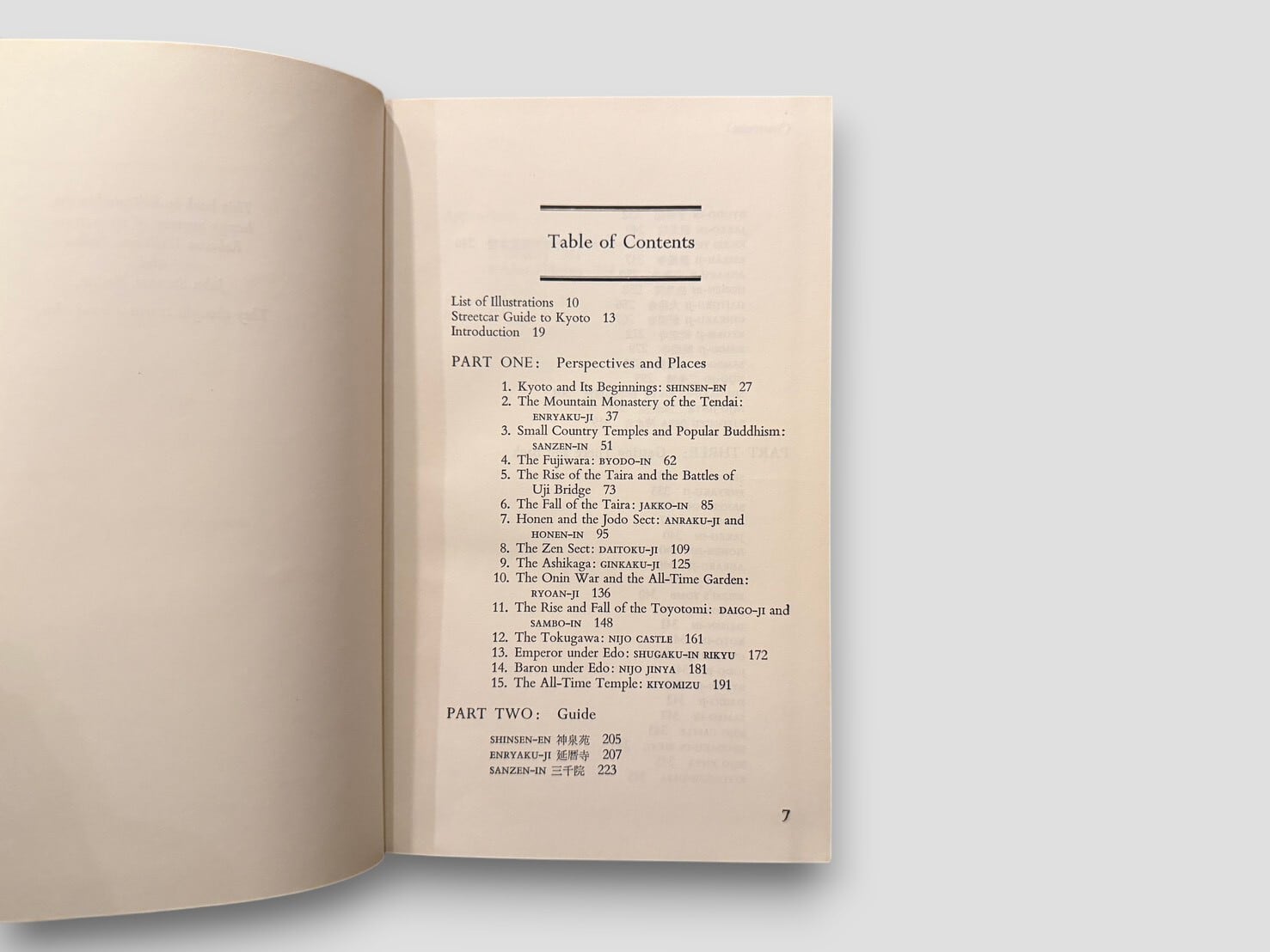 This book is a descriptive and interpretive guide to Kyoto, presenting historical sites together with their cultural and historical context. It is organized into three parts, including "Perspectives and Places", "Guide", and "Getting There and Back", and includes maps, glossary, and index.